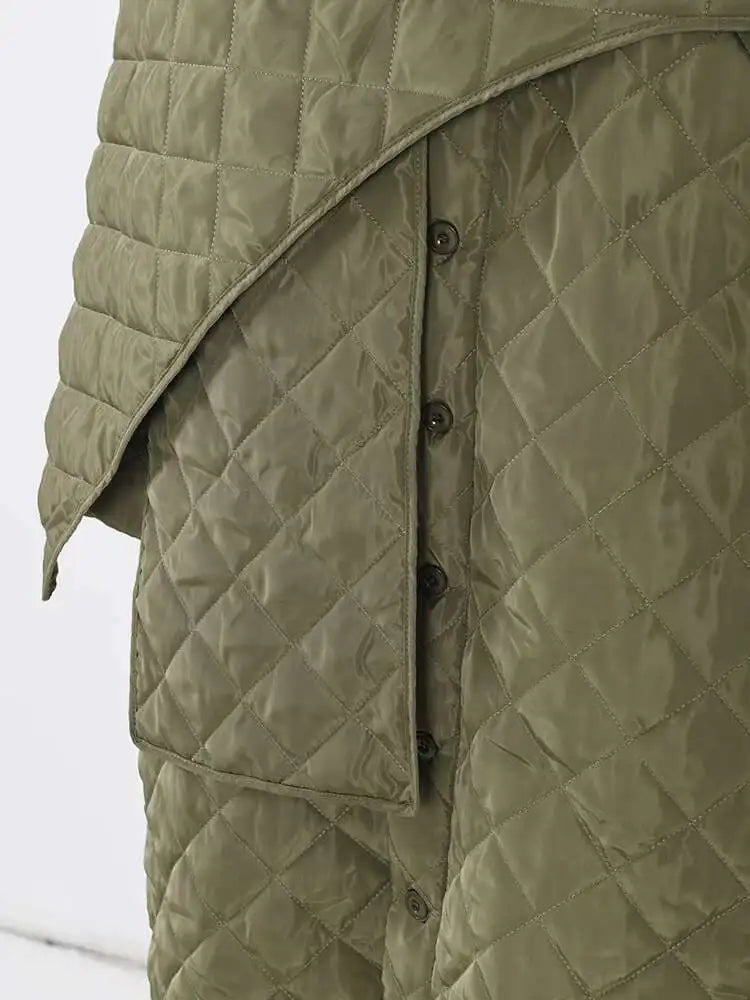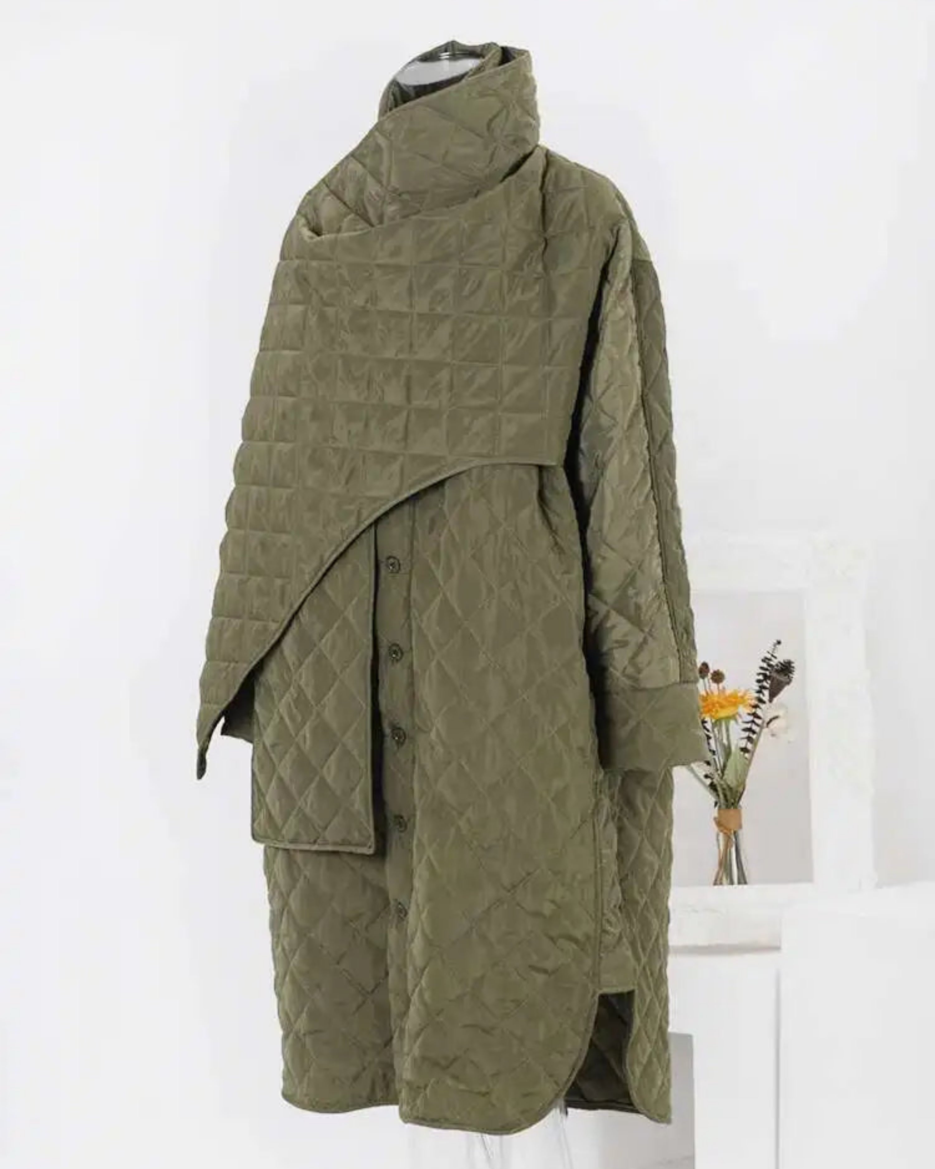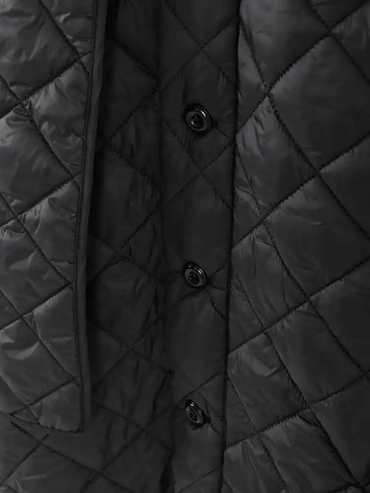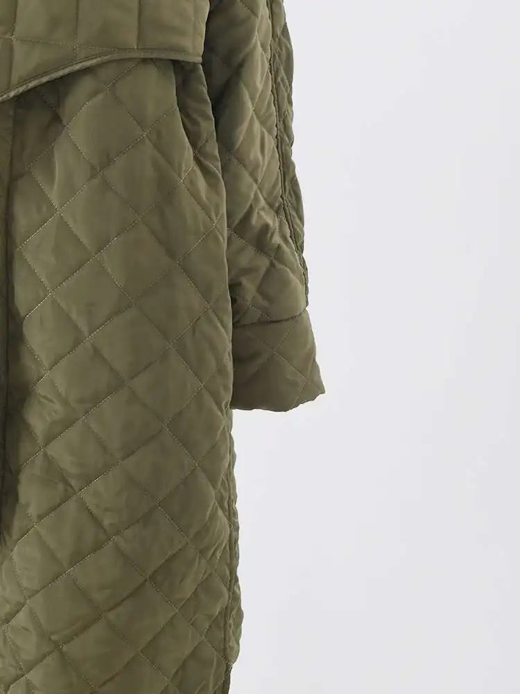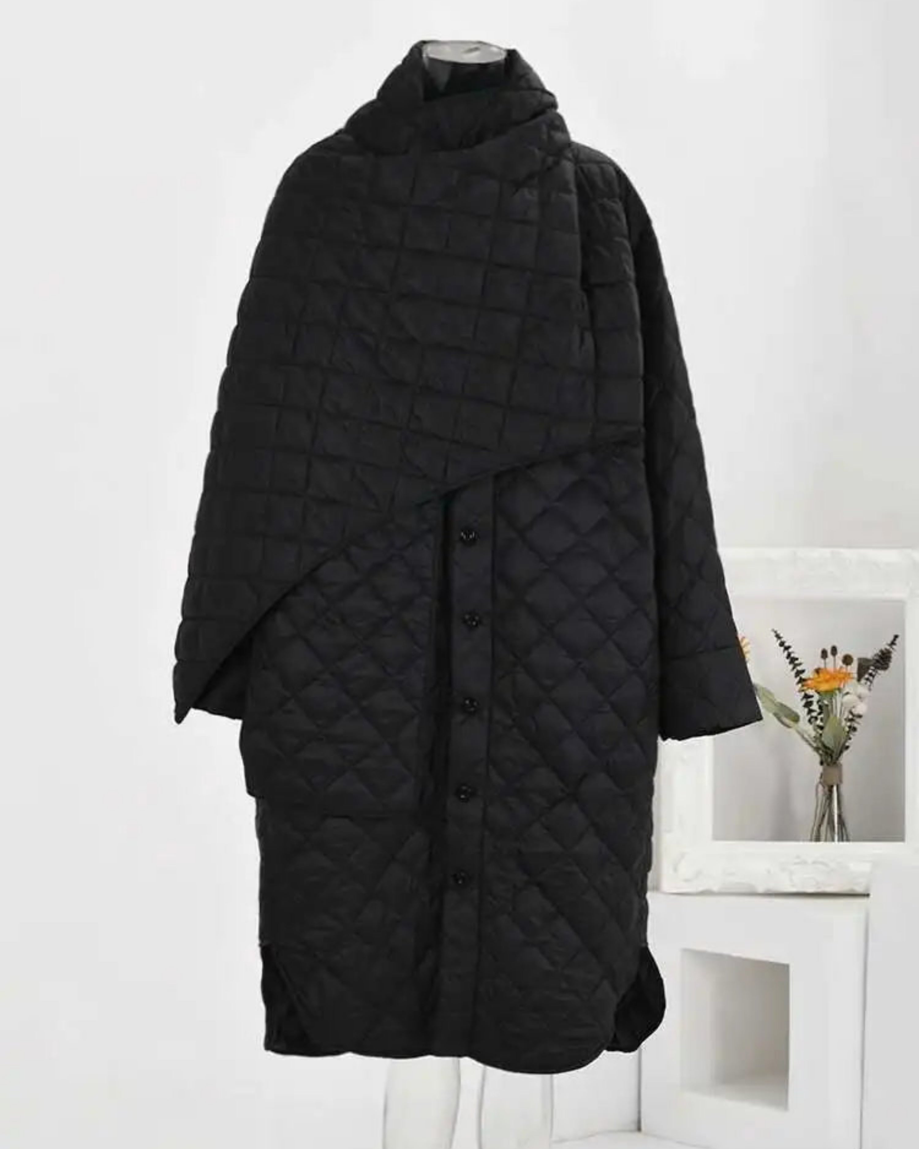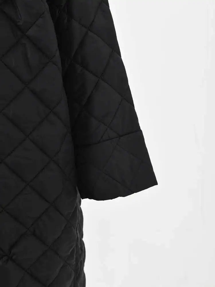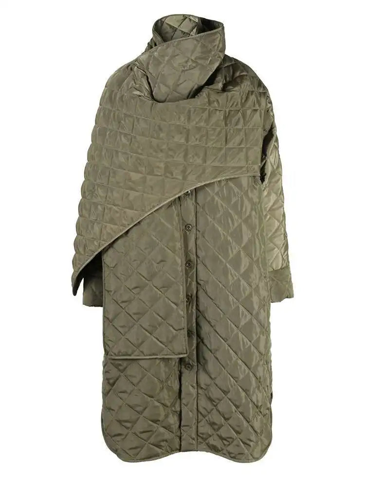 This diamond-quilted longline coat features premium fabric with an oversized scarf detail, offering warmth and a polished silhouette.