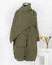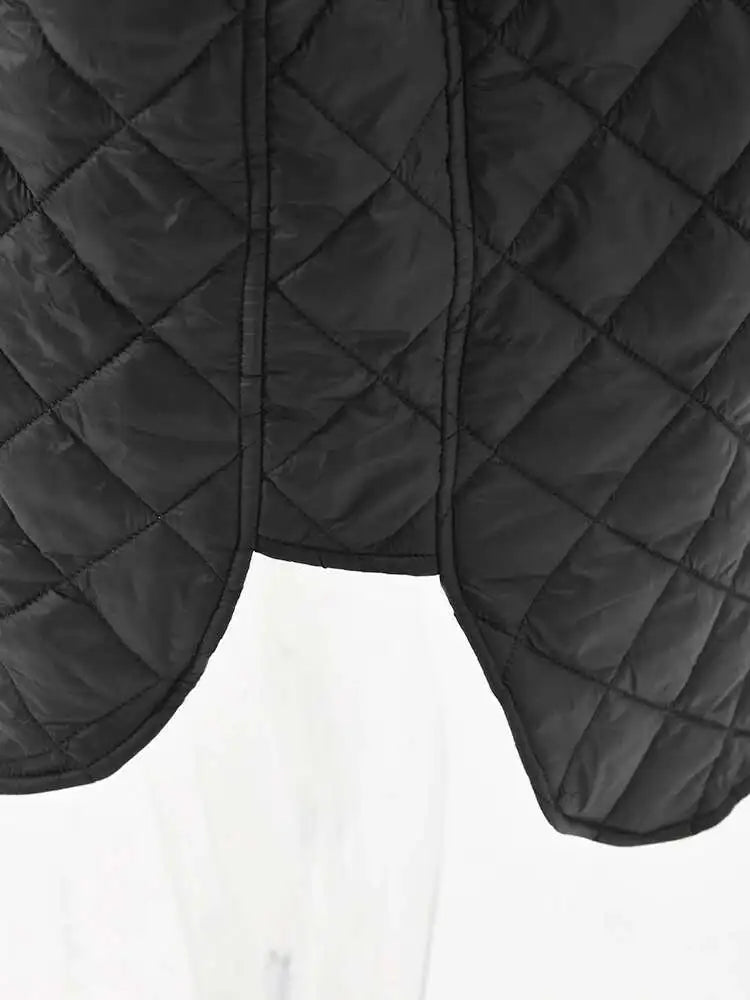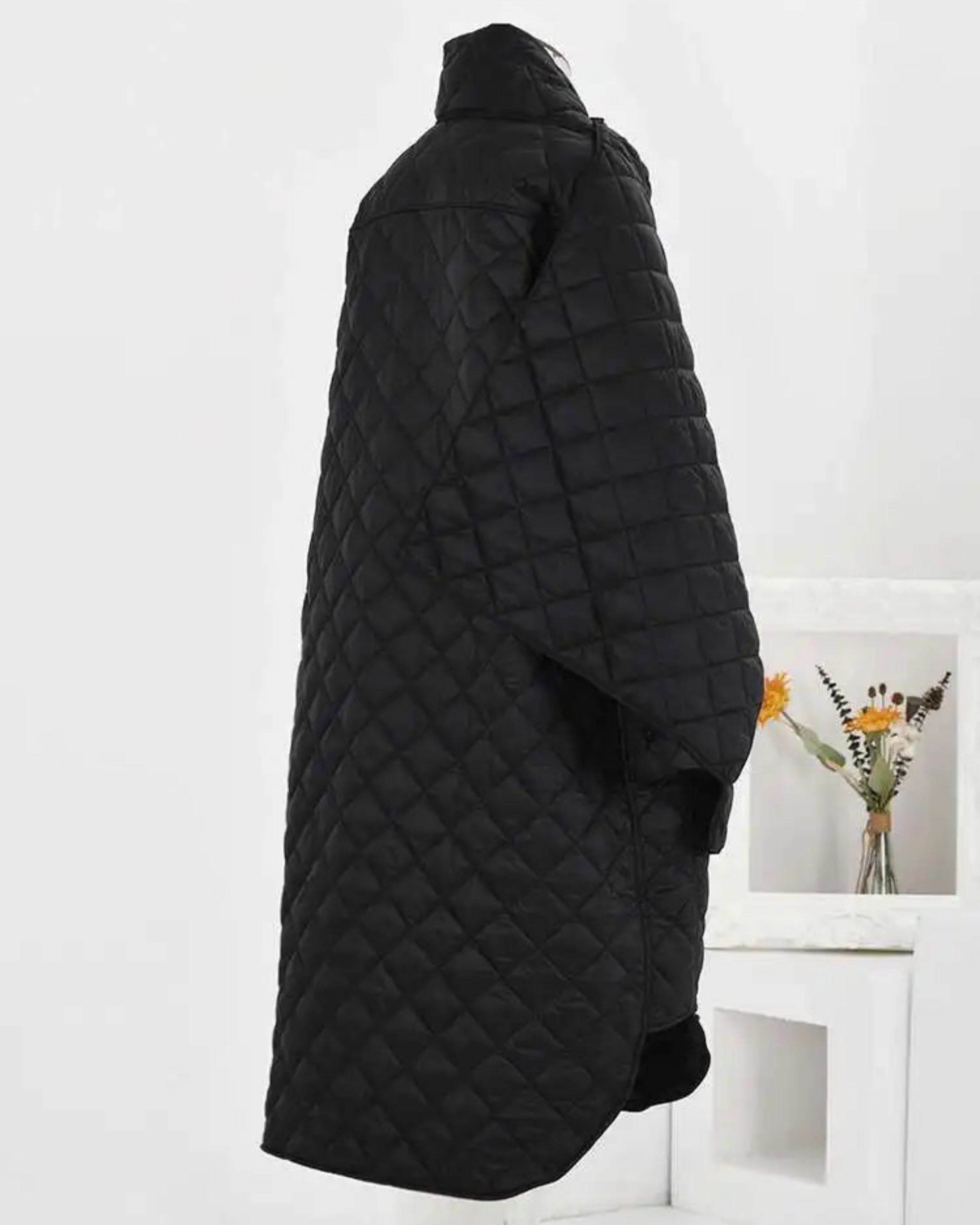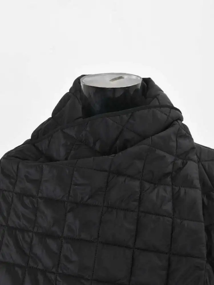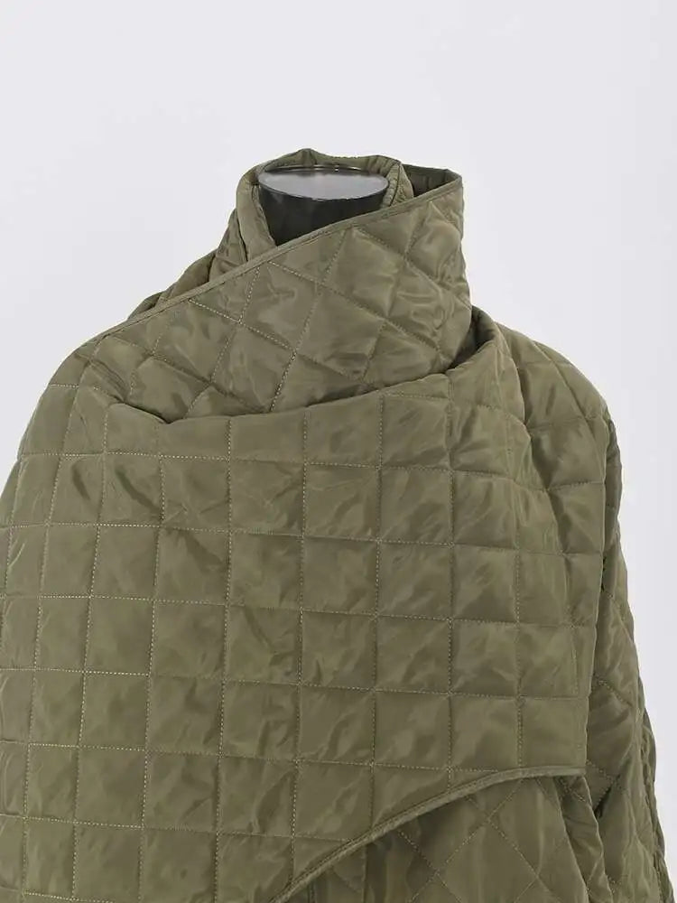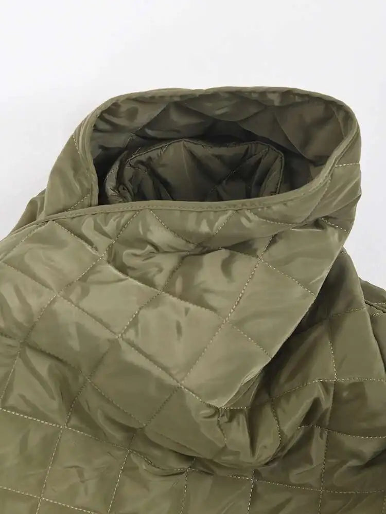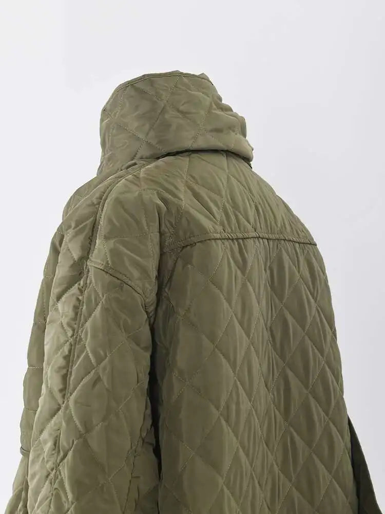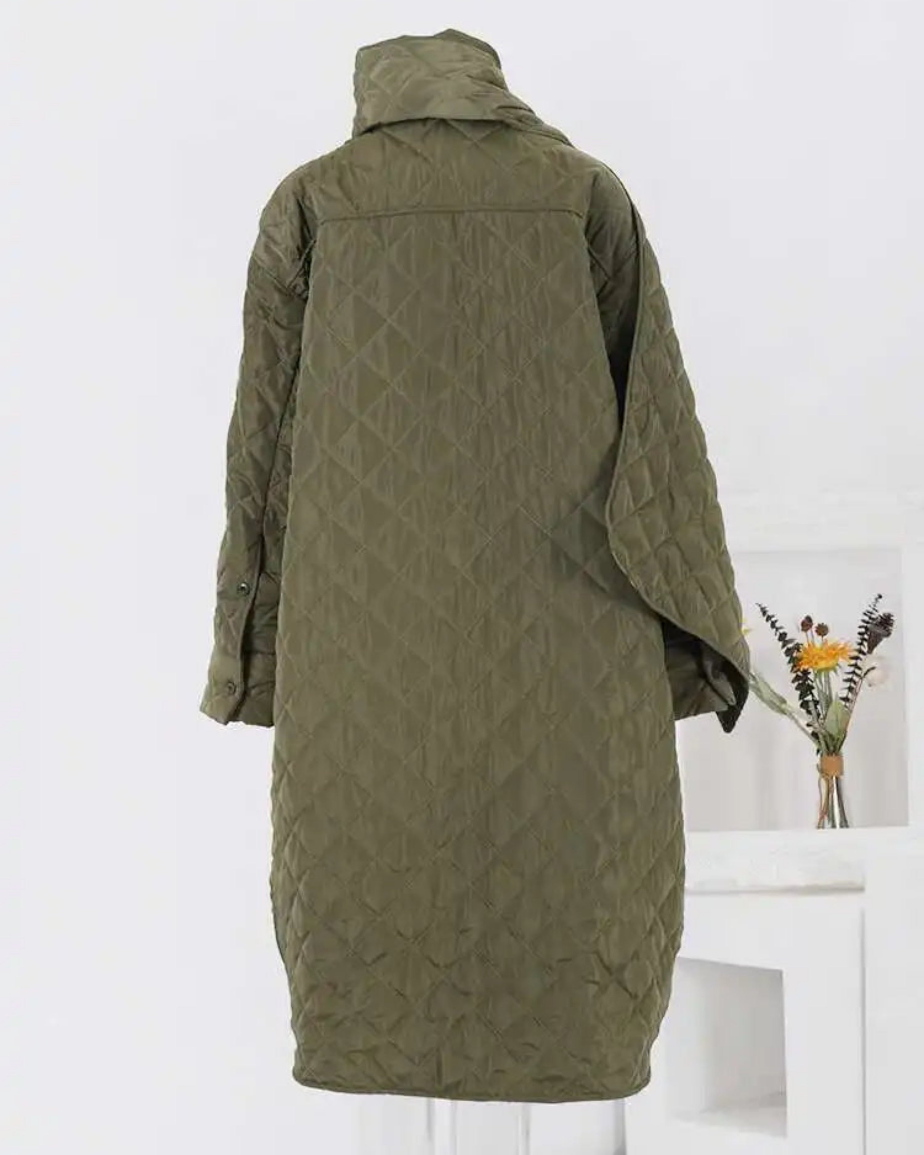 This diamond-quilted longline coat features premium fabric with an oversized scarf detail, offering warmth and a polished silhouette.