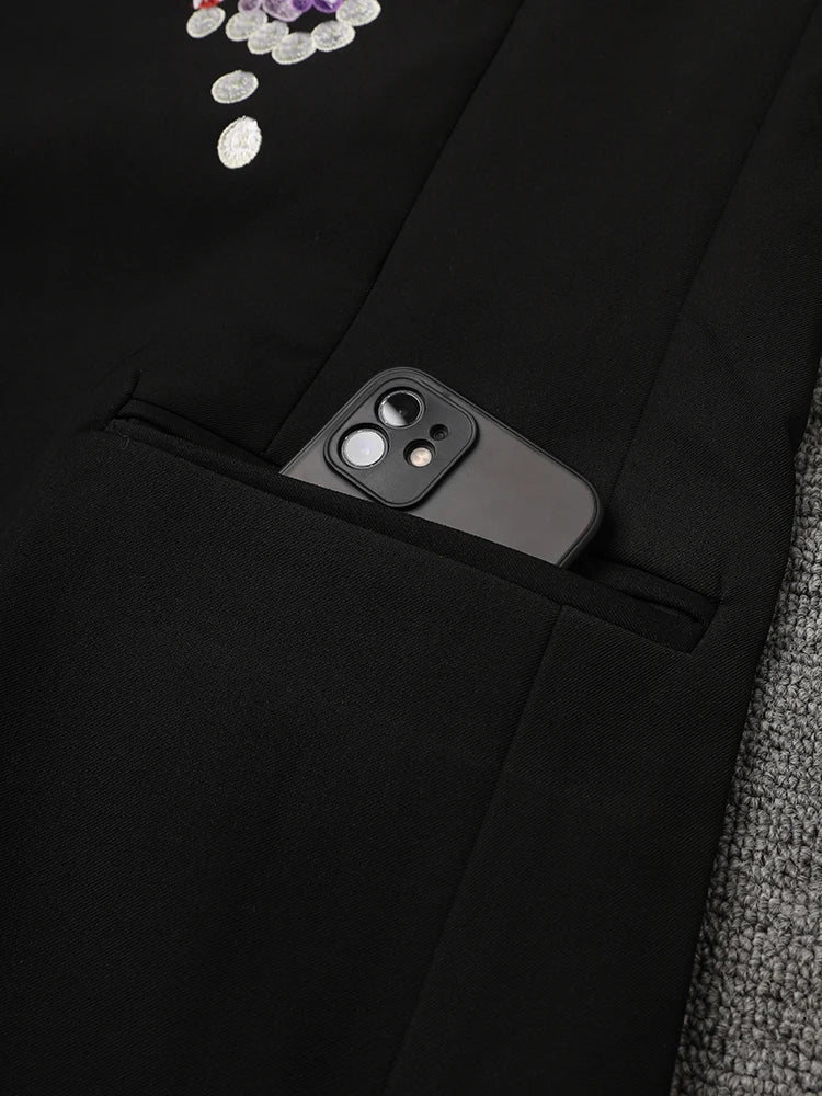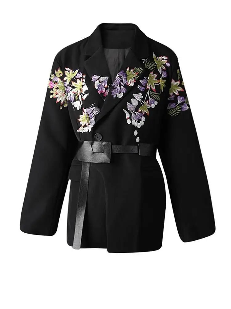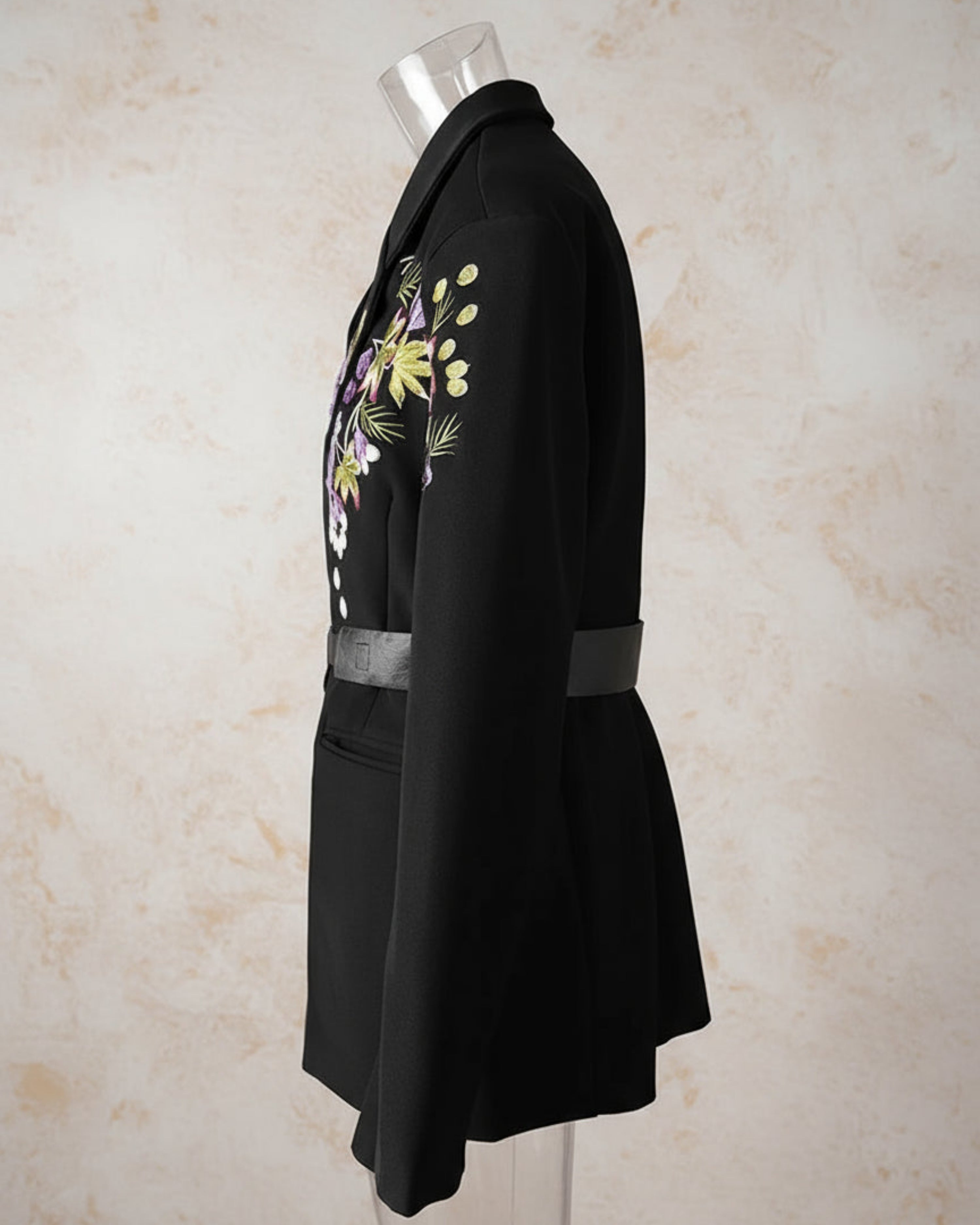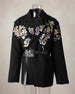 An oversized blazer with vibrant floral embroidery across shoulders and sleeves.