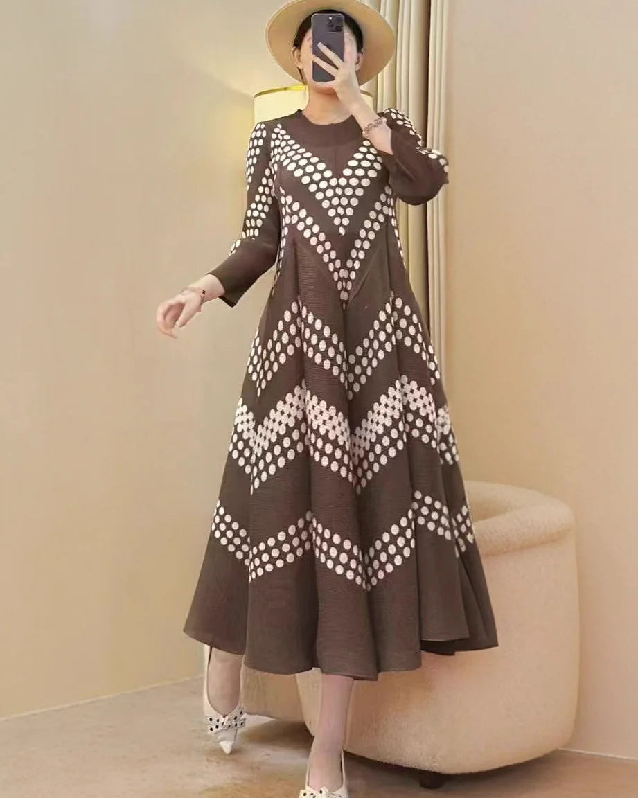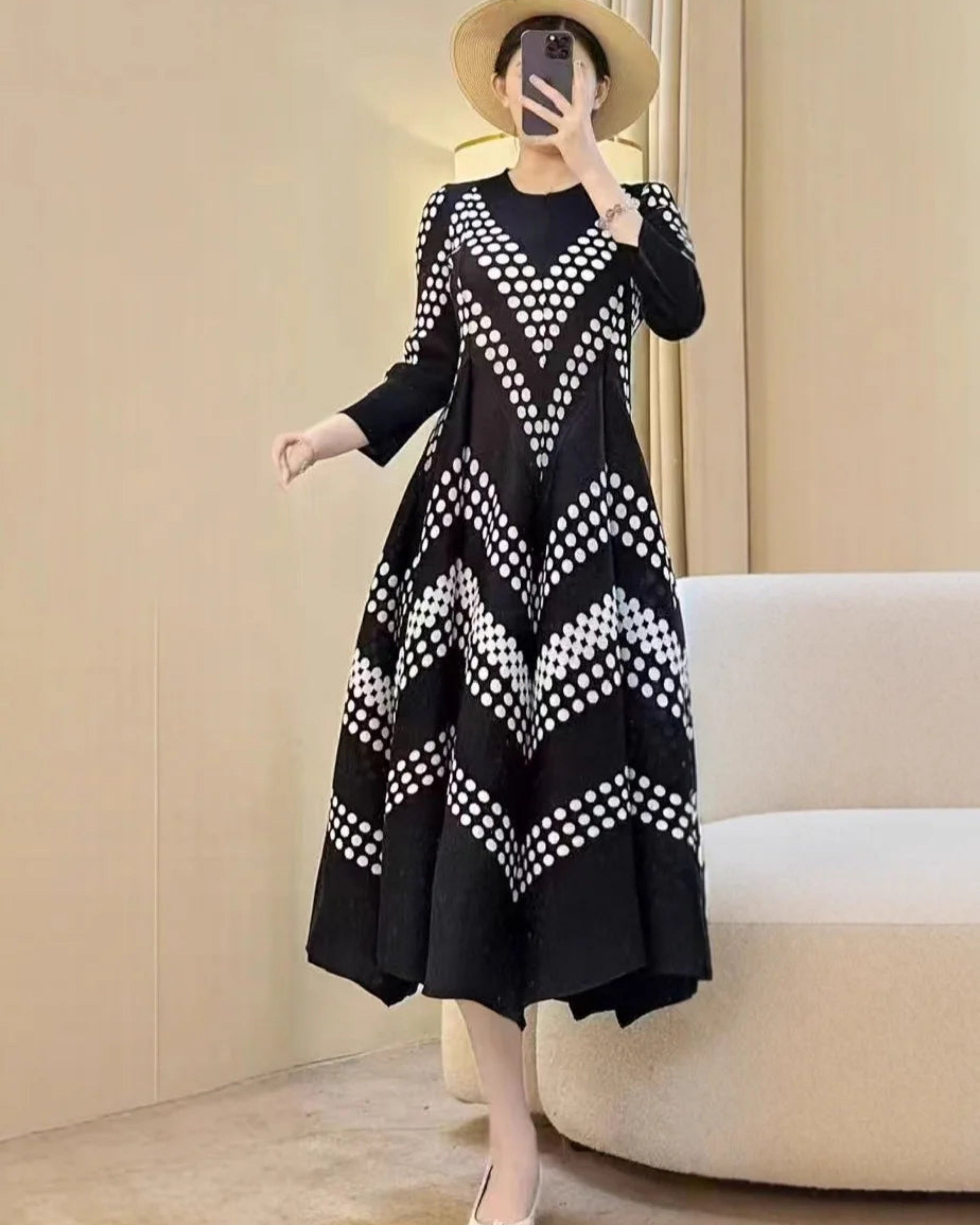This Japanese pleated midi dress features premium fabric with a flattering A-line silhouette and chic polka dot pattern.