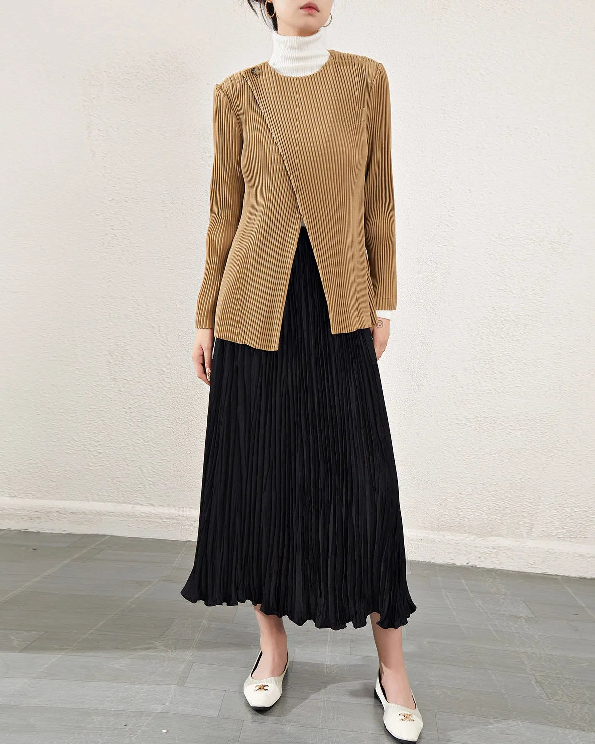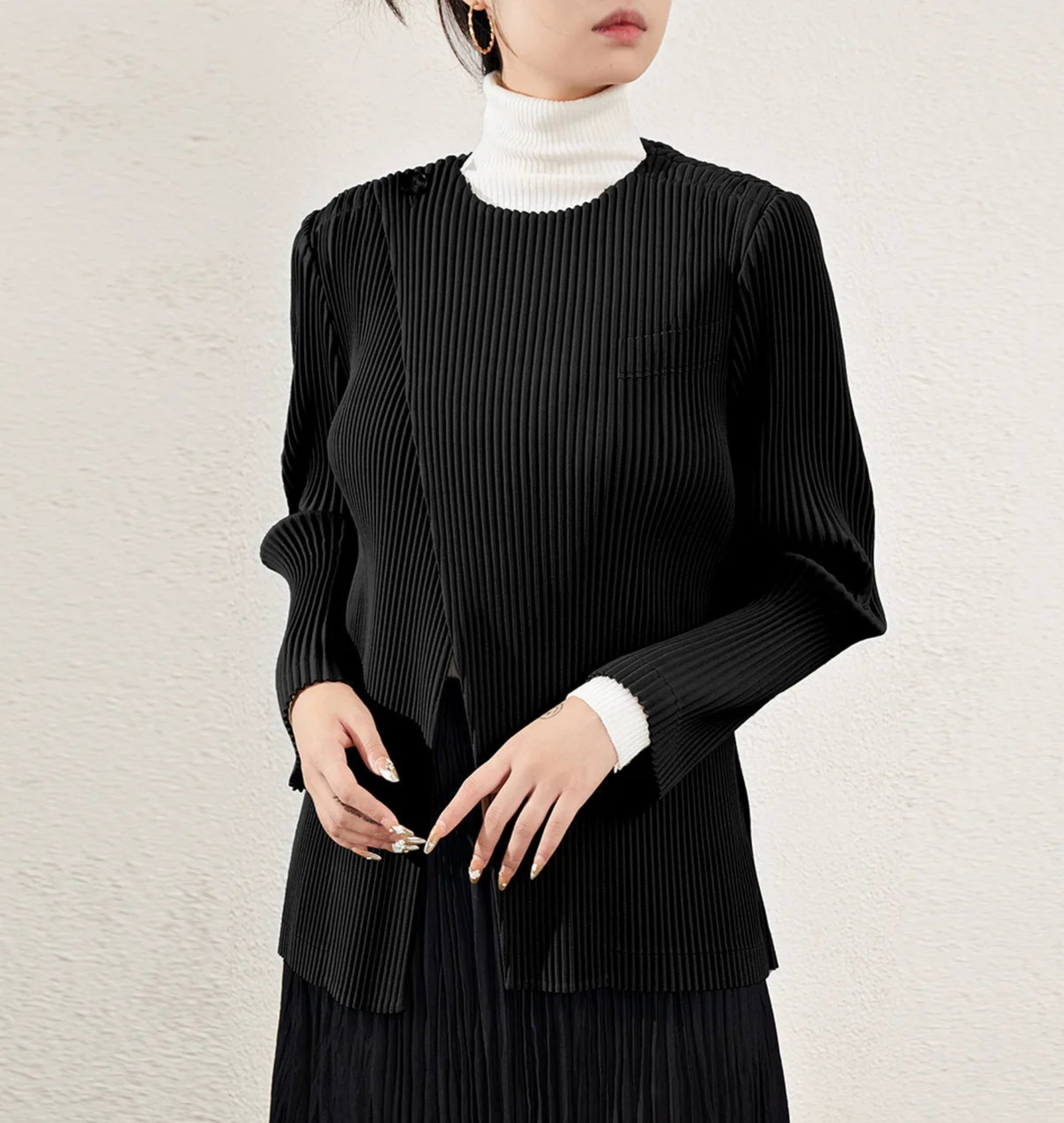 This premium pleated plissé long sleeve jacket flows with movement and shapes the silhouette.