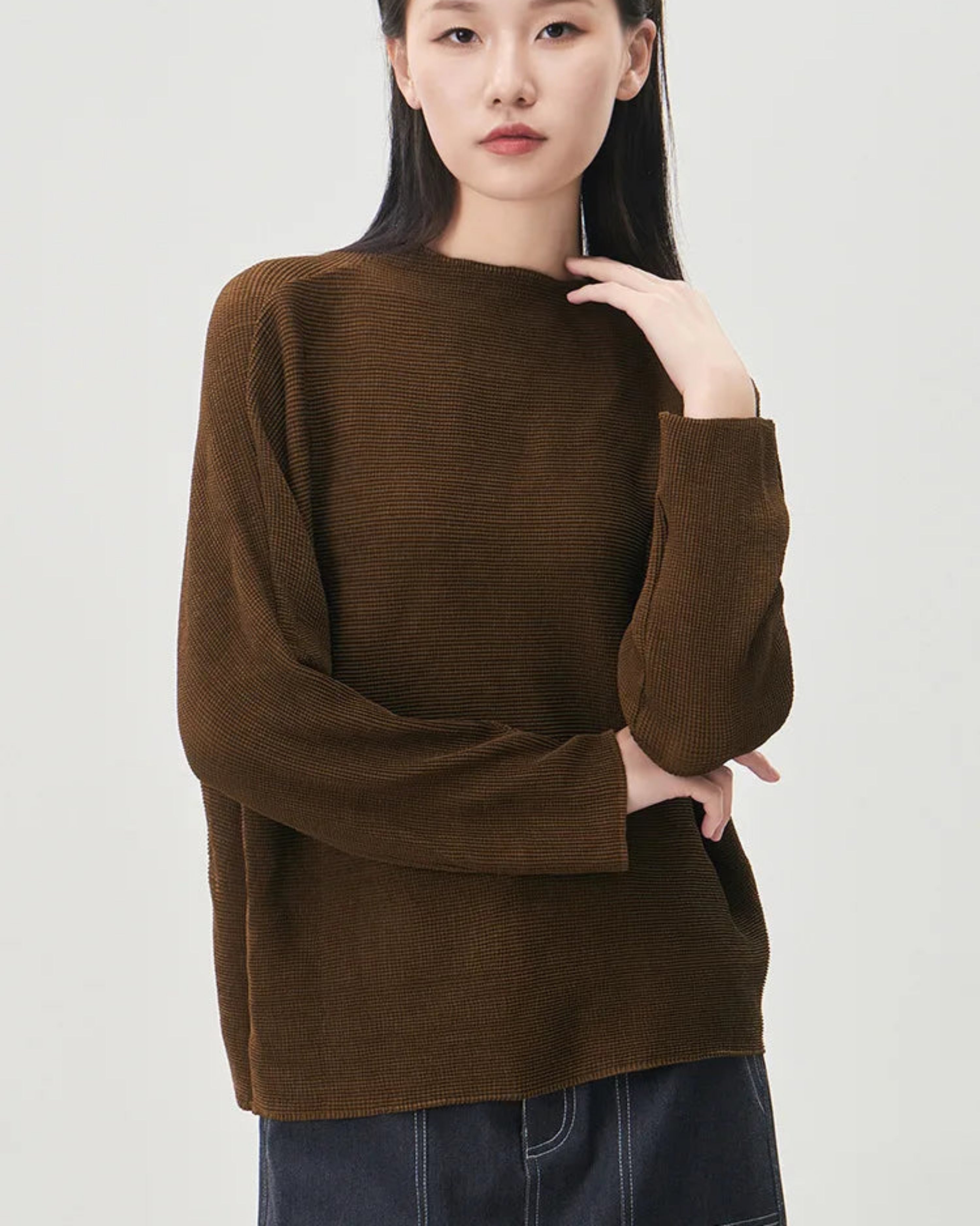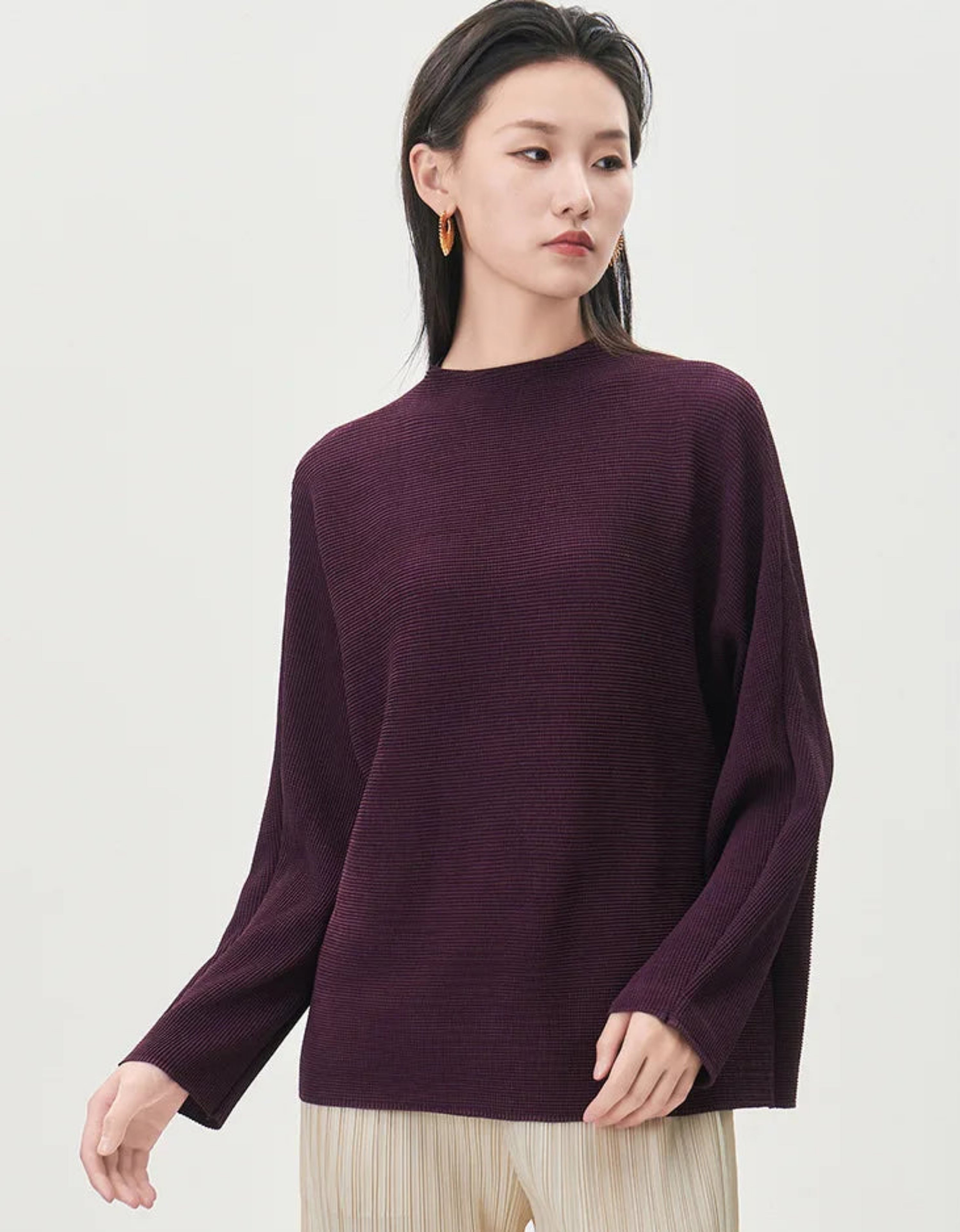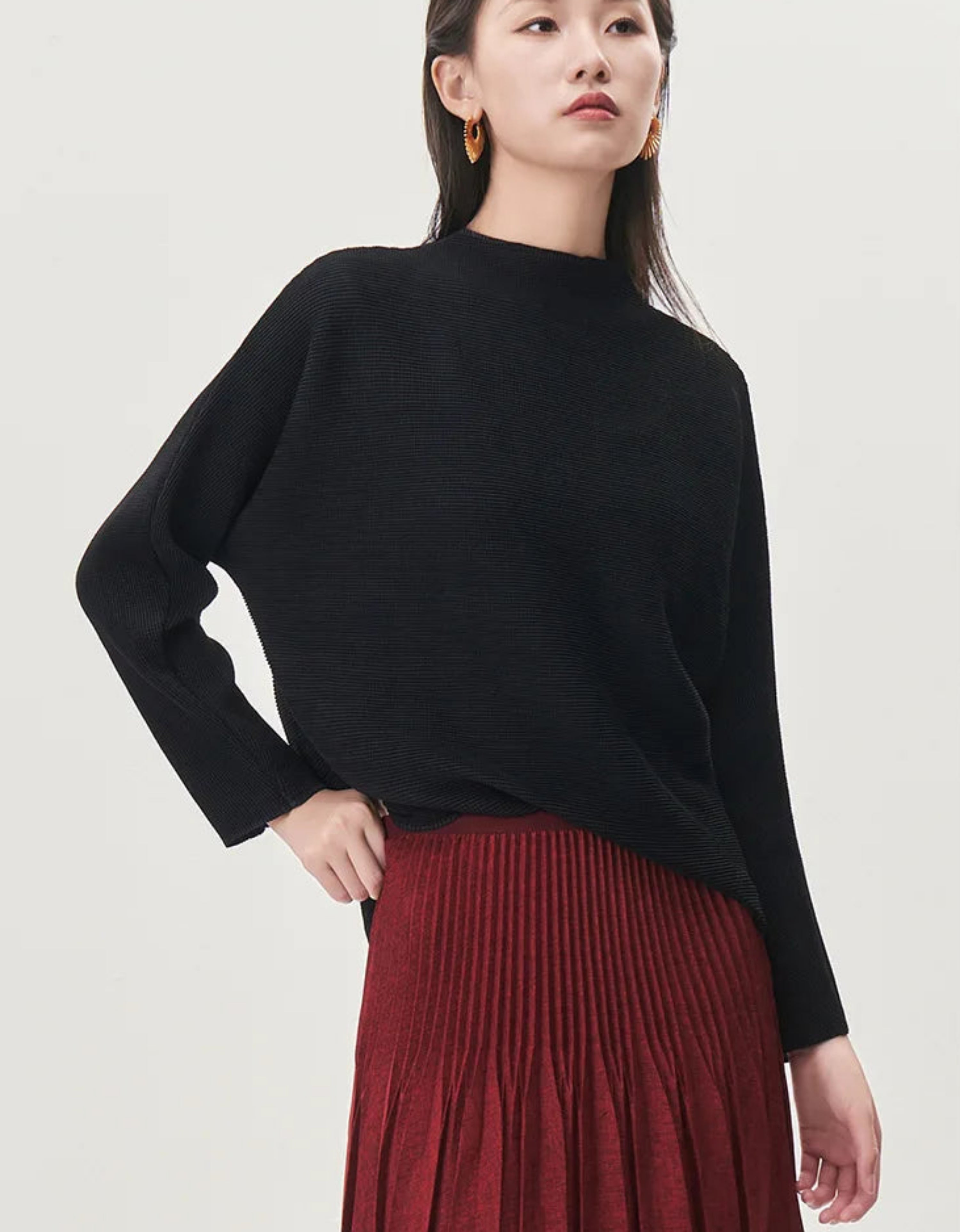 This luxury Japanese pleated sweater features a relaxed fit with long sleeves and a high neckline.