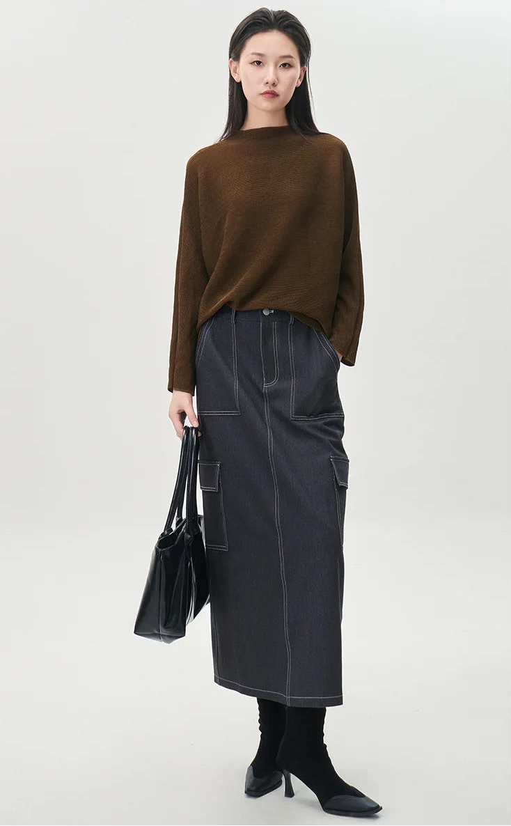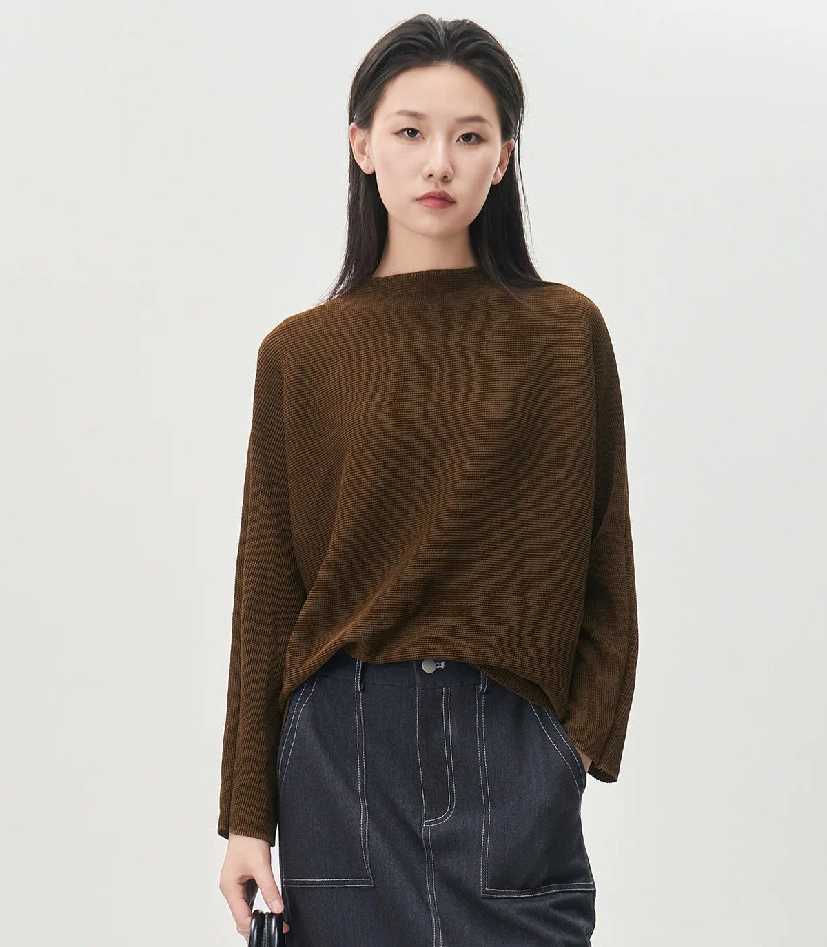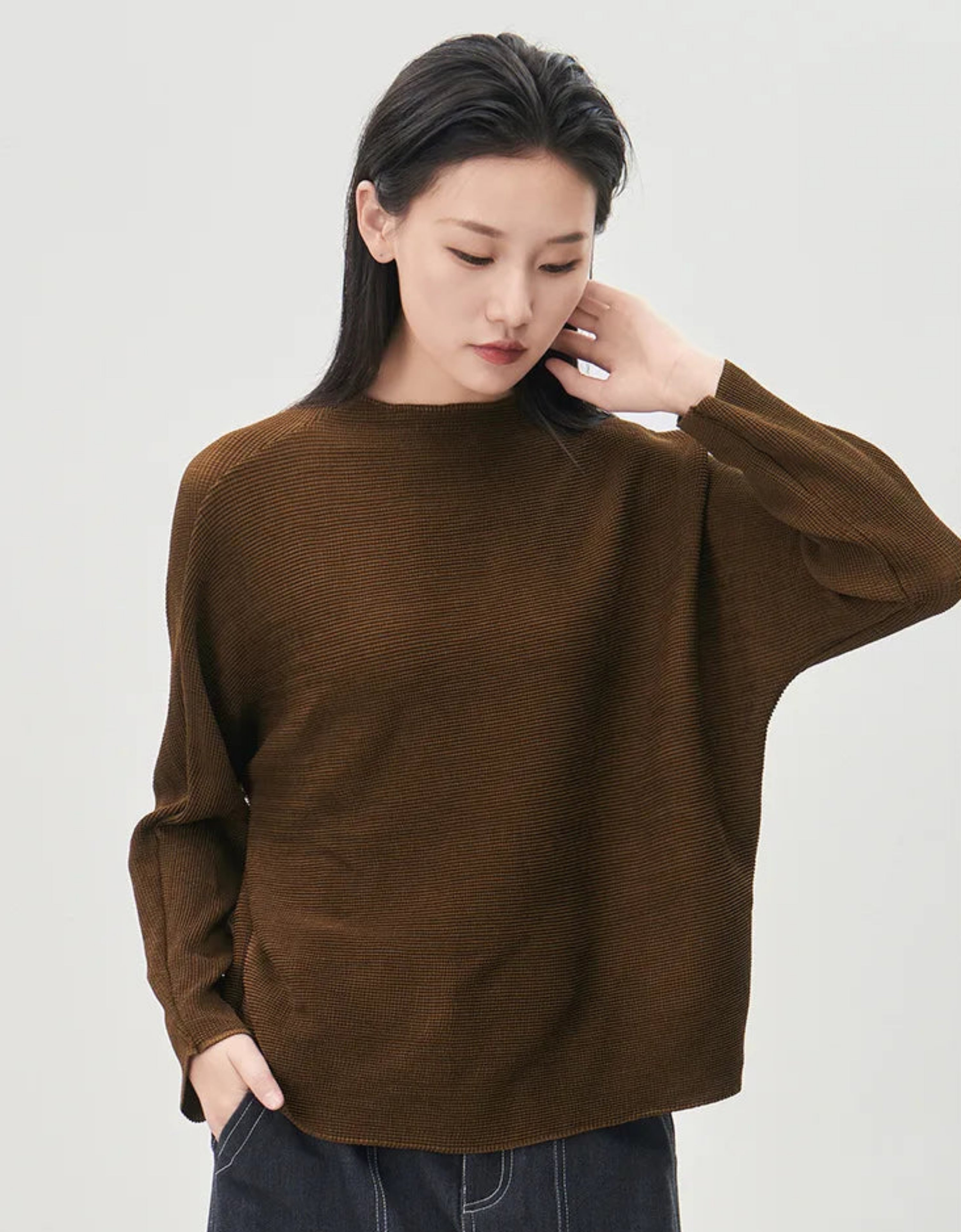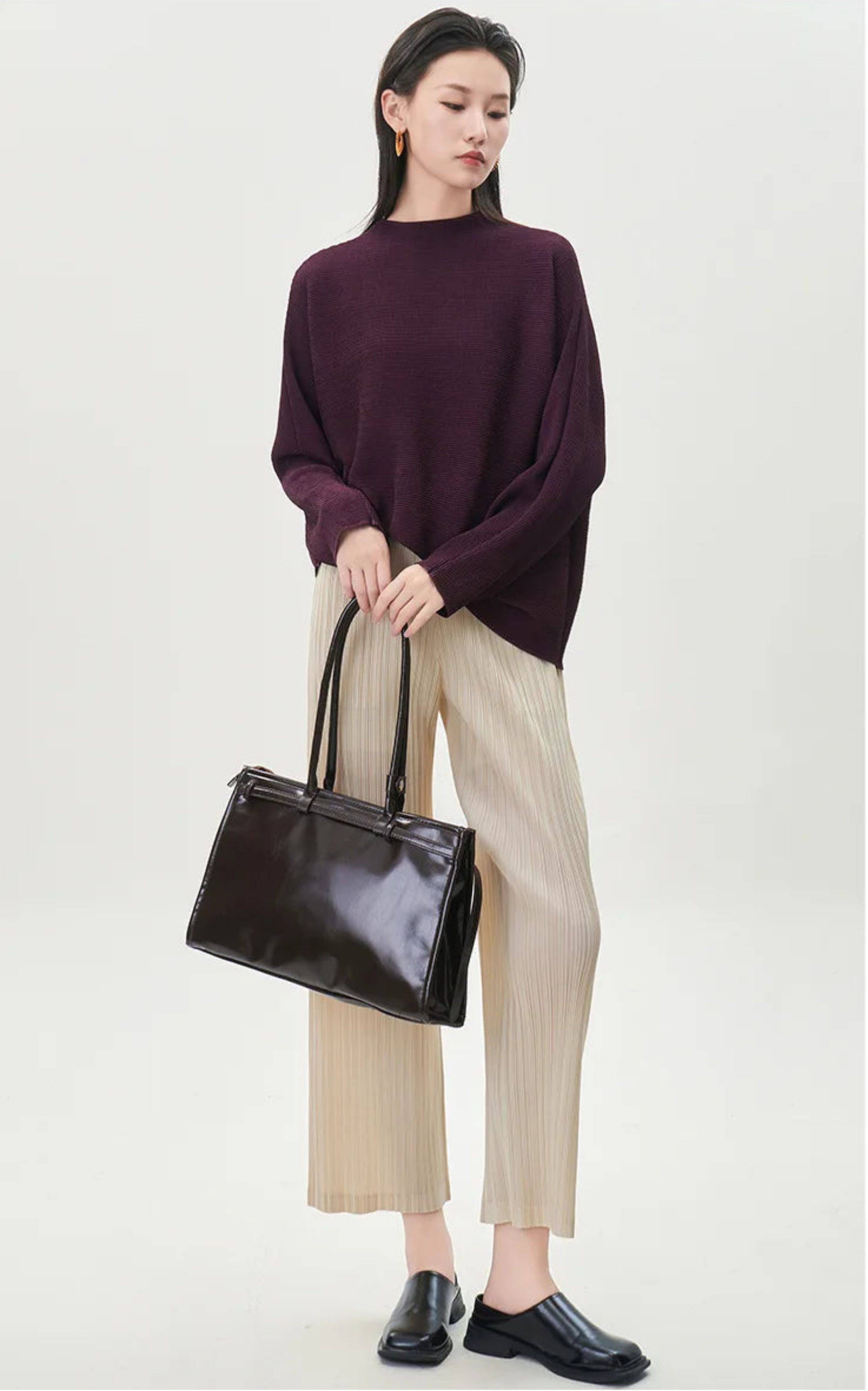 This luxury Japanese pleated sweater features a relaxed fit with long sleeves and a high neckline.