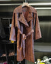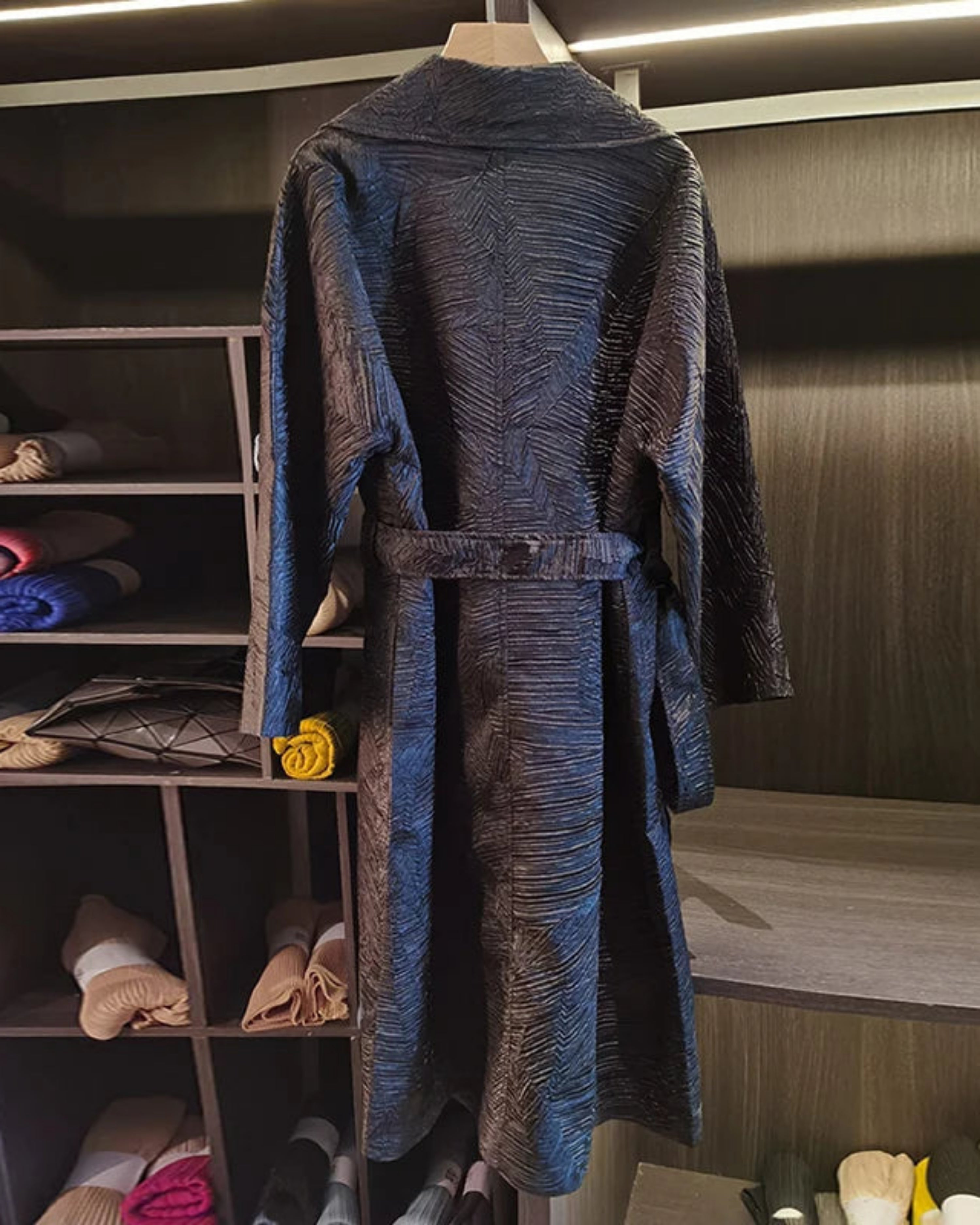 Elegant Japanese plissé duster trench coat with a crinkle pleated texture, long sleeves, and a self-tie belt.