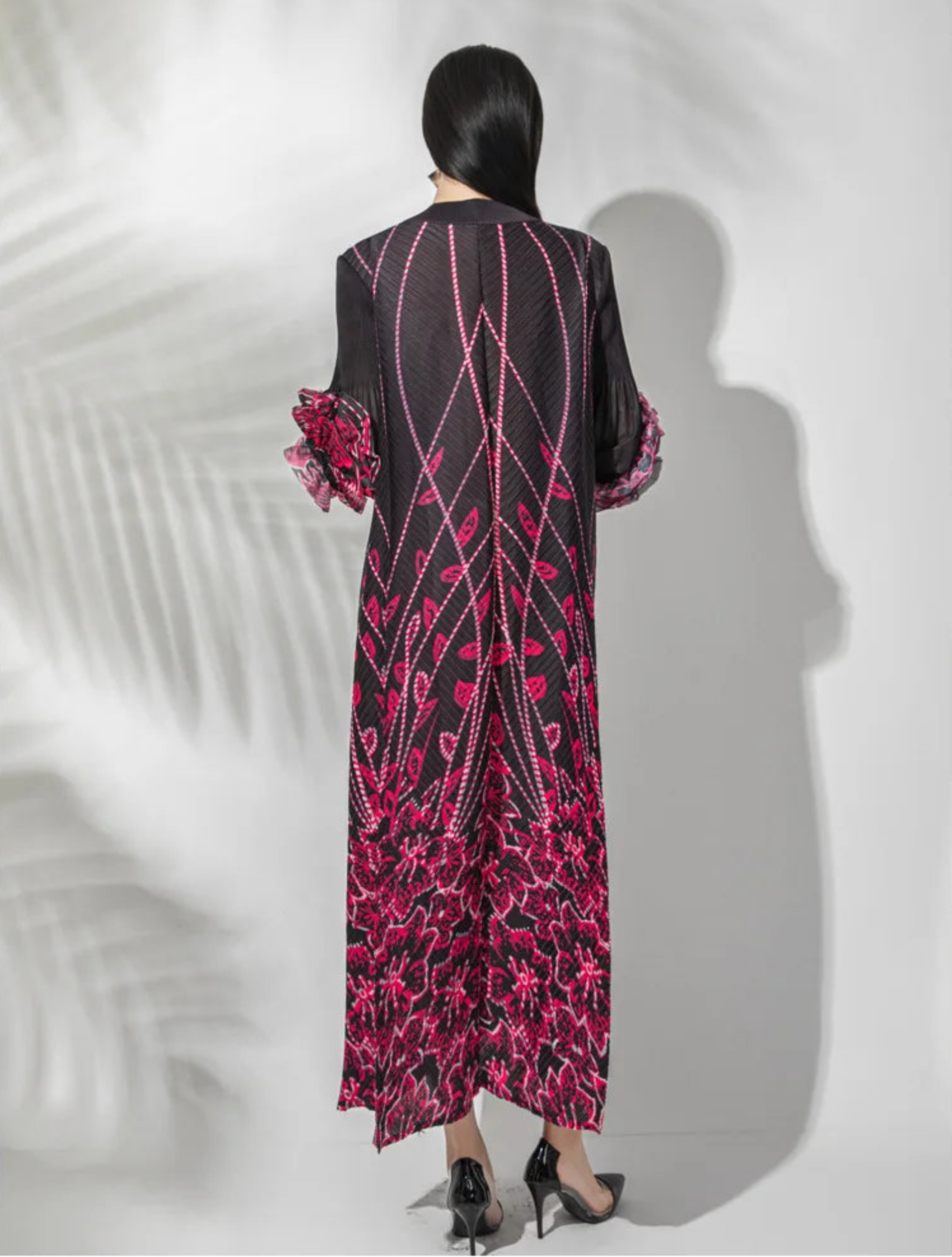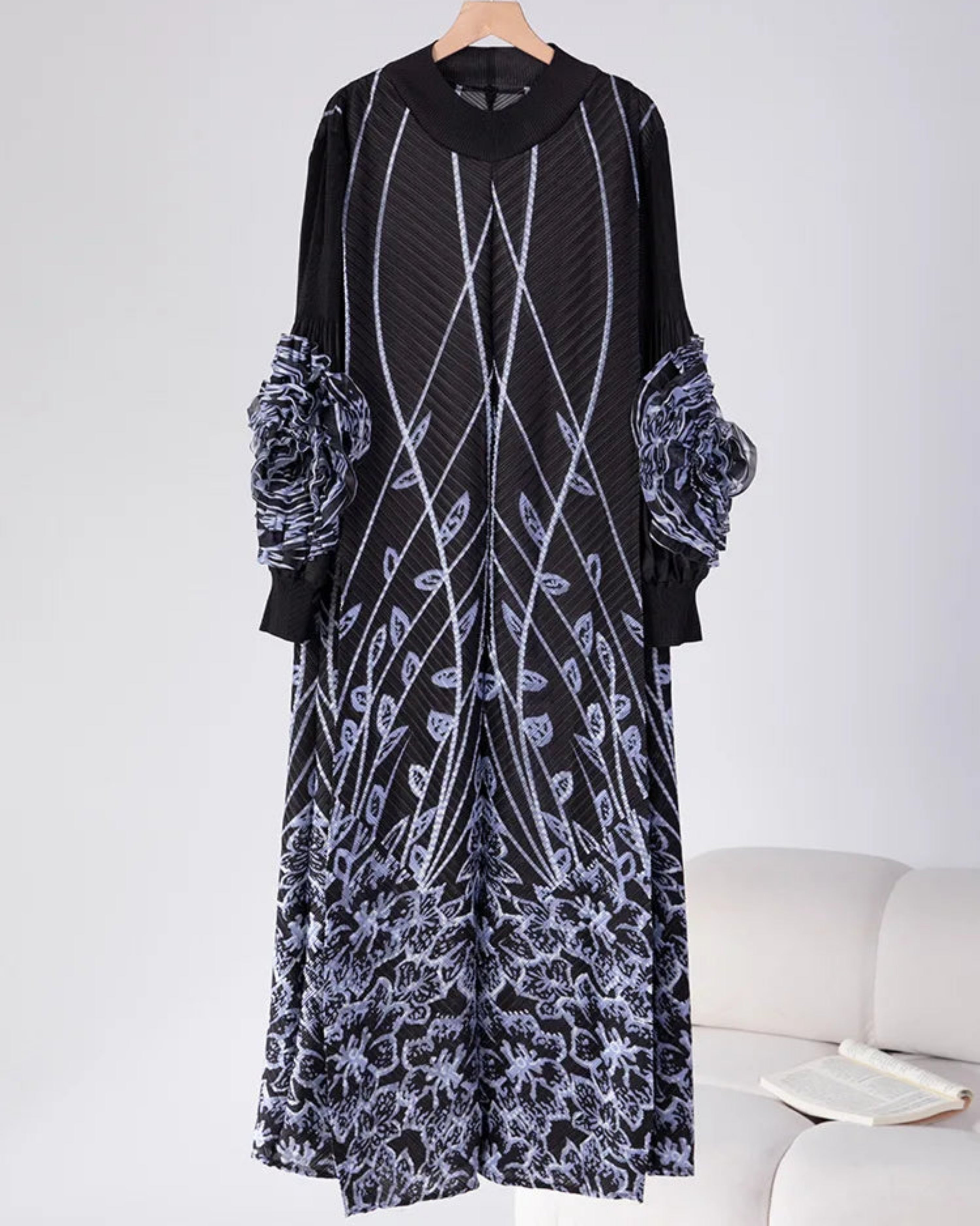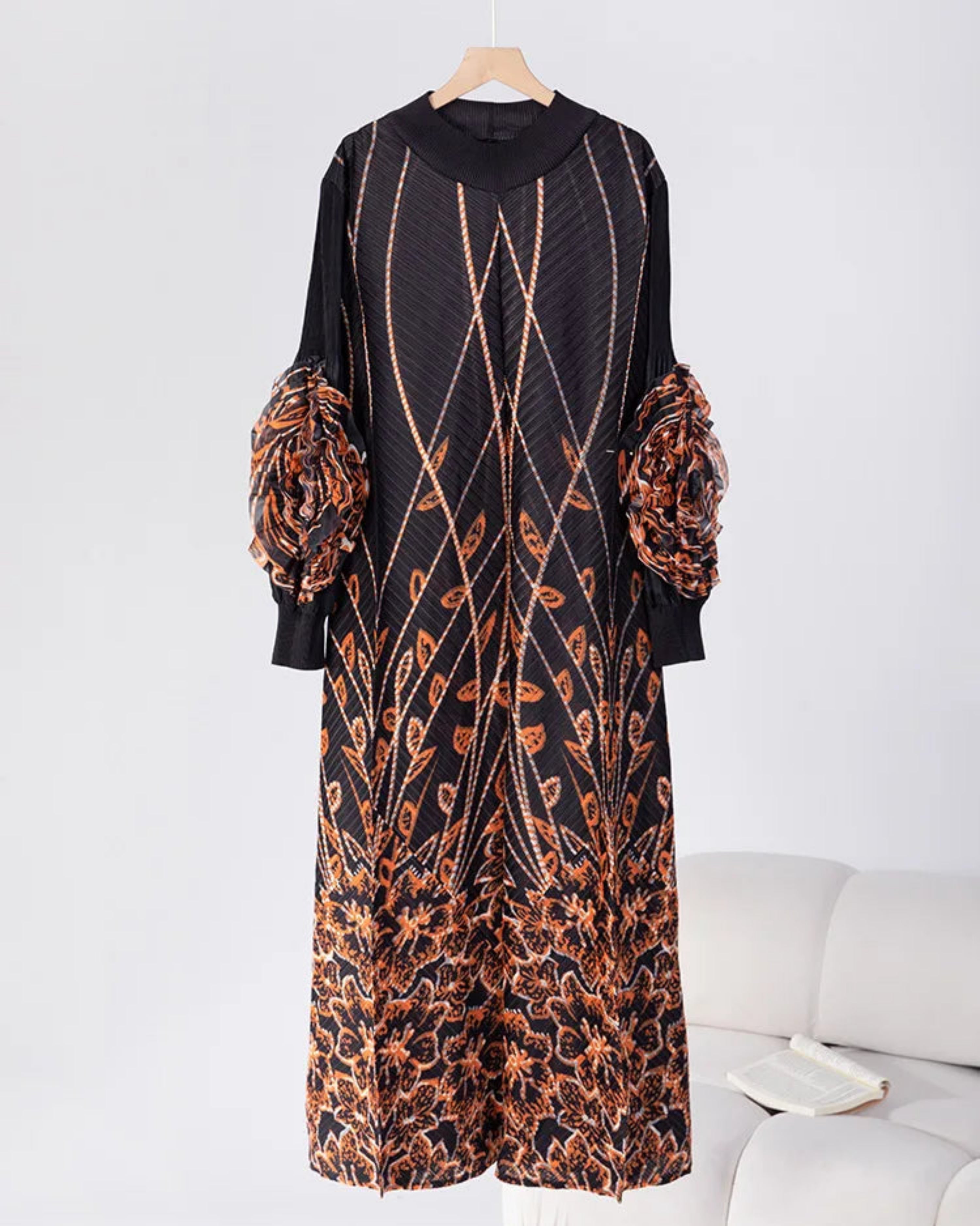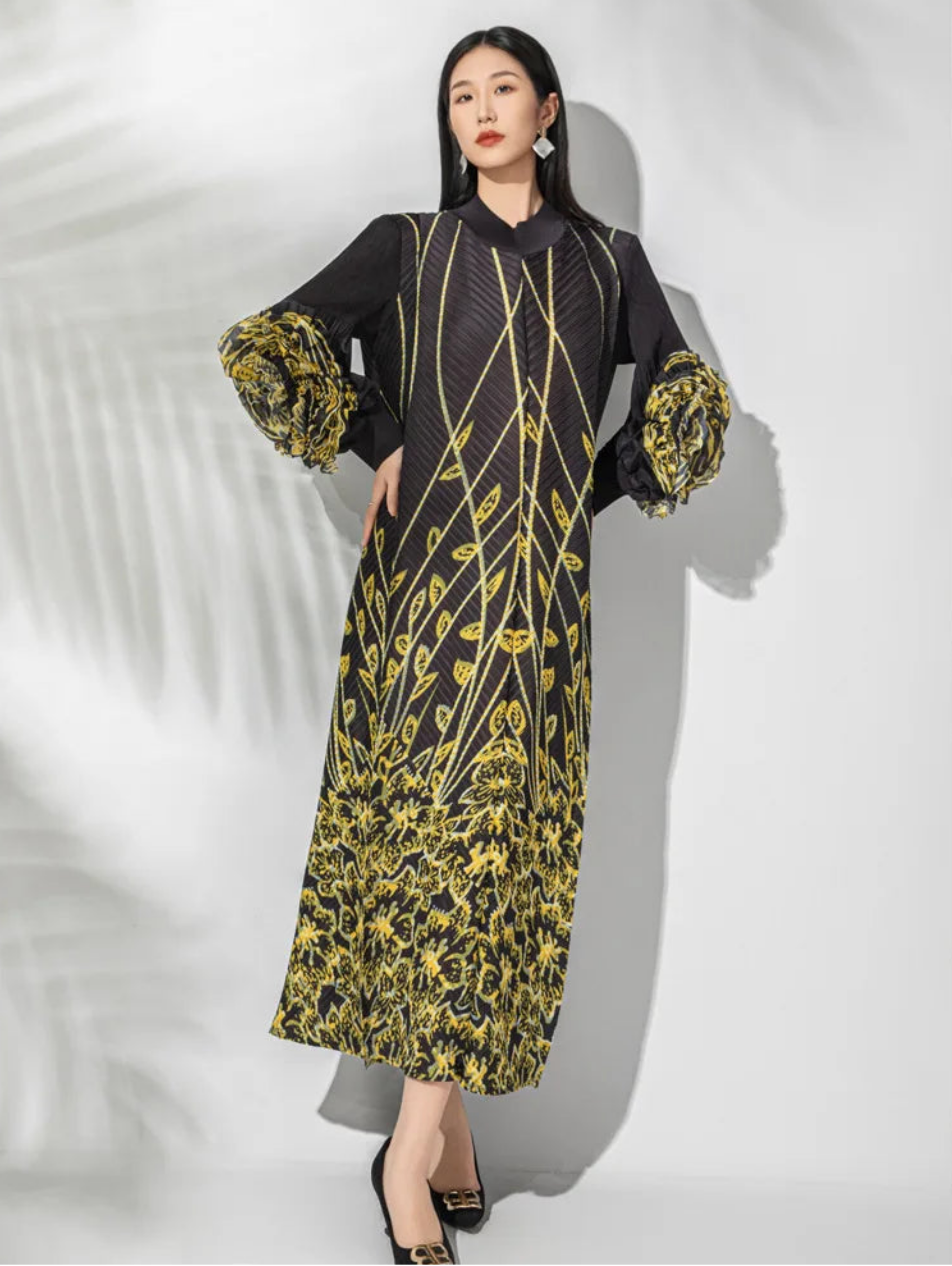 This elegant Japanese plissé midi dress features long sleeves and a refined leaf-and-vine texture for a luxurious, modern finish.