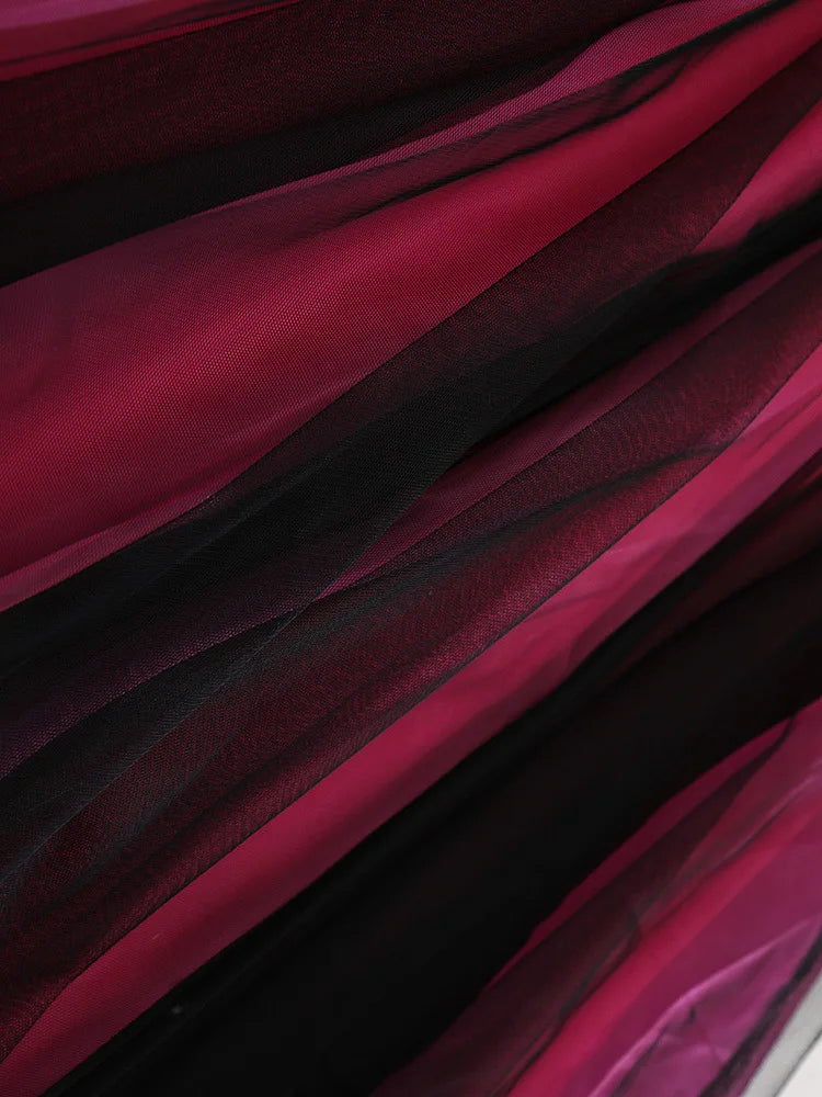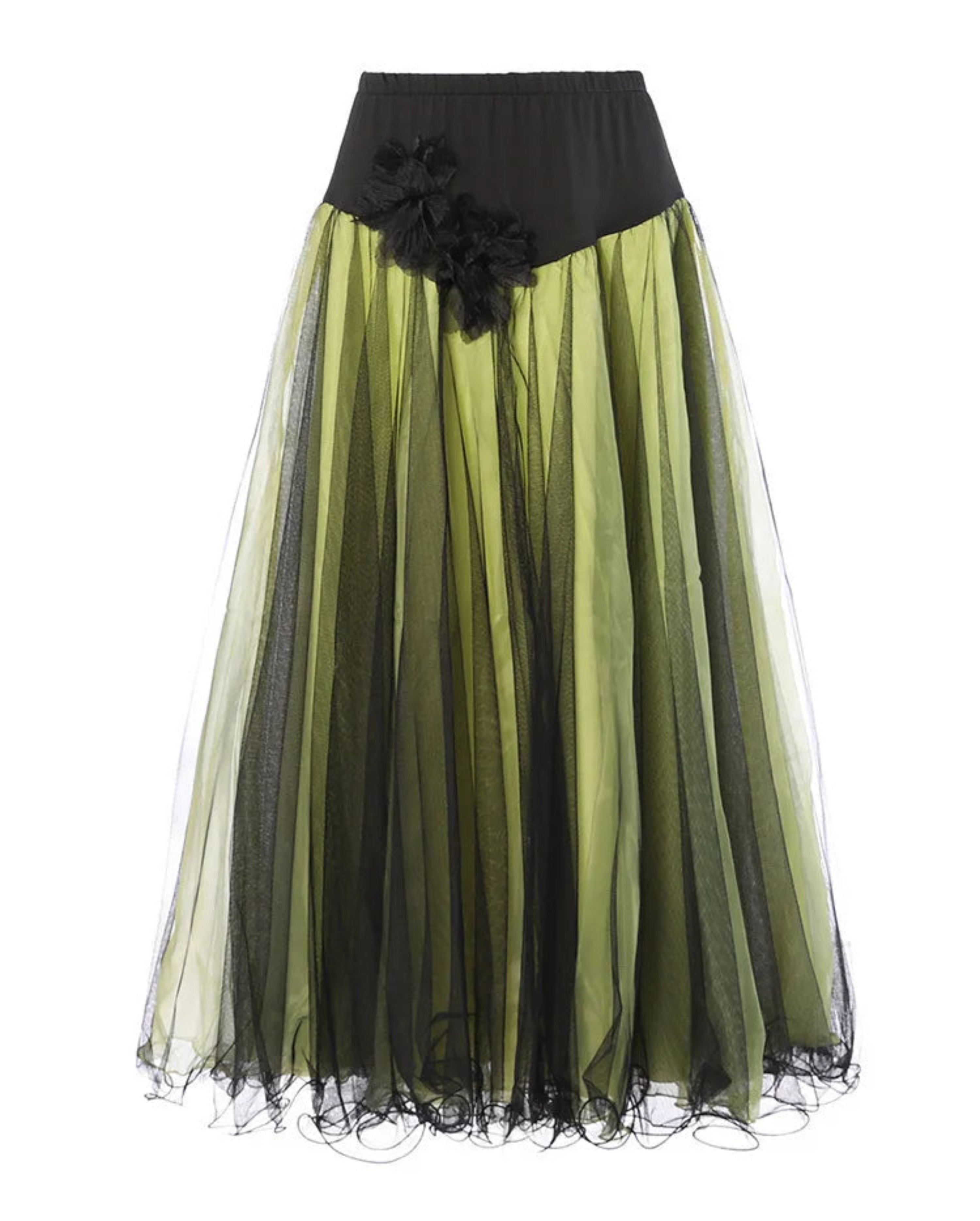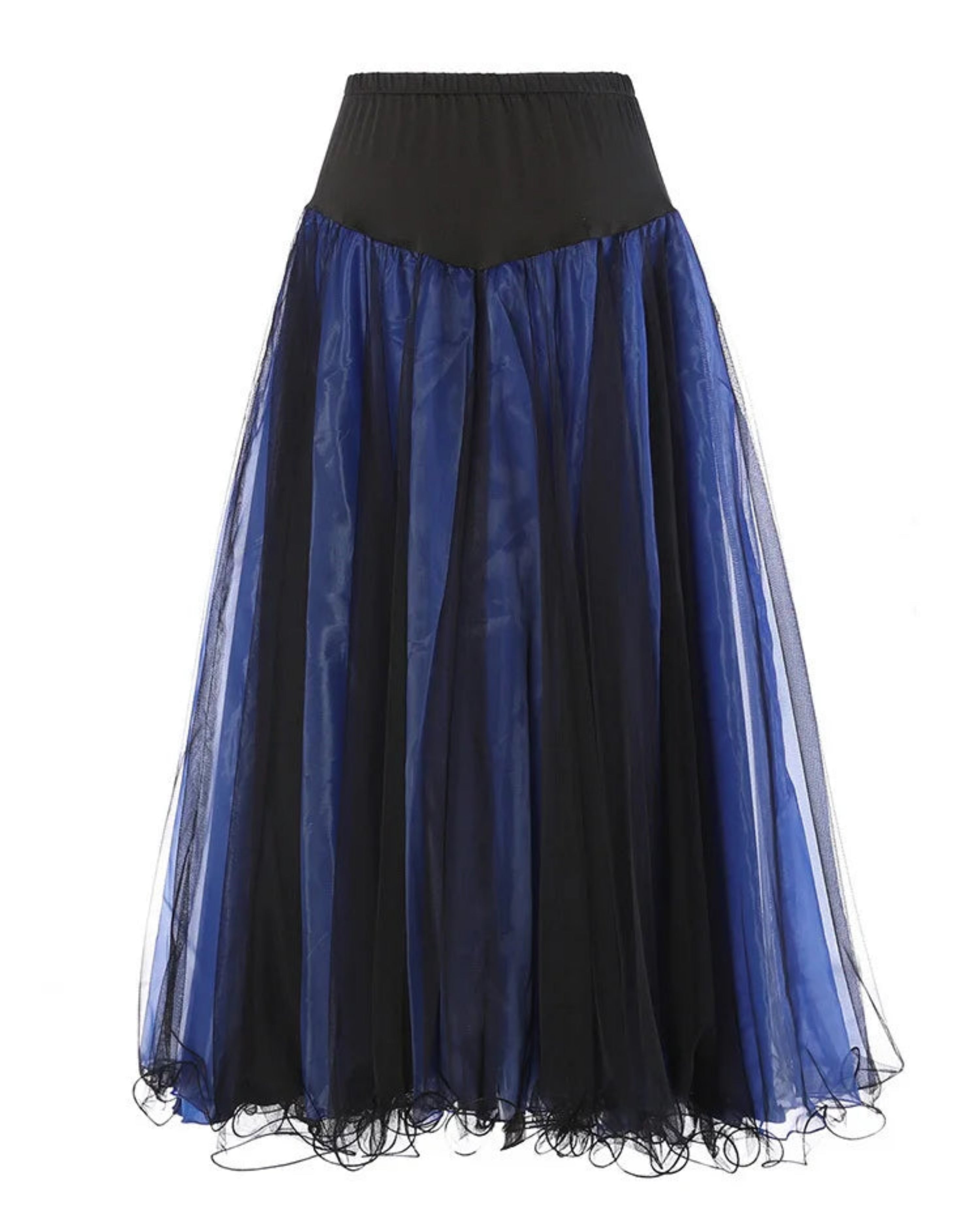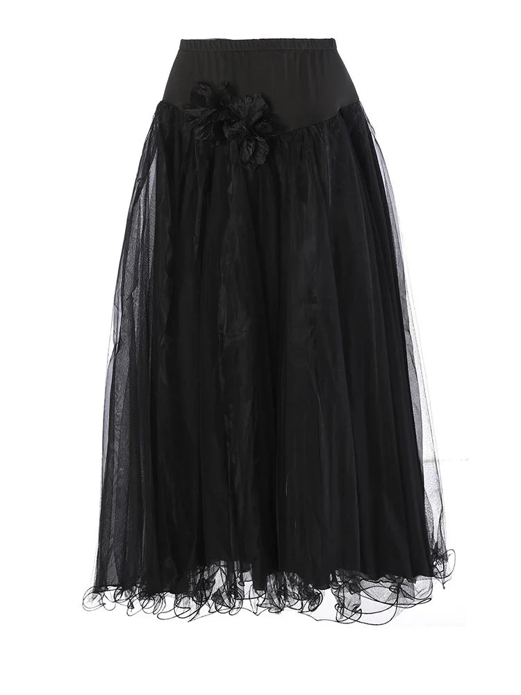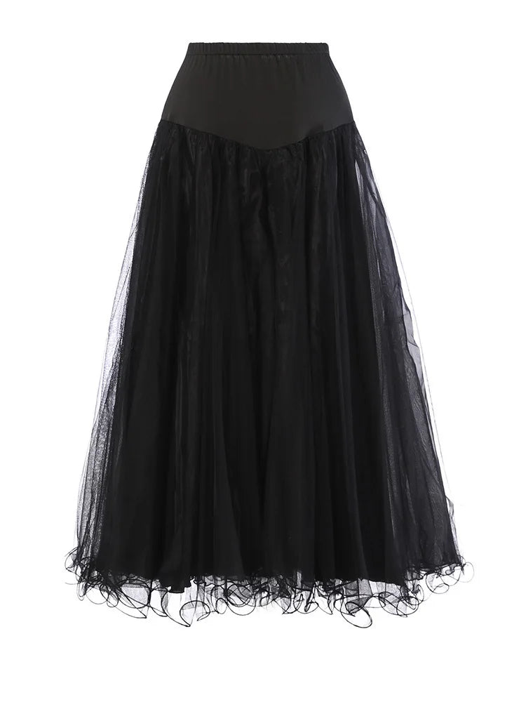 This luxury mesh midi skirt features a smooth elastic stretchy waistband, a fitted upper panel, and a voluminous multi-layered mesh tulle bottom that creates dramatic movement.