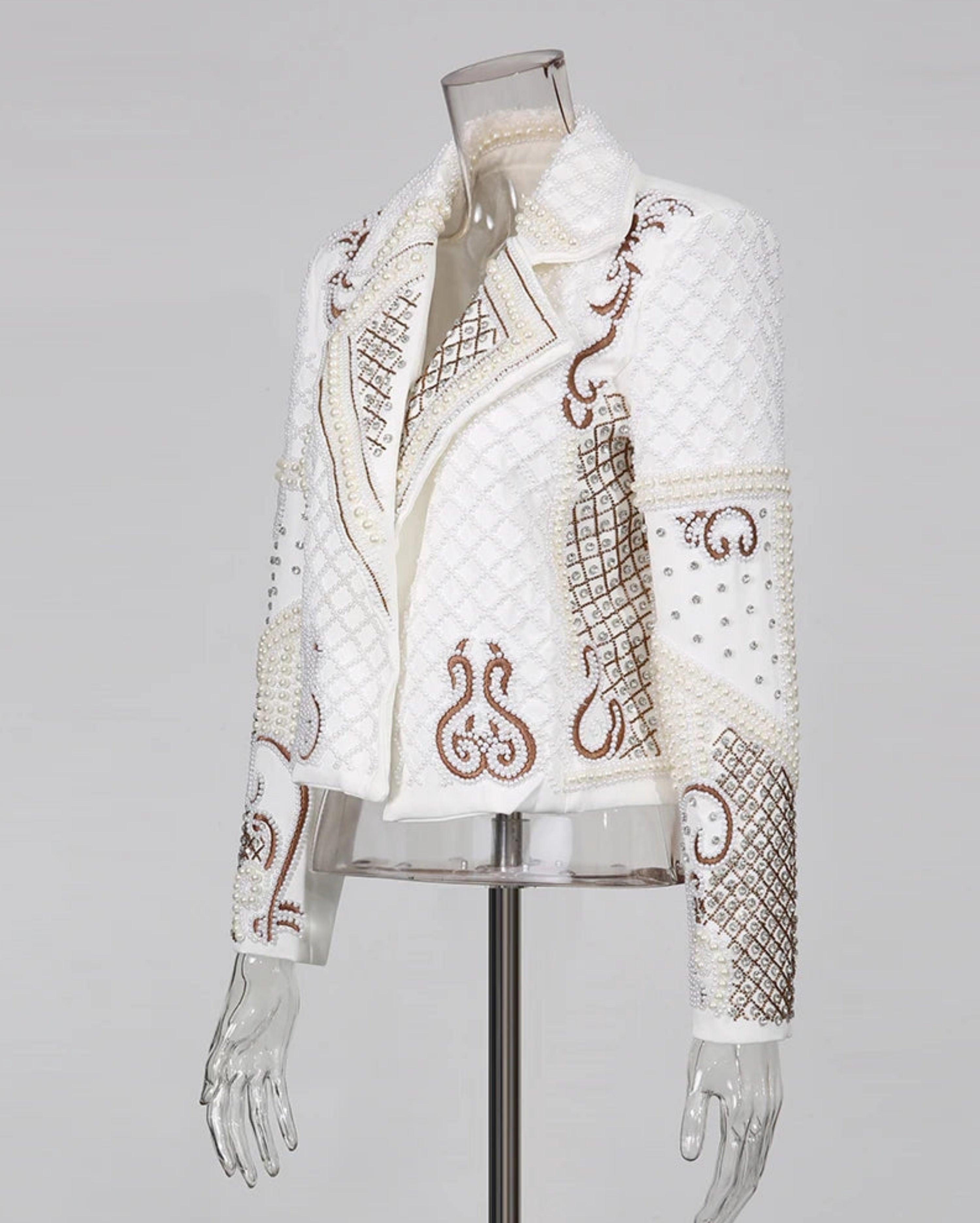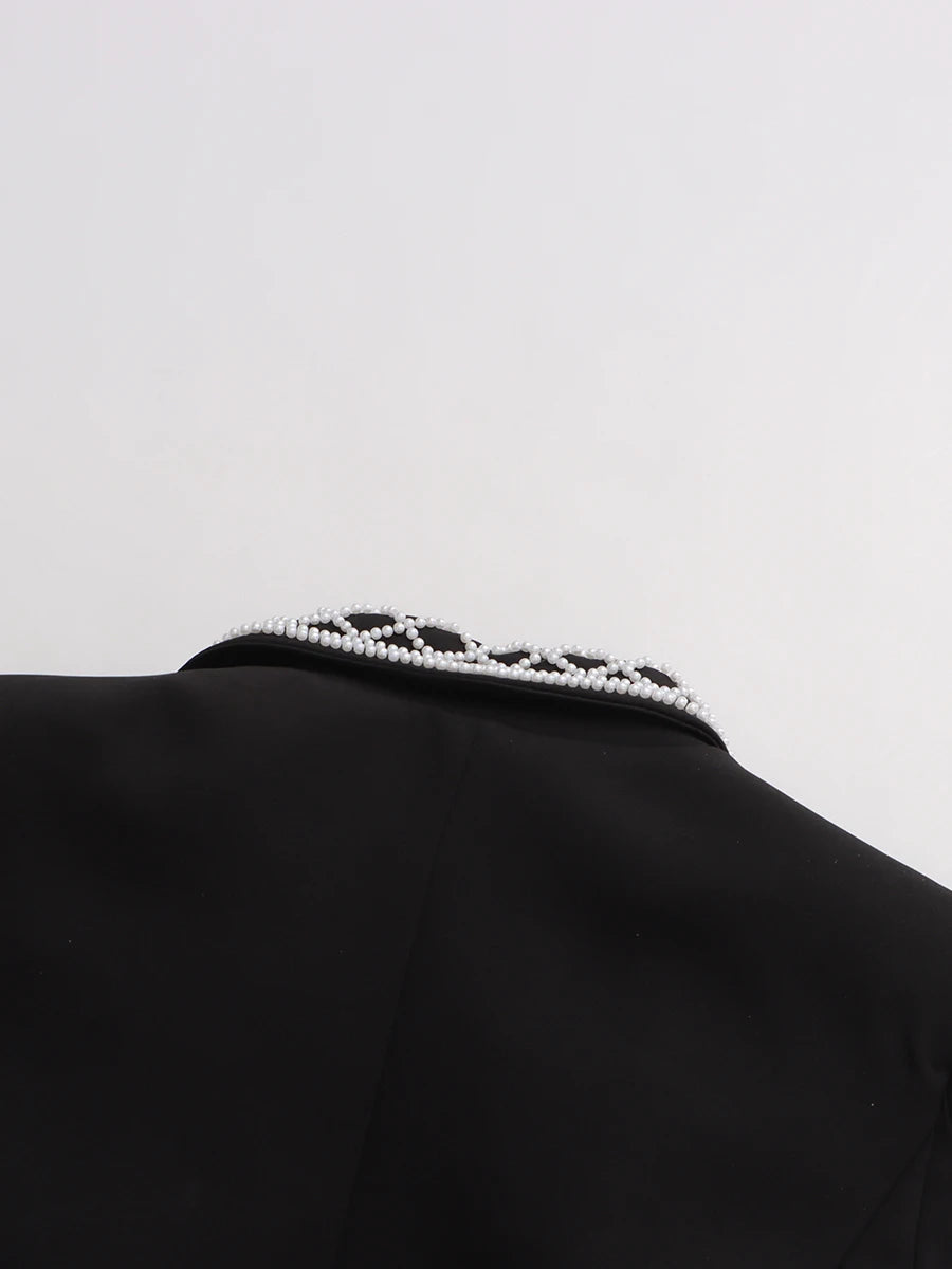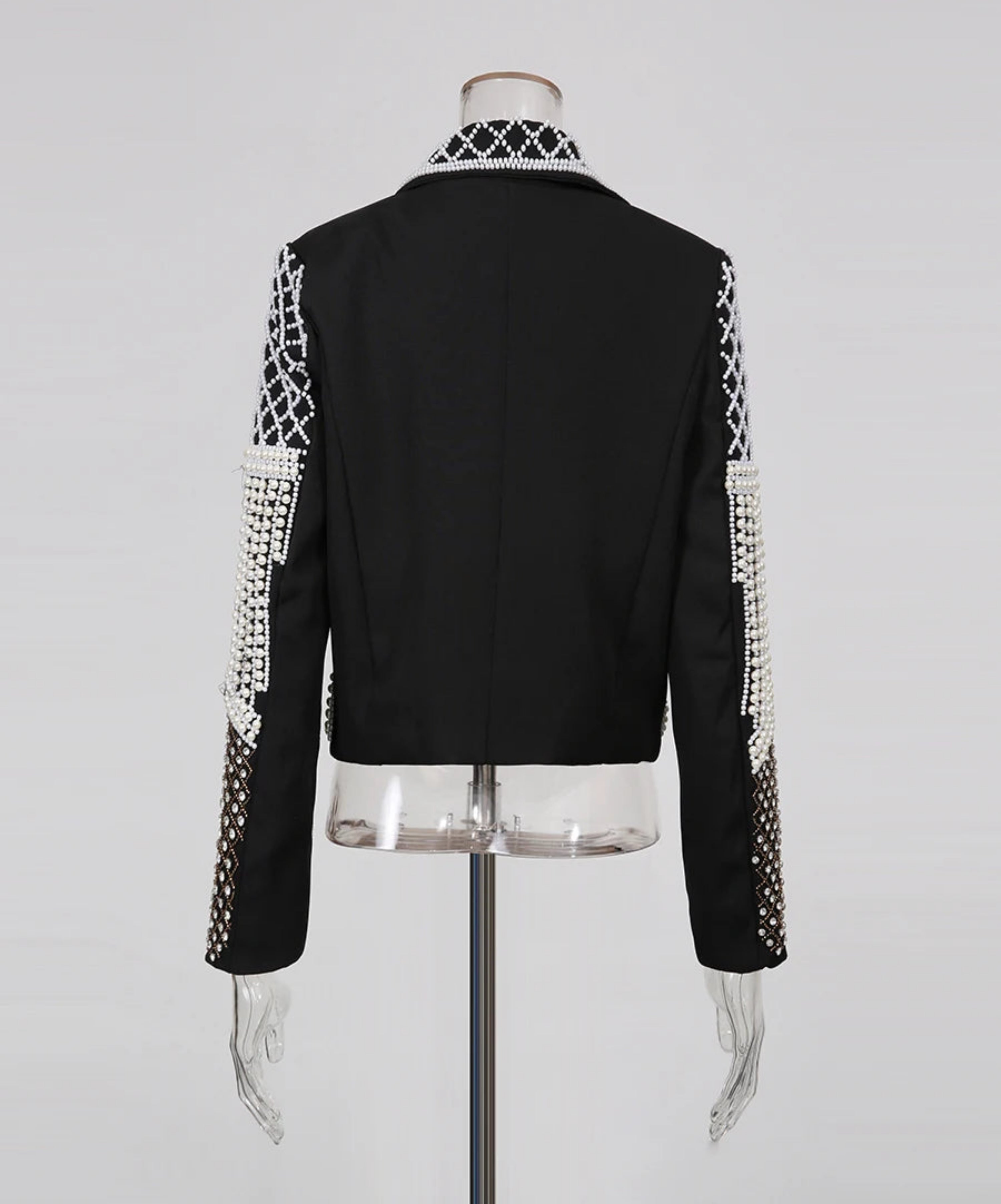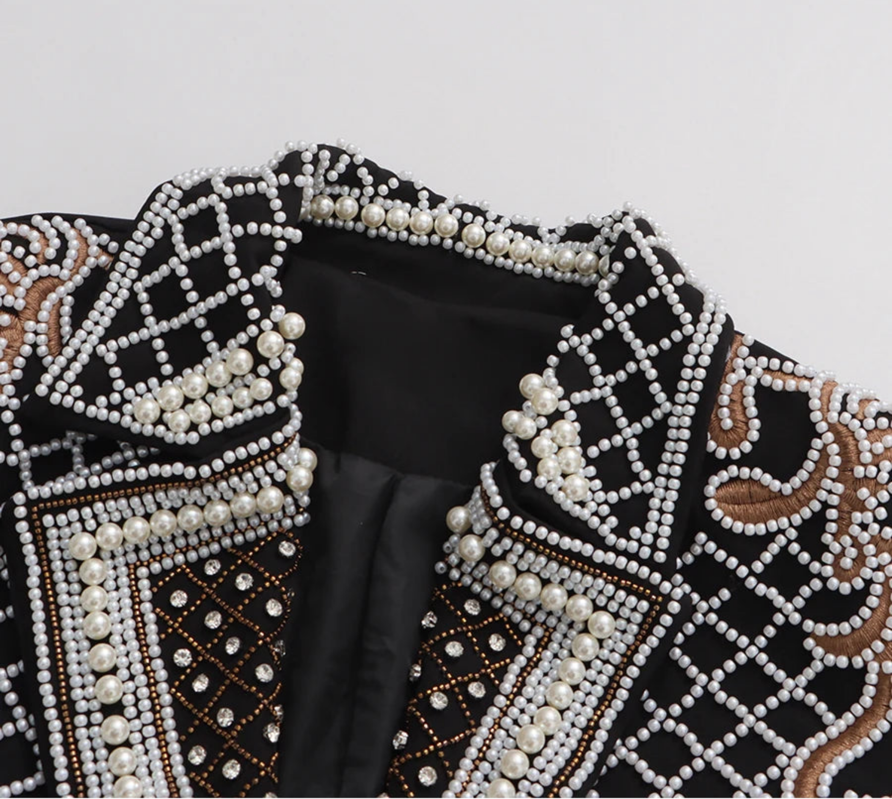 A couture-inspired cropped blazer featuring hand-stitched pearls and bead detailing across the collar, sleeves, and body.