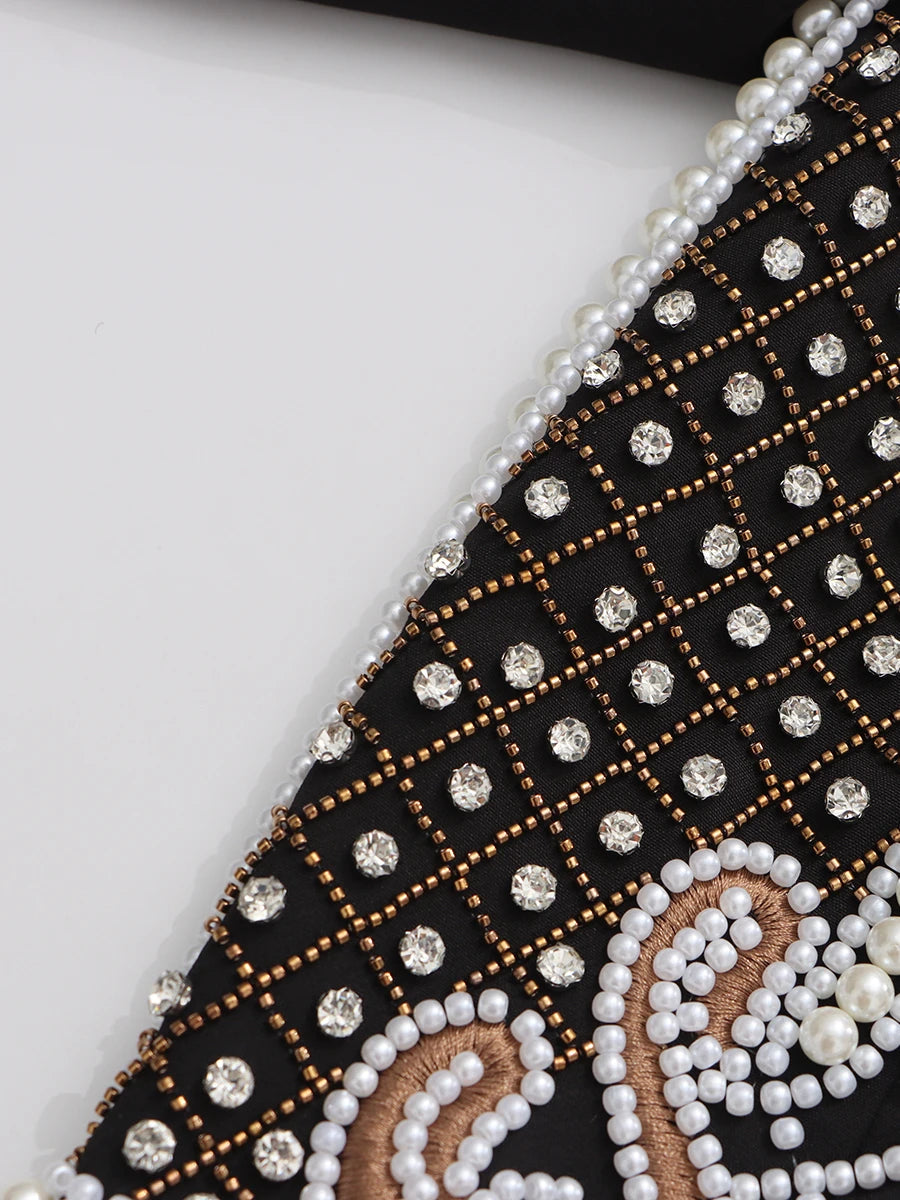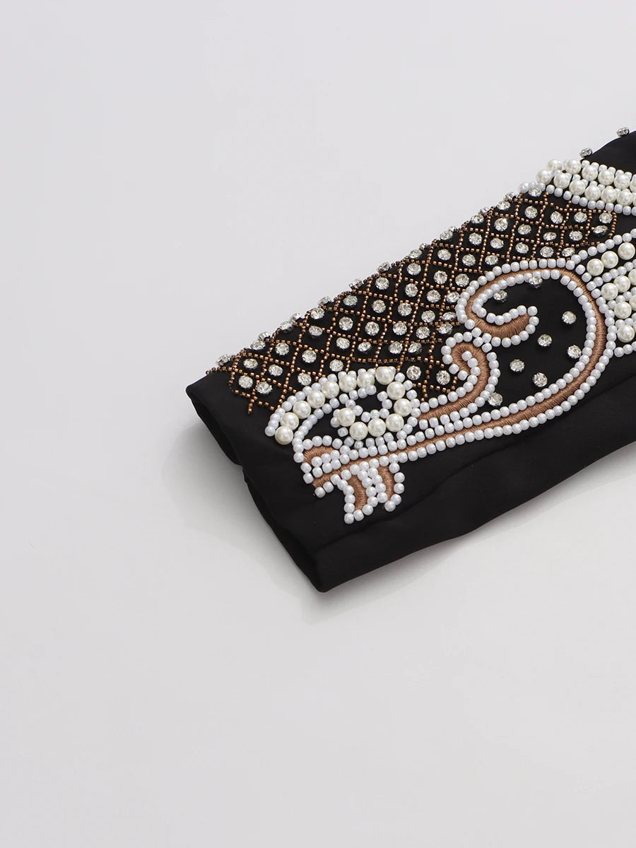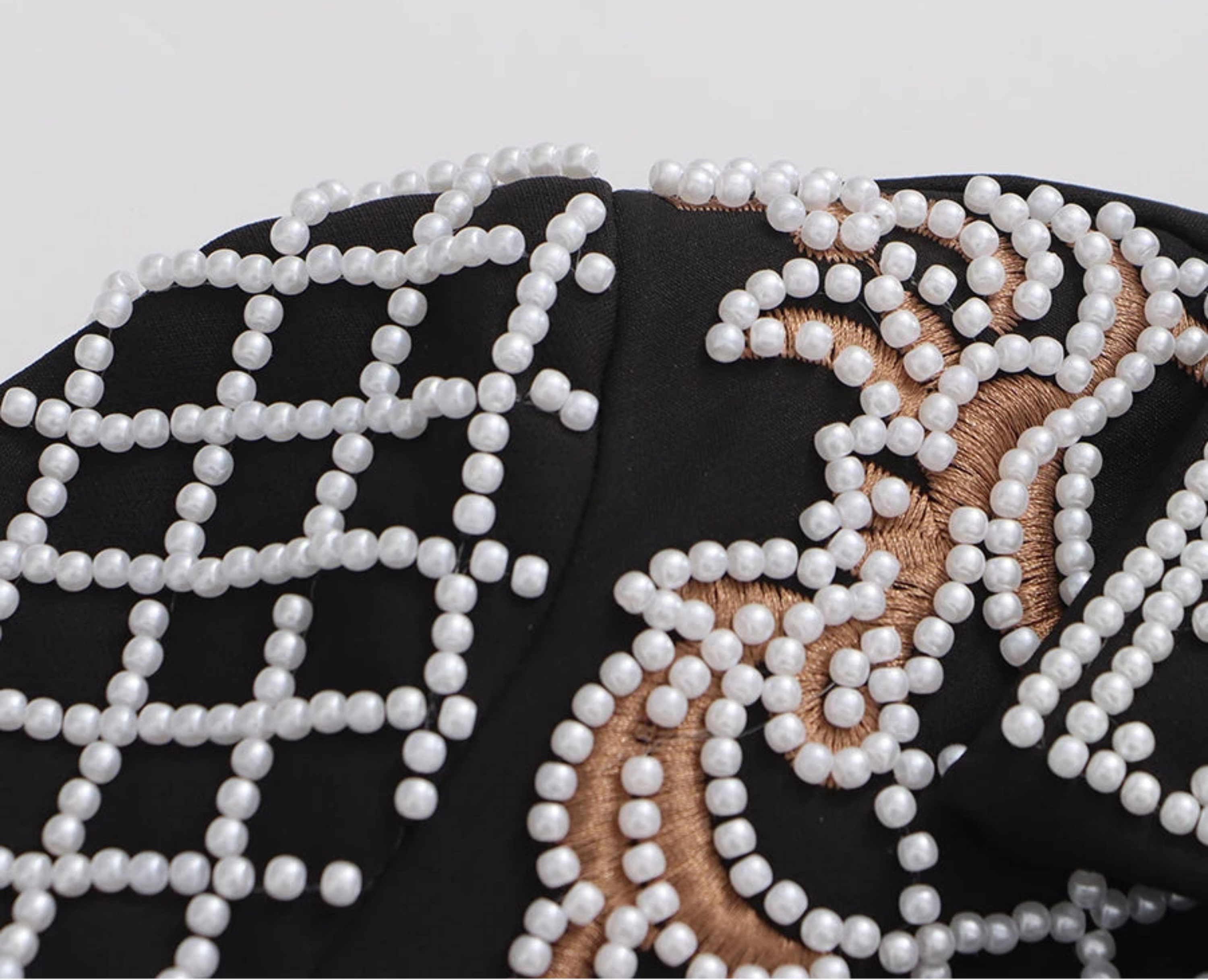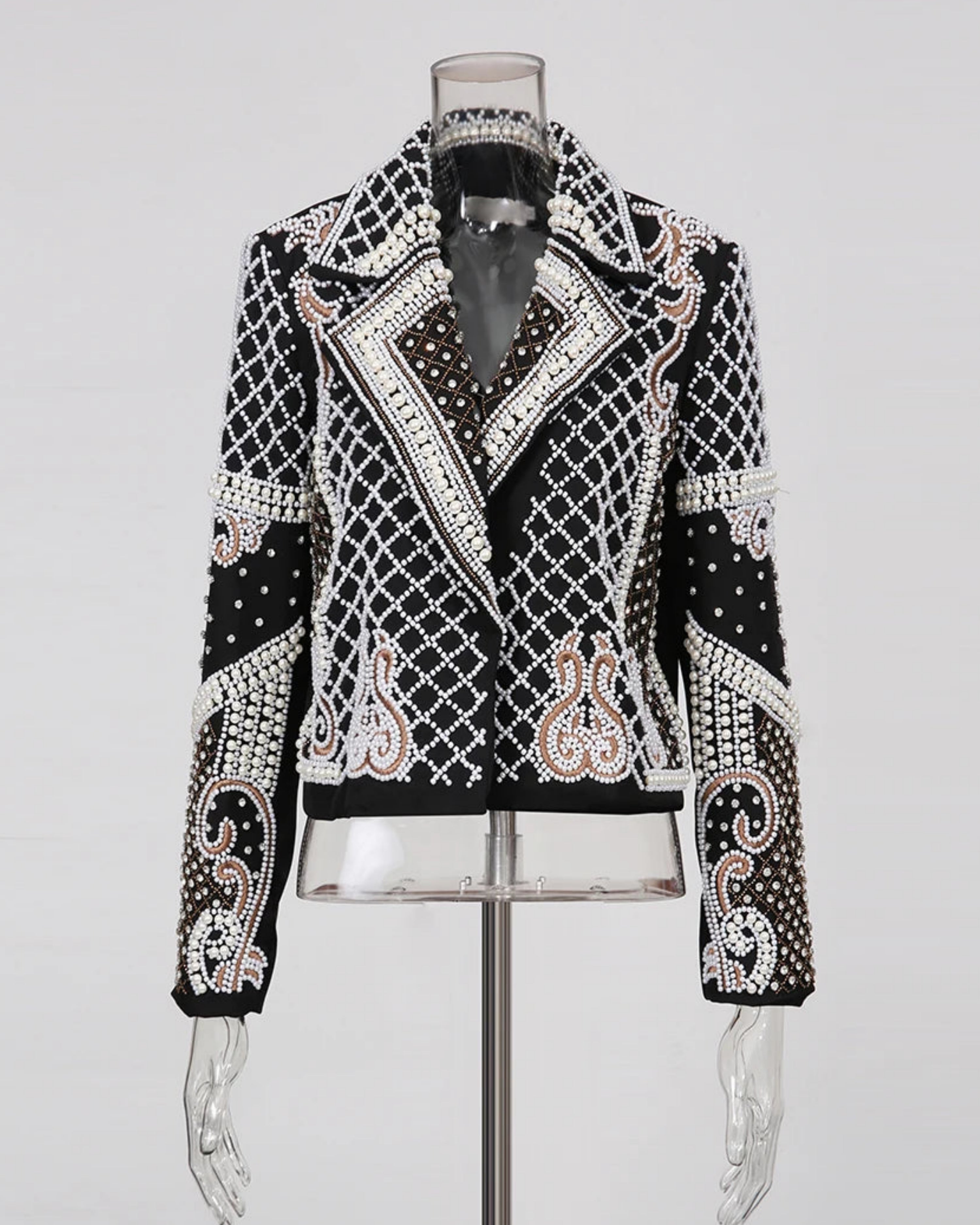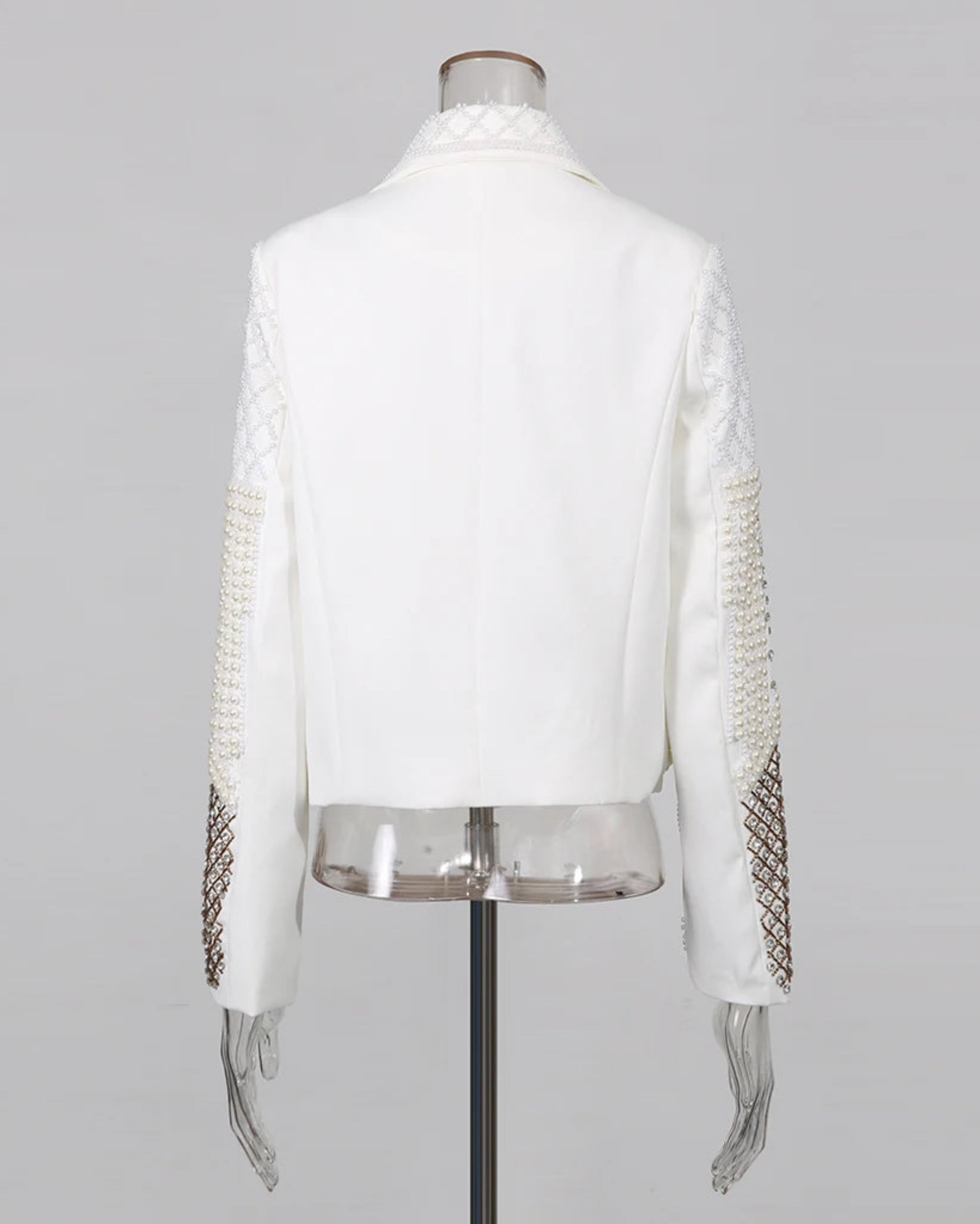 A couture-inspired cropped blazer featuring hand-stitched pearls and bead detailing across the collar, sleeves, and body.