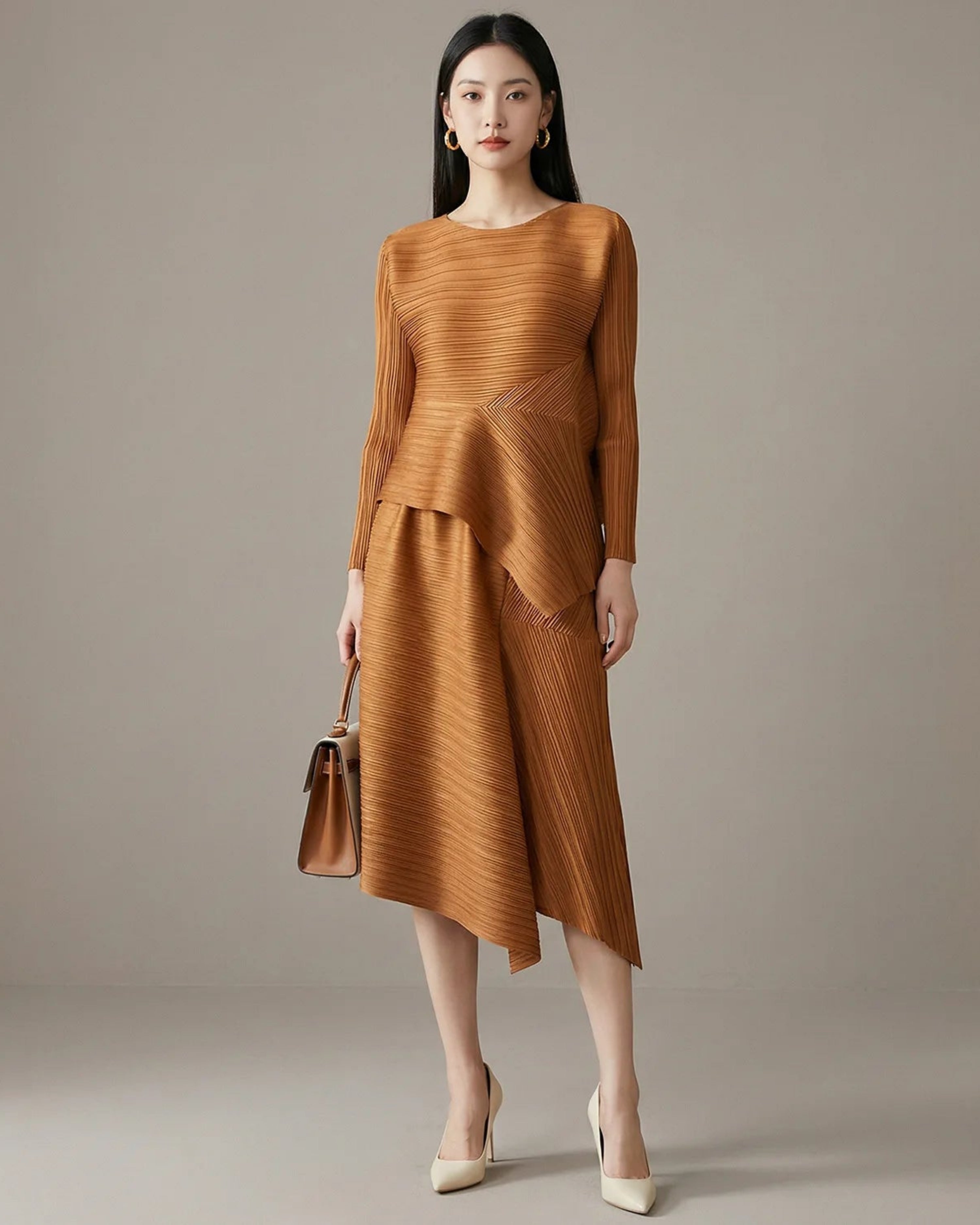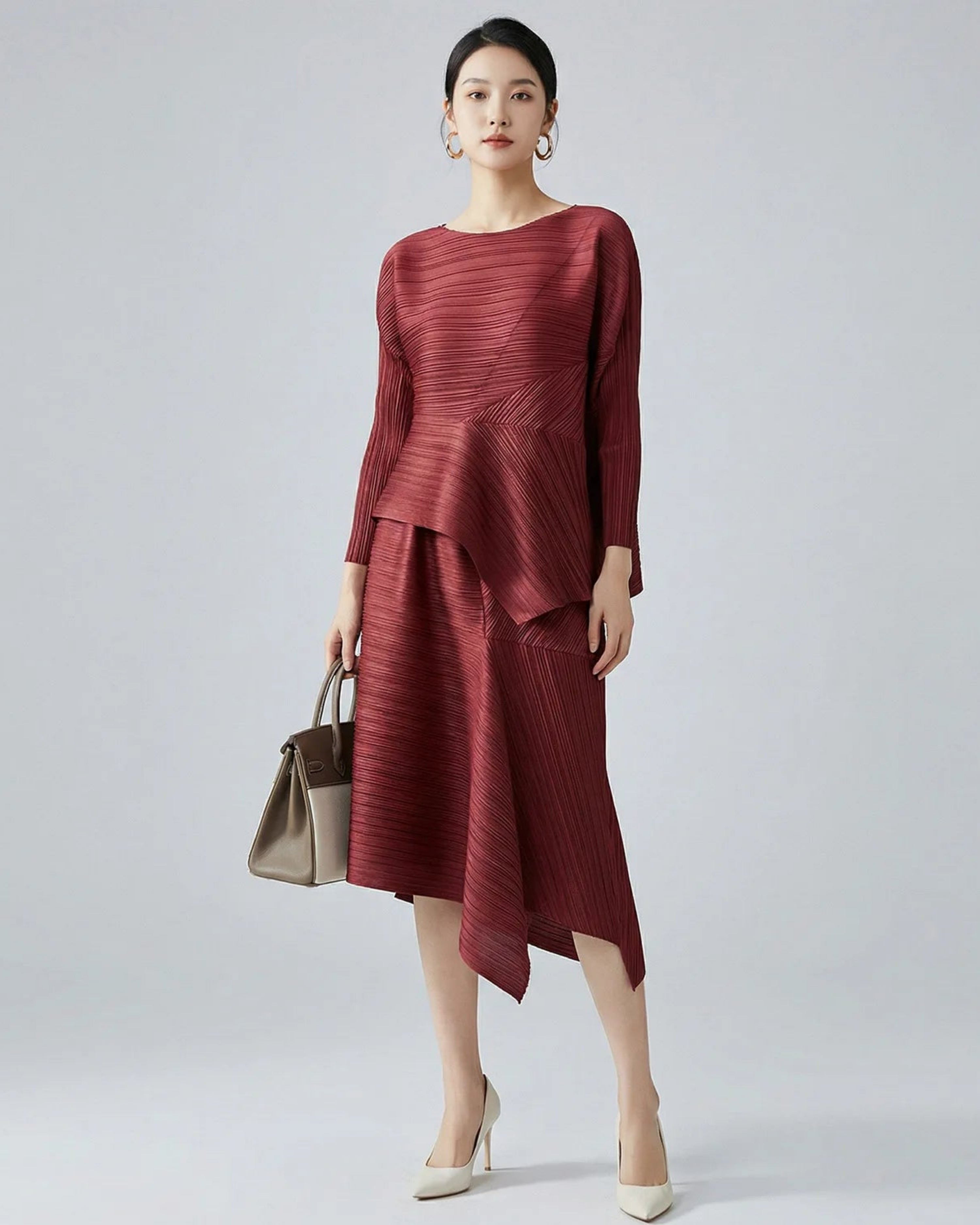 This luxury pleated ensemble is a 2-piece matching set with a geometric top and asymmetrical midi skirt.