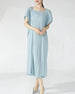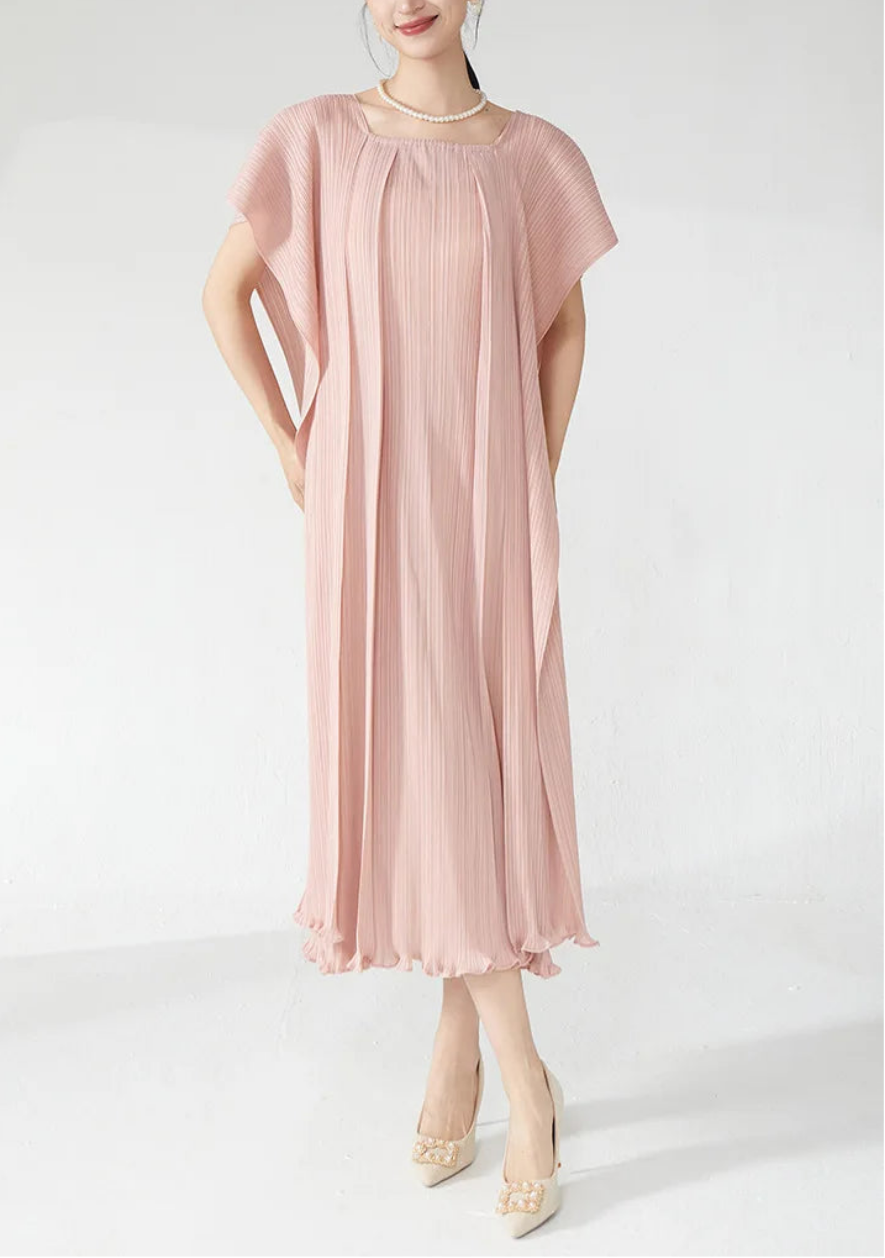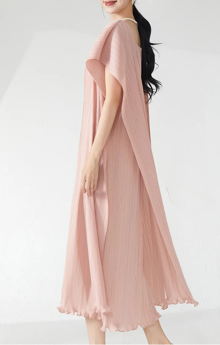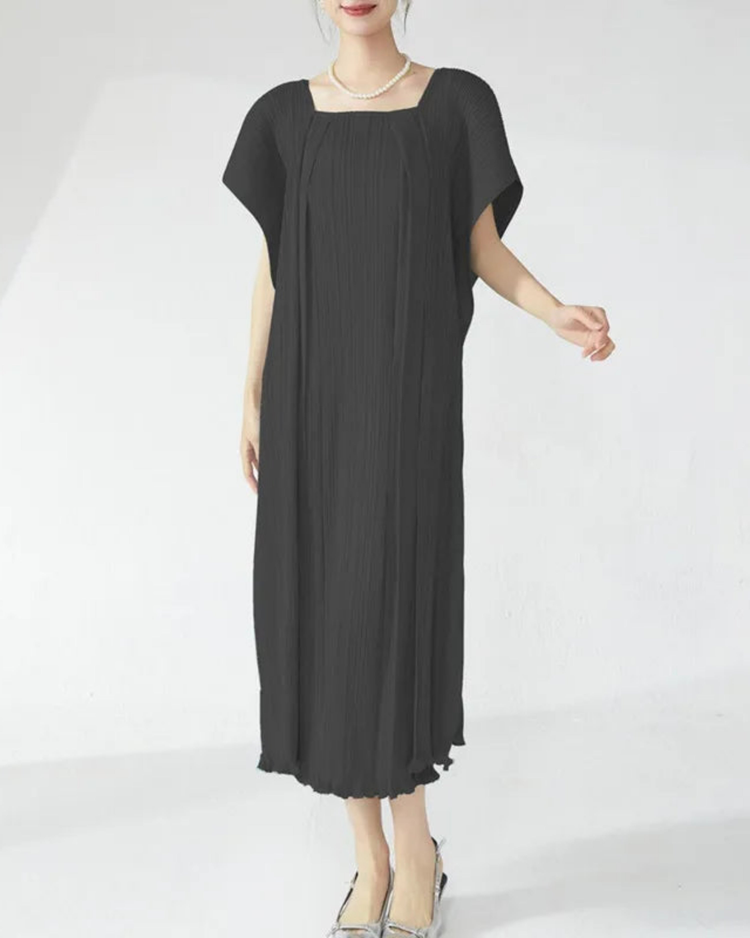 This elegant midi dress showcases premium Japanese plissé pleats with a modern square neckline and softly draped sleeves.