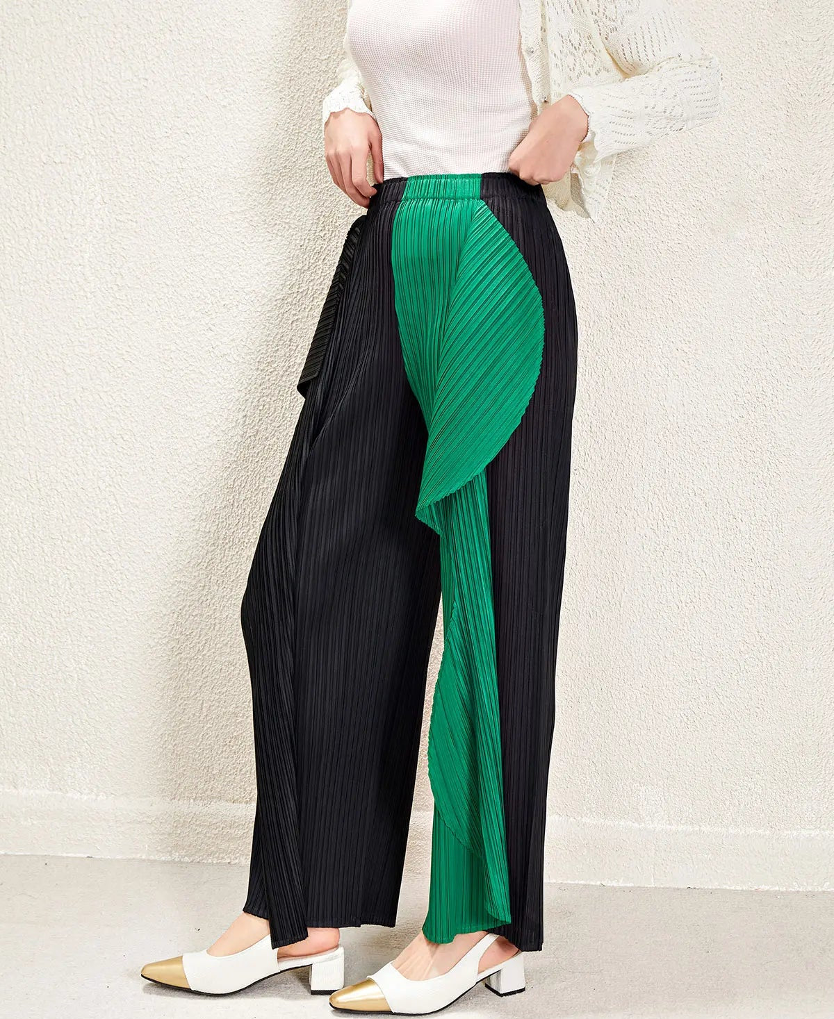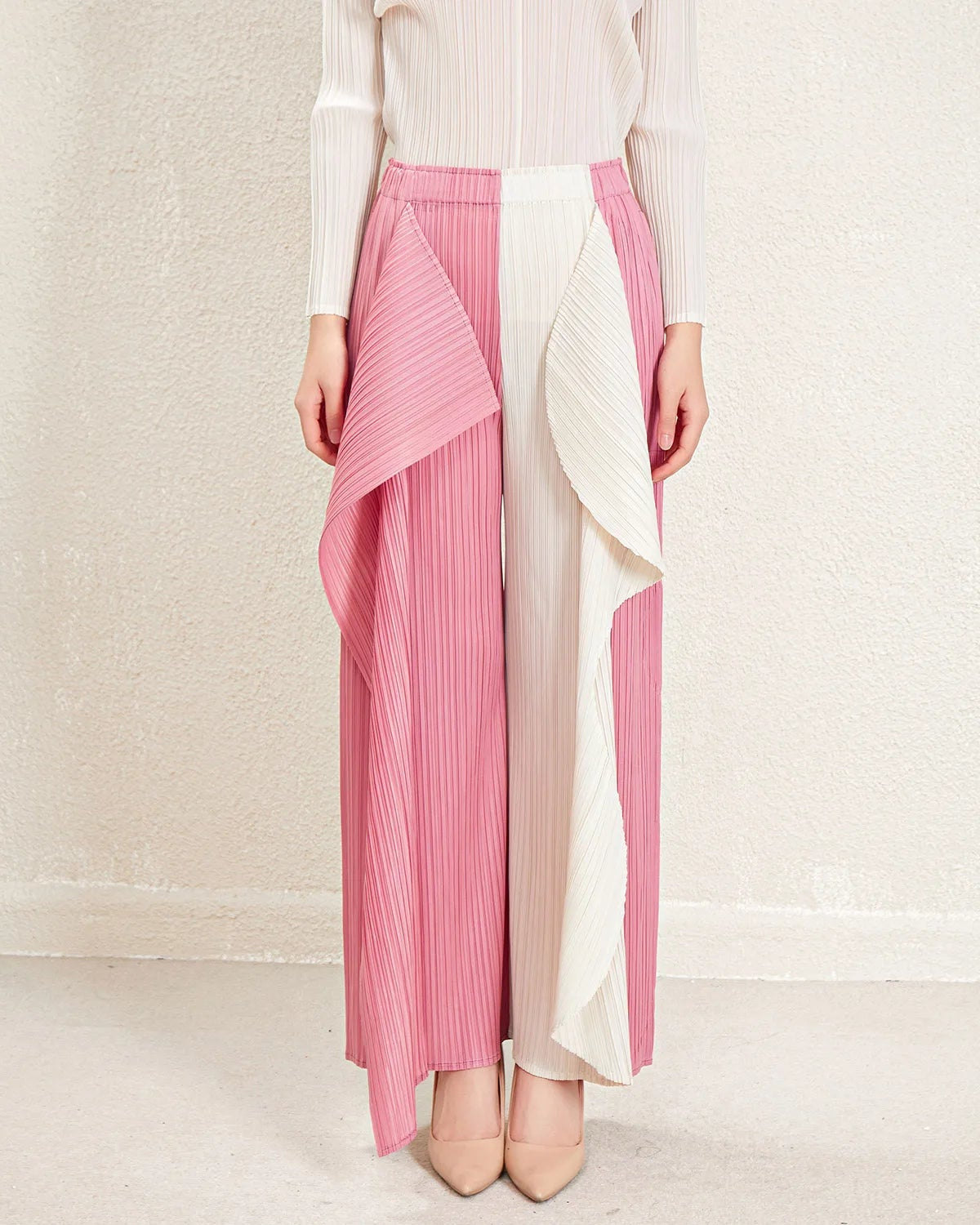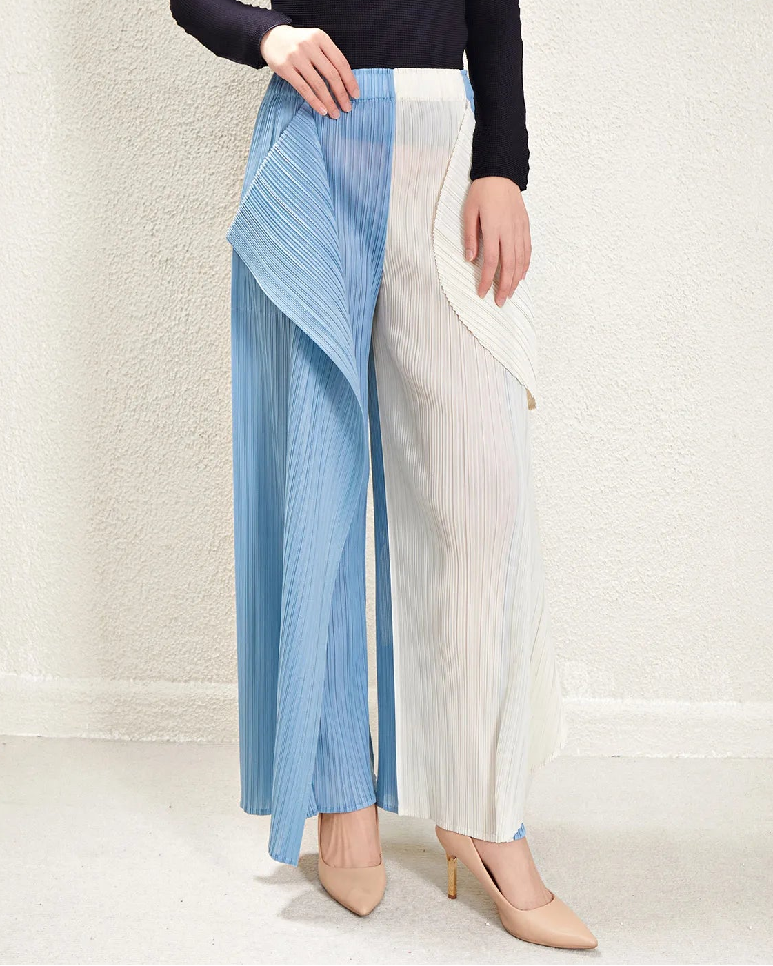 Luxury Japanese plissé wide-leg trousers for work, travel, and formal wear. High-waisted with elastic waistband and pull-on fit for comfort and ease.