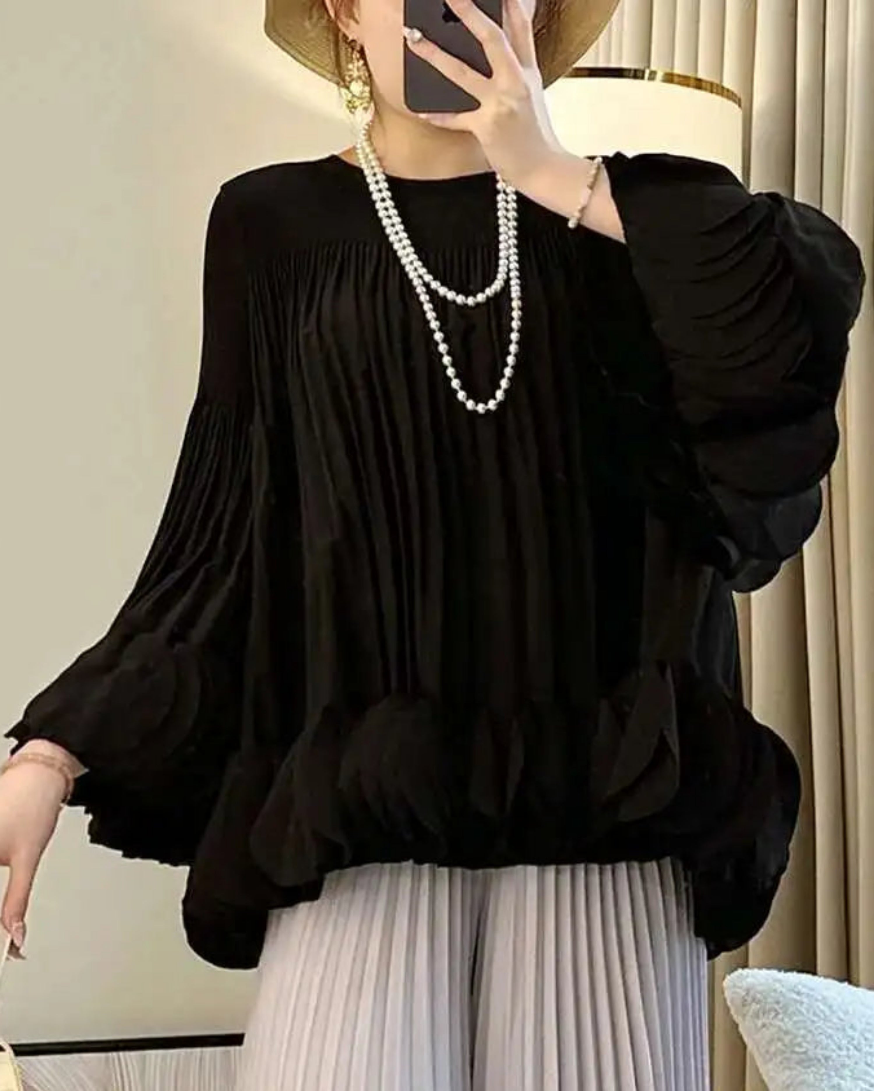 This luxurious plissé blouse top features a round collar, full bell sleeves, and a tiered architectural hem made of layered circular appliqués.