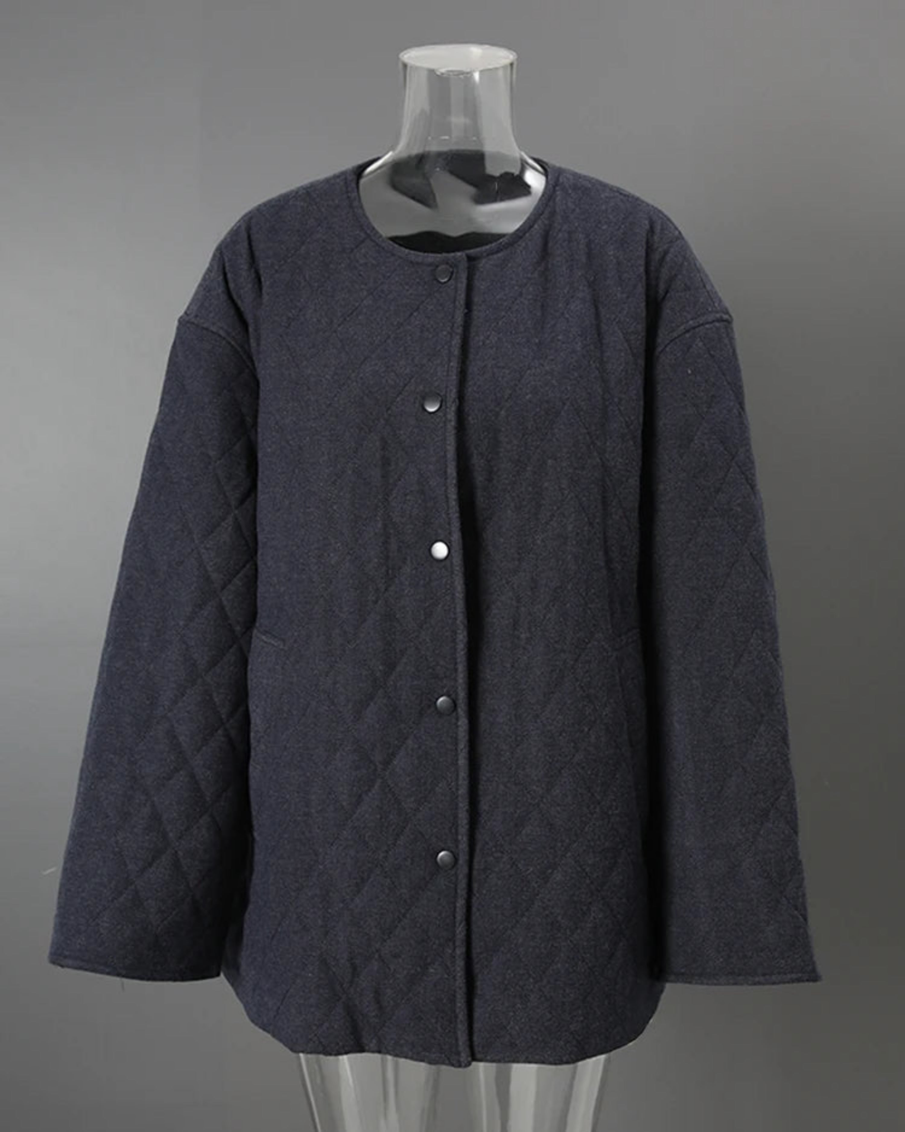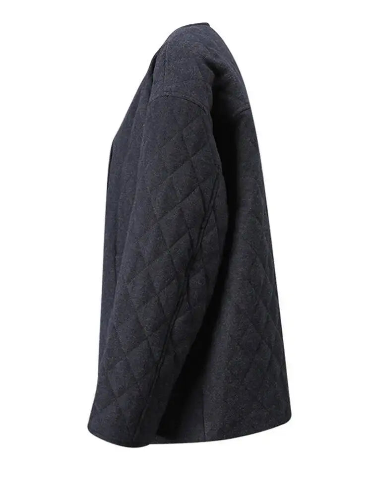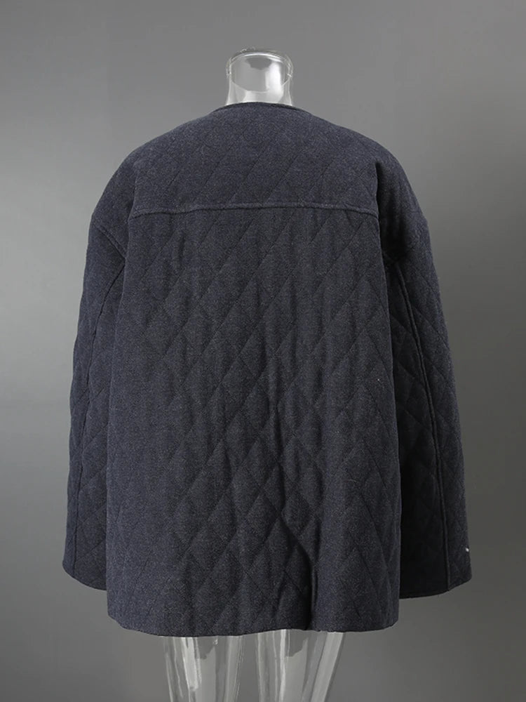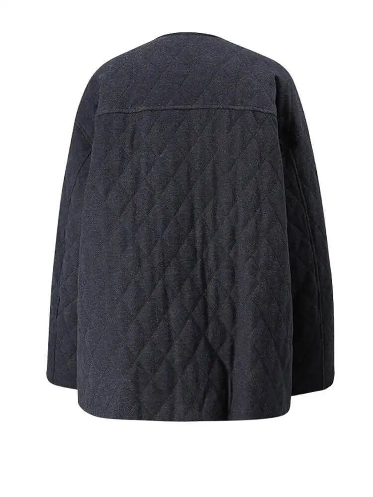 Warm, cozy, and elegant, it combines quilted insulation with a loose, comfortable fit for stylish layering in cooler weather.
