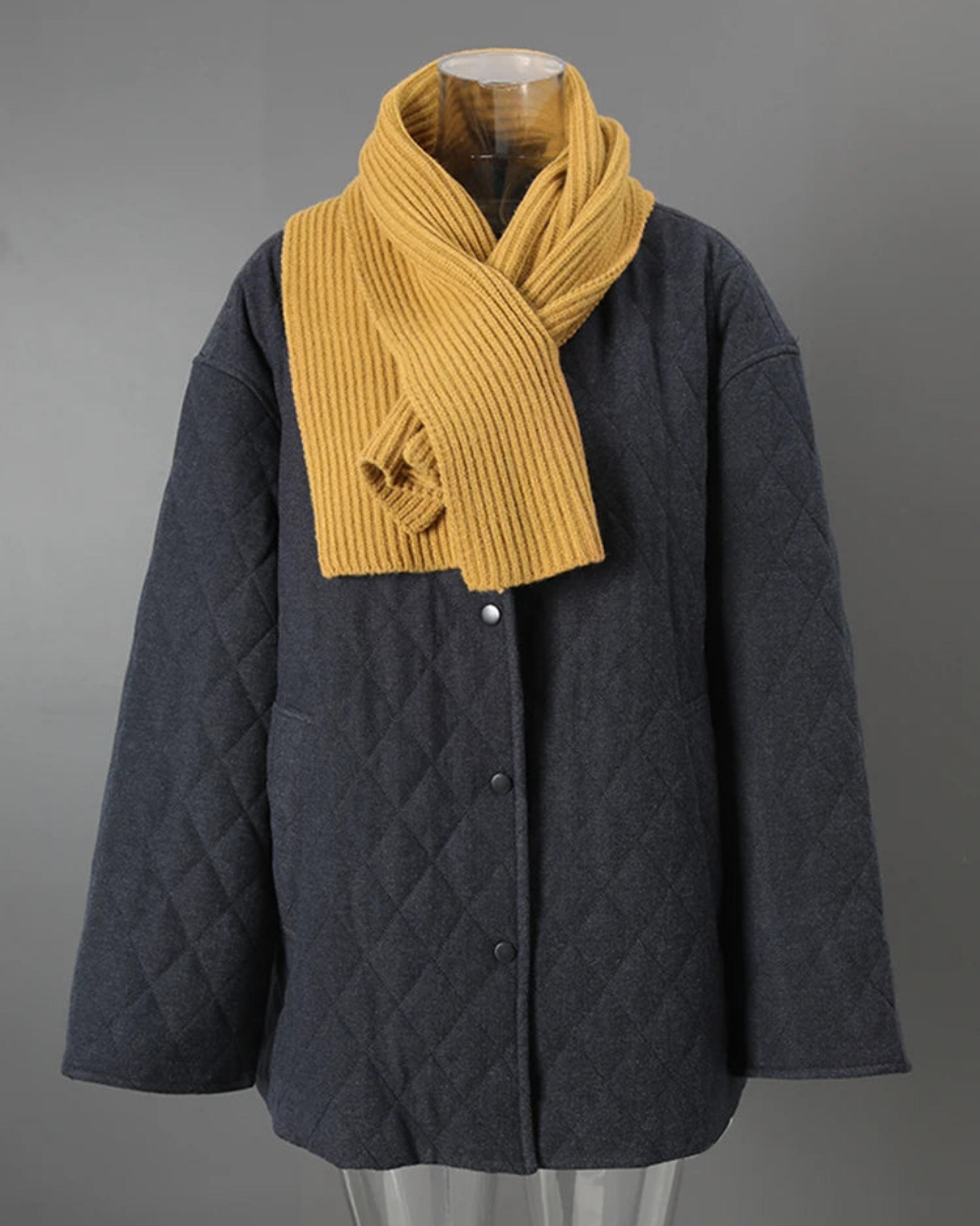 This luxurious quilted cotton-blend jacket features an oversized collarless design paired with a mustard-yellow ribbed knit scarf.