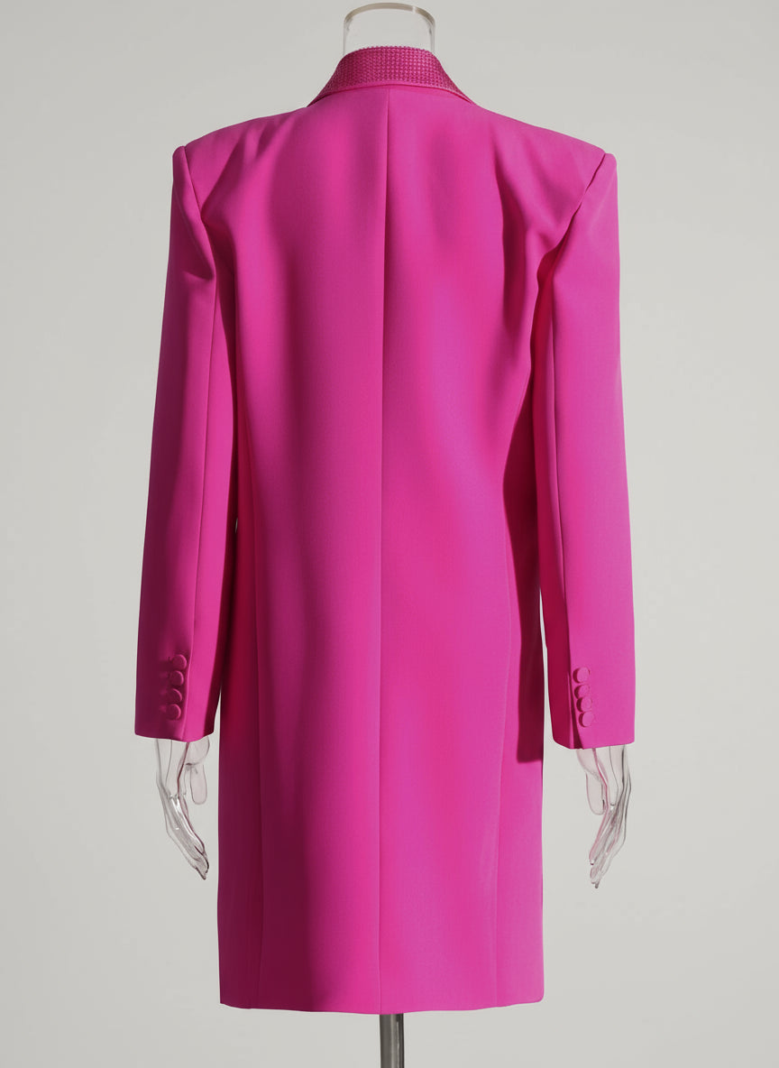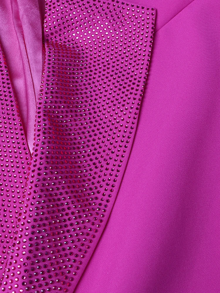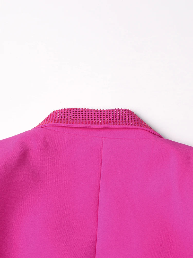 Elegant longline blazer for professional, formal, and evening occasions. Features sparkling rhinestone and diamond accents on the collar for a luxurious finish.