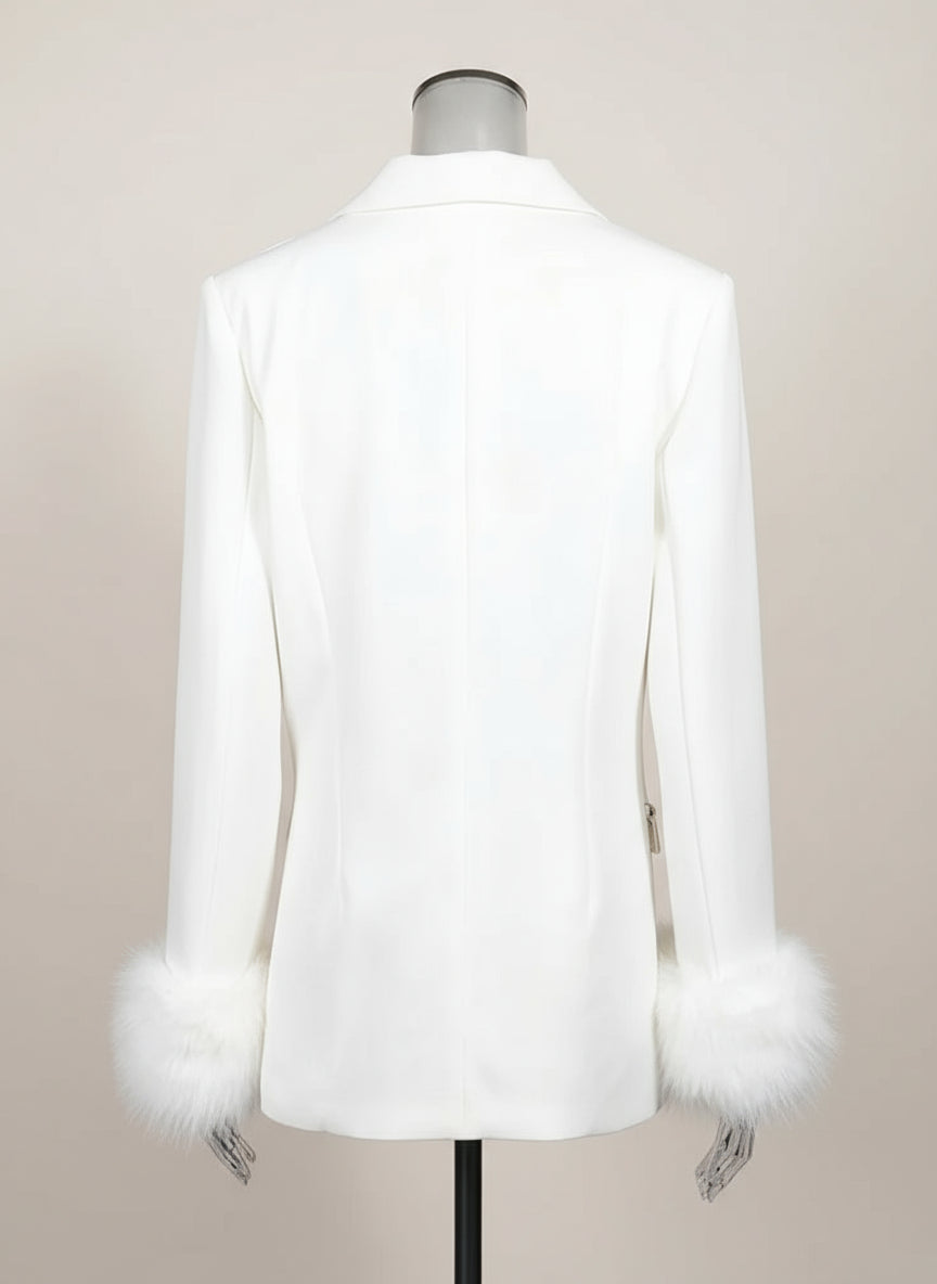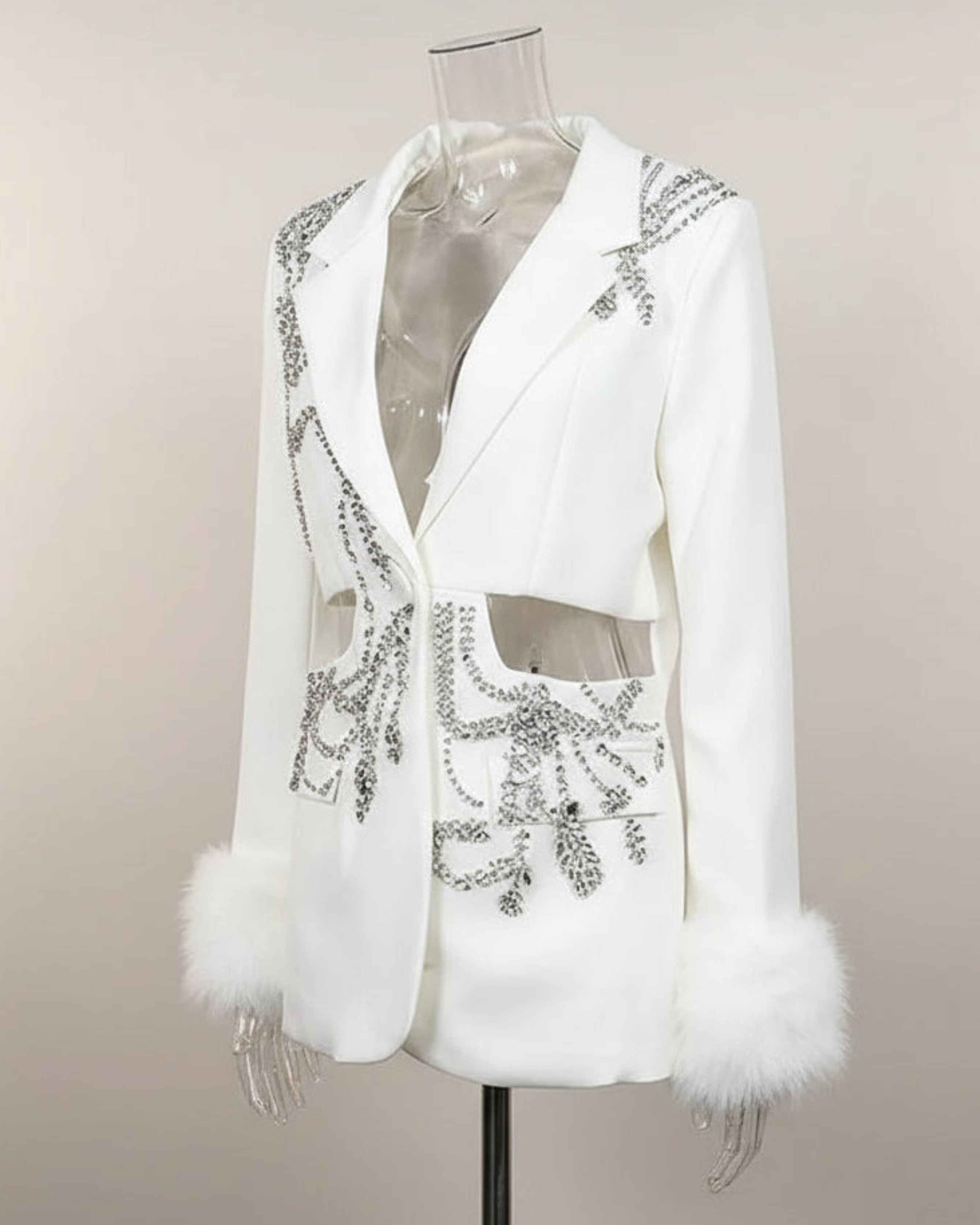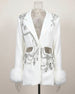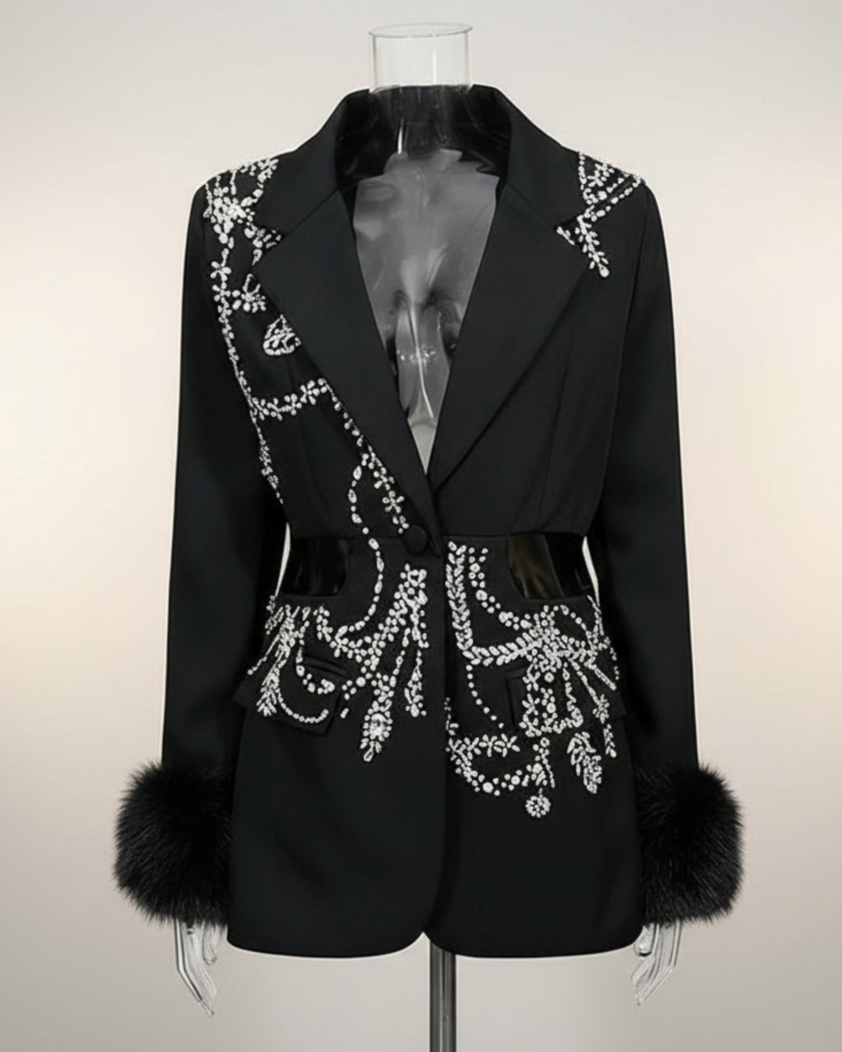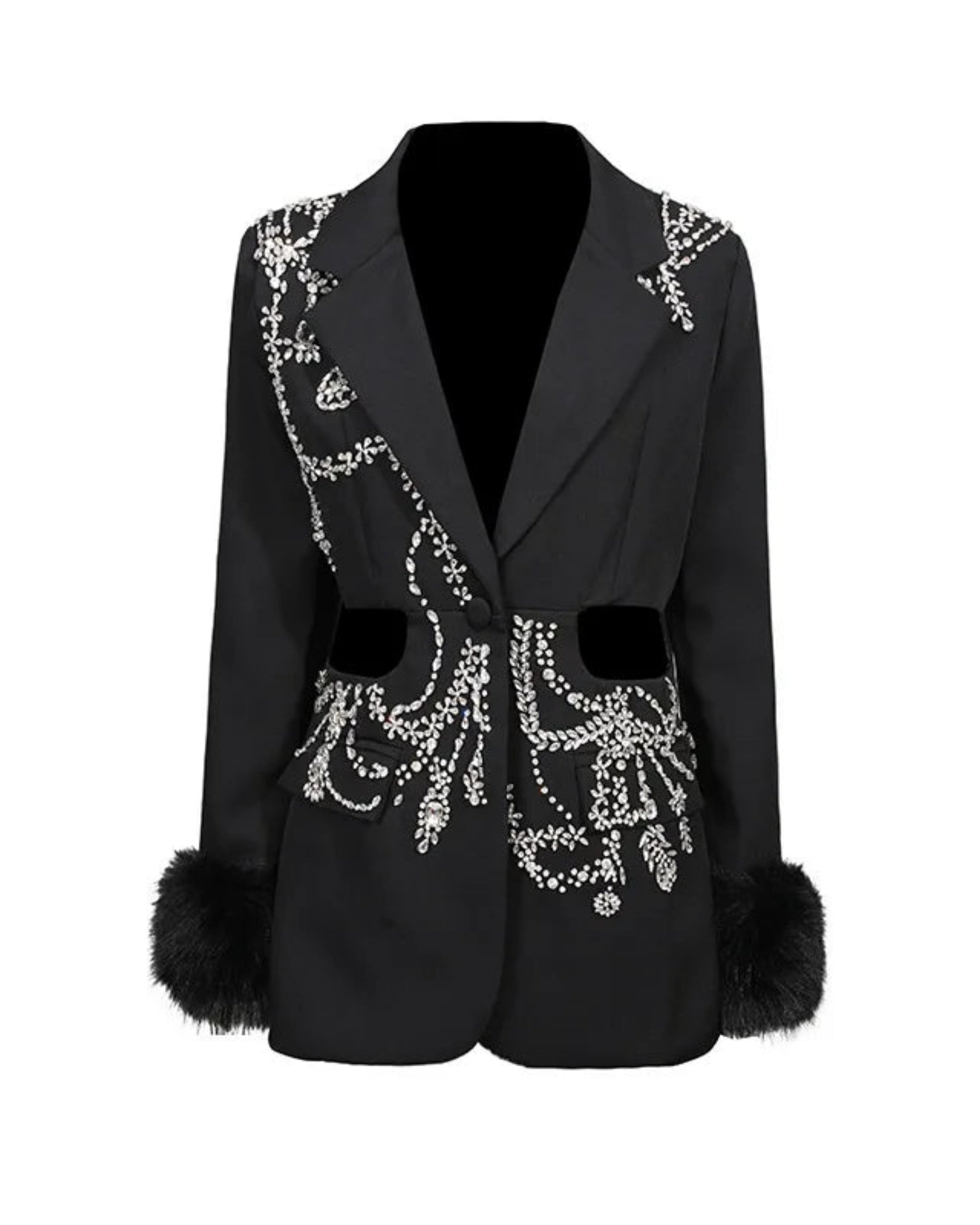 Shimmering rhinestone and sequin patterns cover the front and sleeves, while long sleeves are finished with luxurious faux fur cuffs. Bold and glamorous, this jacket makes a striking statement piece.