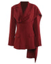 This luxurious blazer features a dramatic shawl-like drape flowing from the back, creating a refined and sophisticated silhouette.