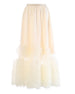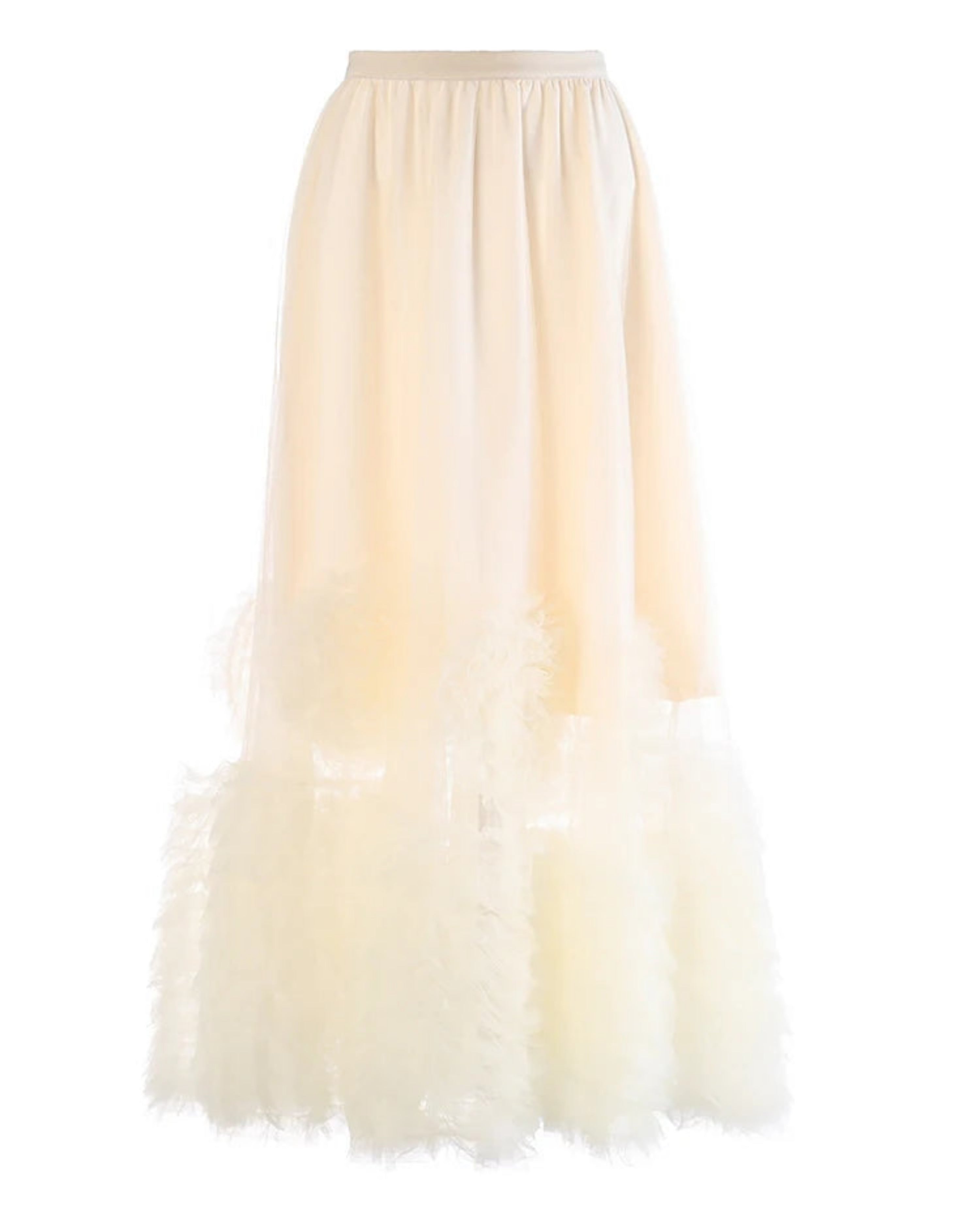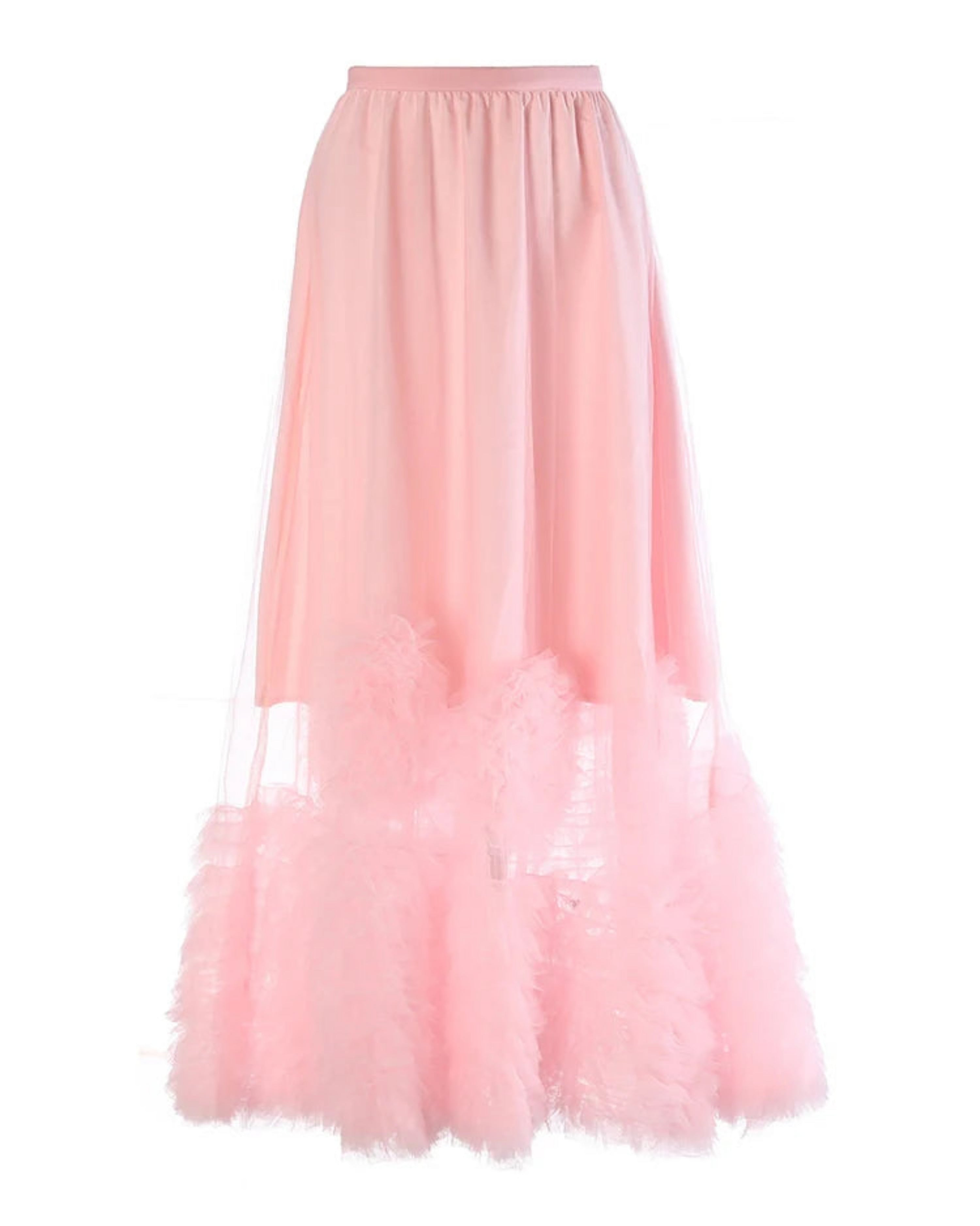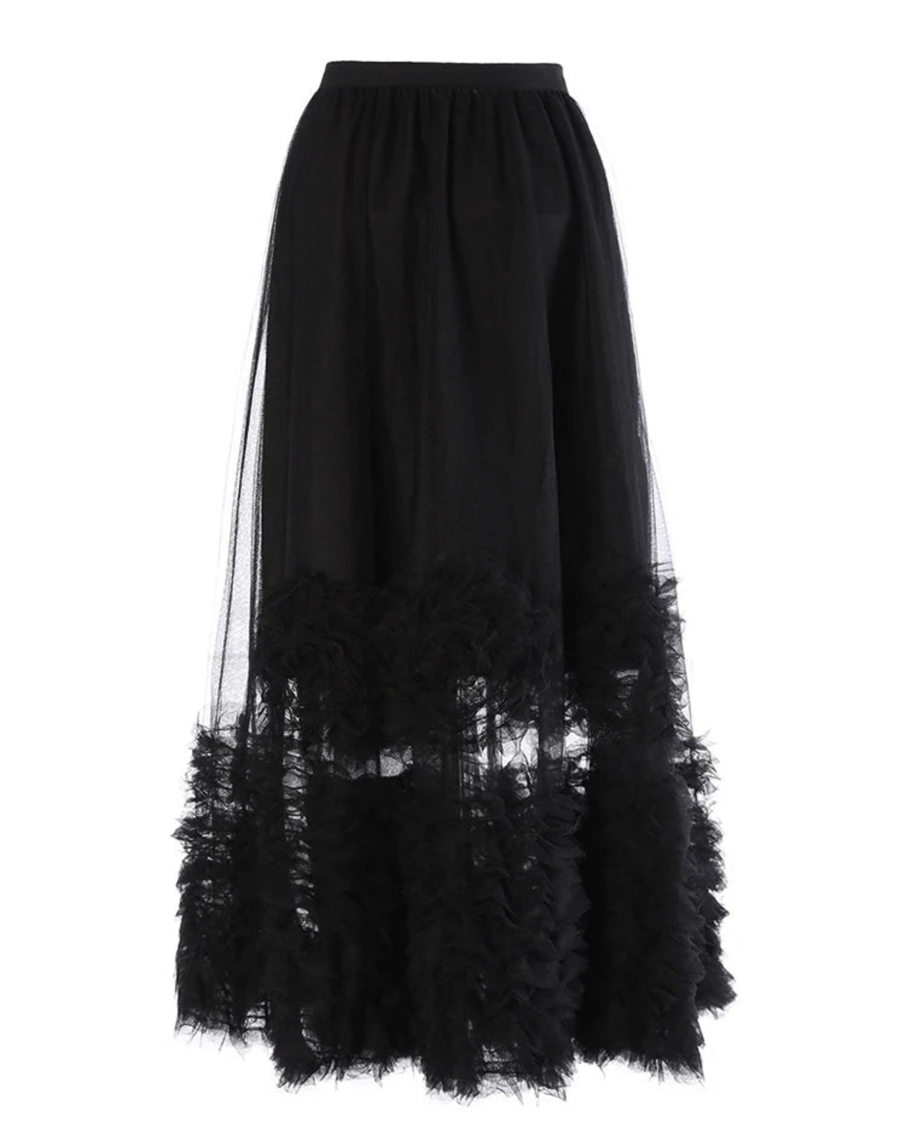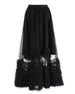 This luxurious tulle maxi skirt features a dramatic ruffle floral hem with sheer-panel sections, creating a bold and elegant silhouette.