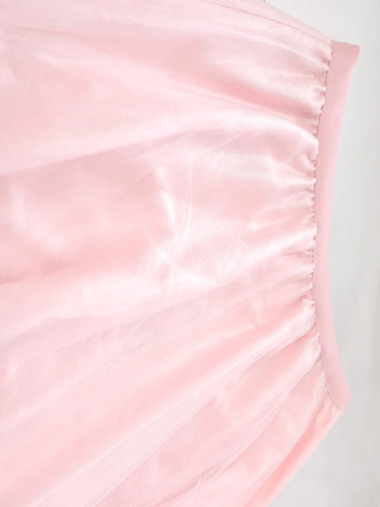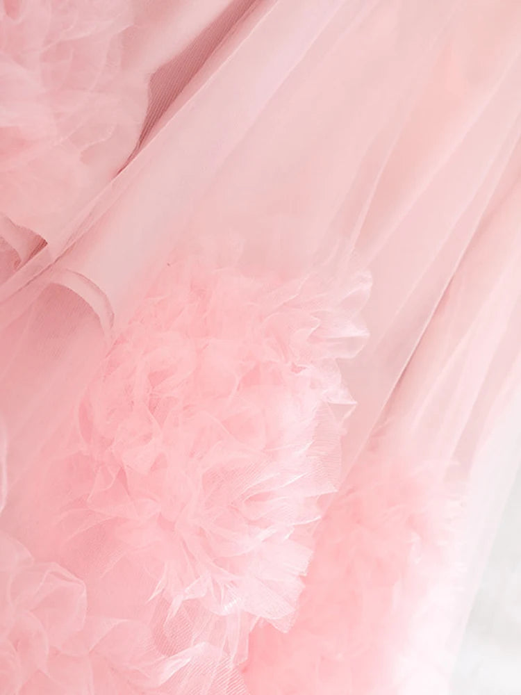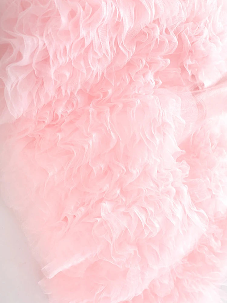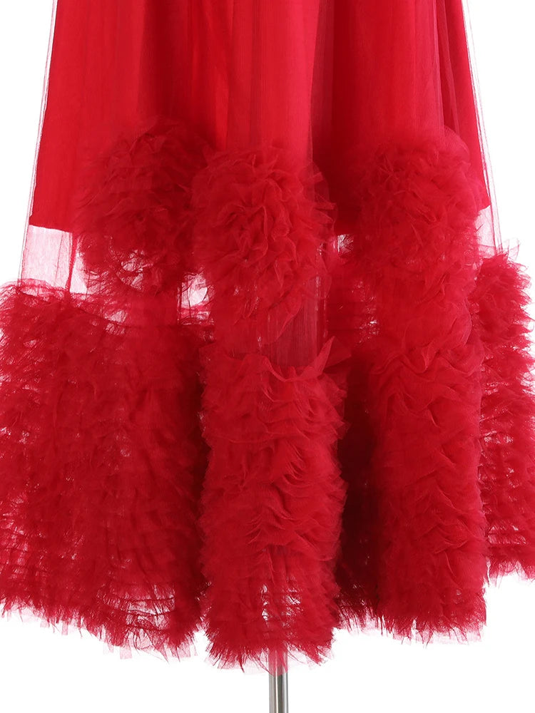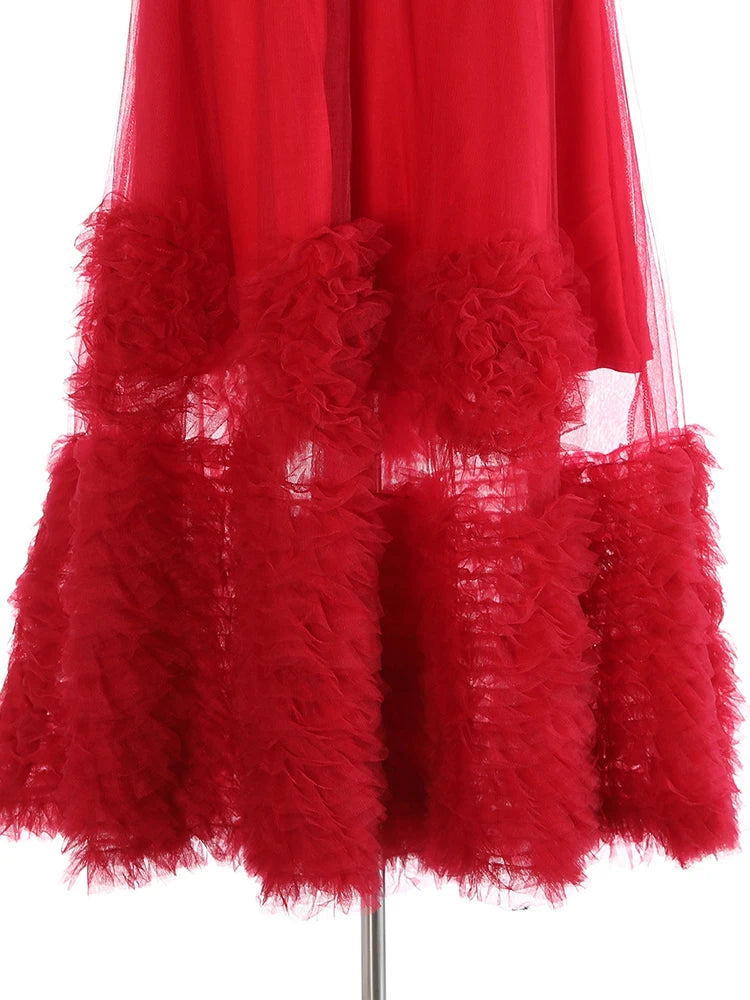 This luxurious tulle maxi skirt features a dramatic ruffle floral hem with sheer-panel sections, creating a bold and elegant silhouette.