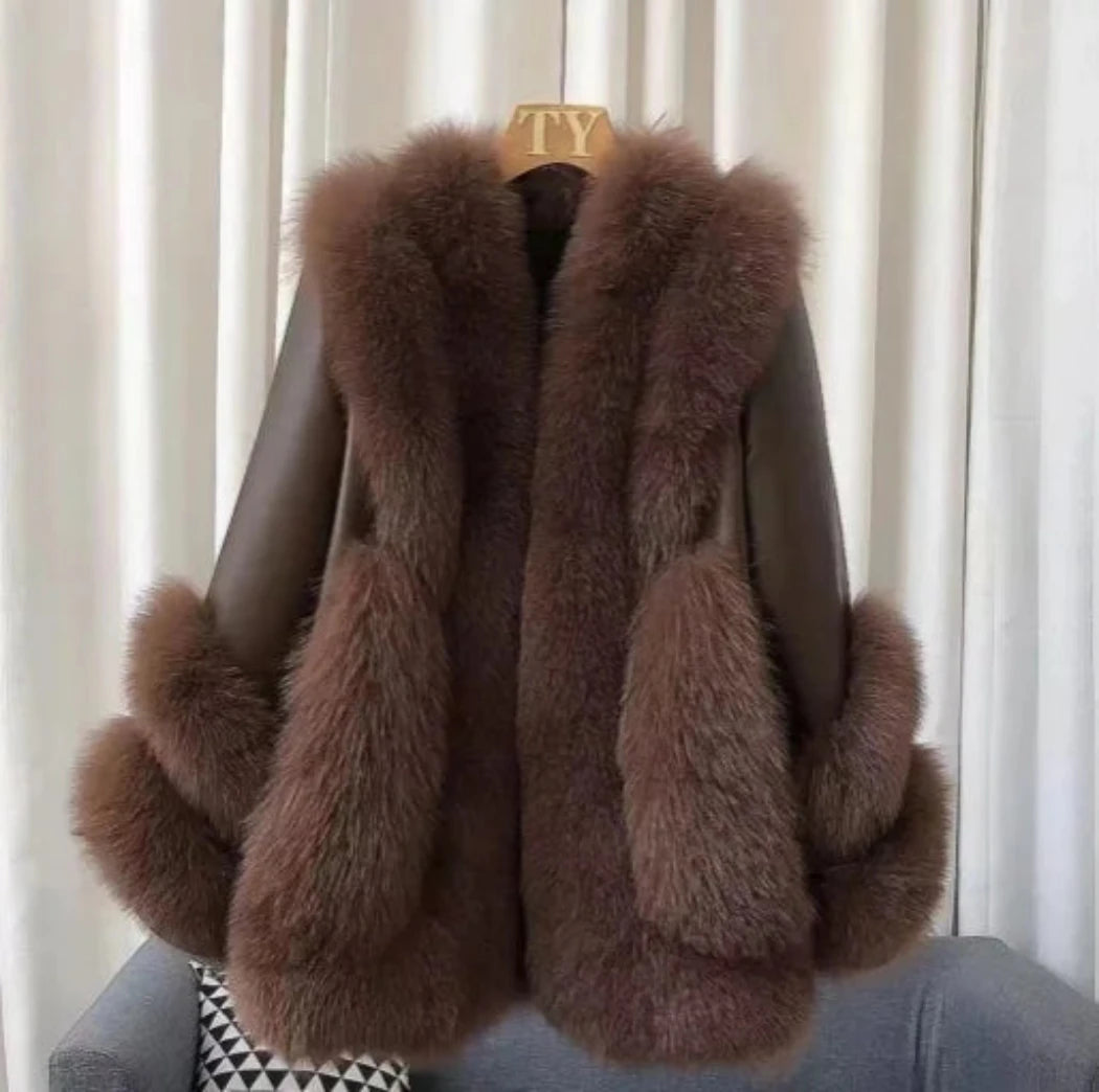 An elegant coat designed for ultimate sophistication. Featuring genuine fox fur and premium leather, it offers both luxurious warmth and timeless style.