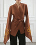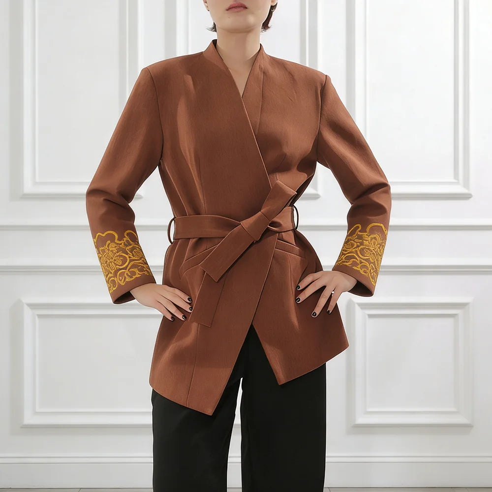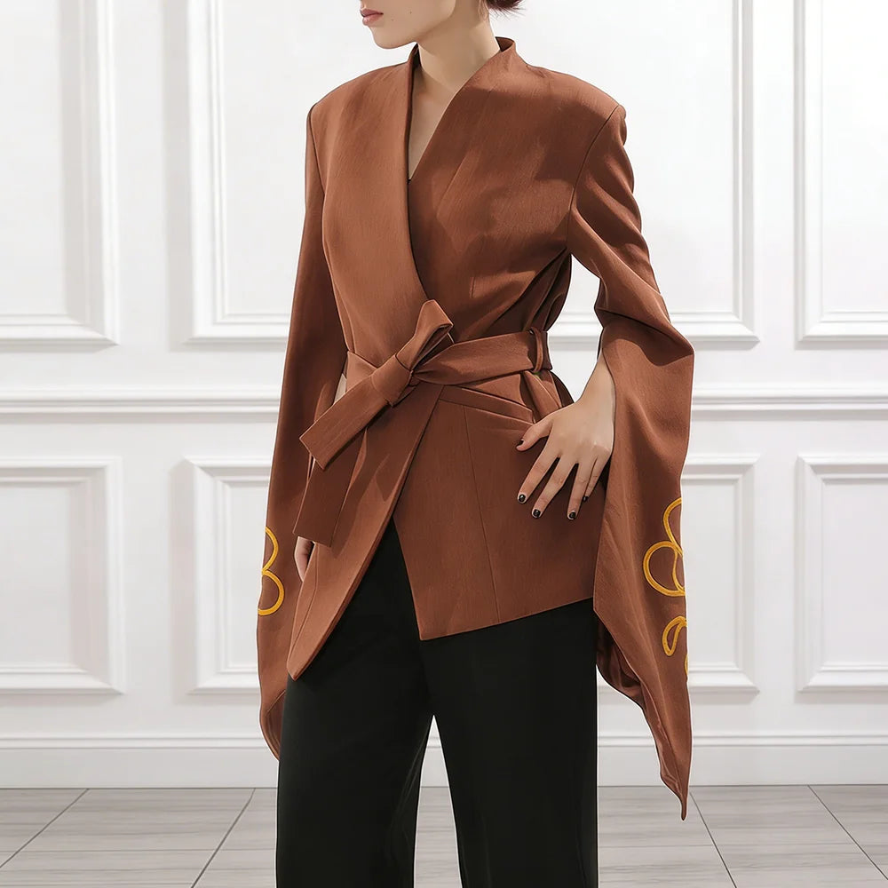 This elegant wrap blazer features dramatic wide flared sleeves with intricate golden-yellow thread embroidery.