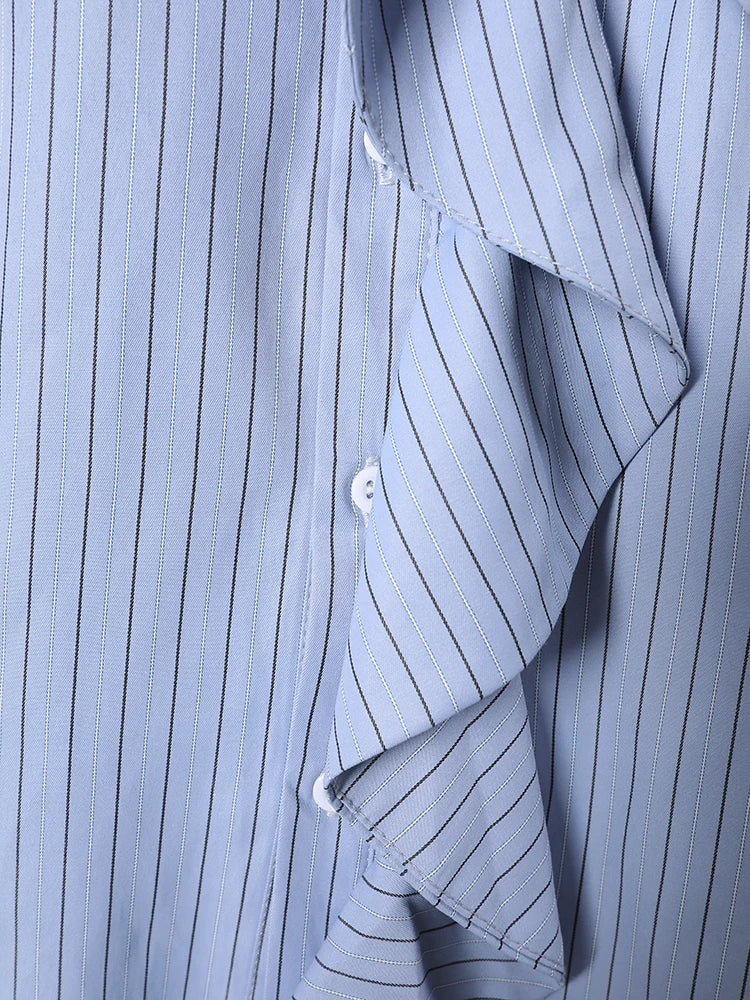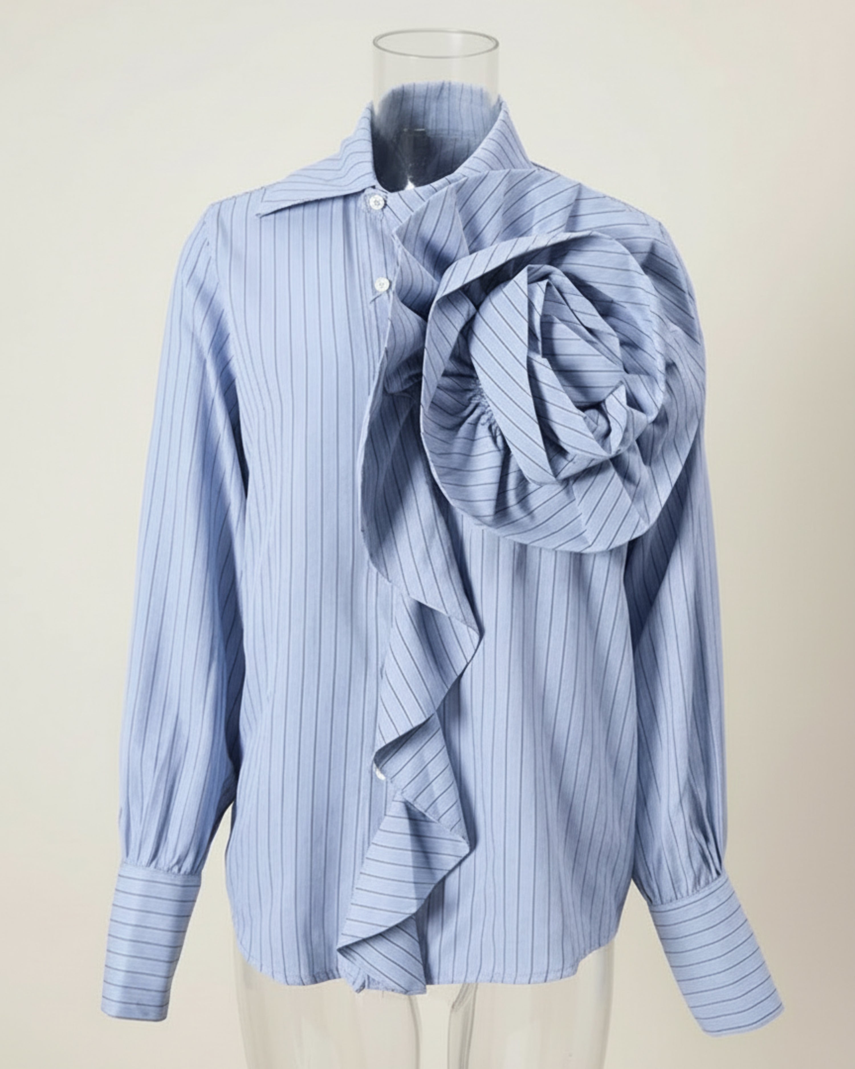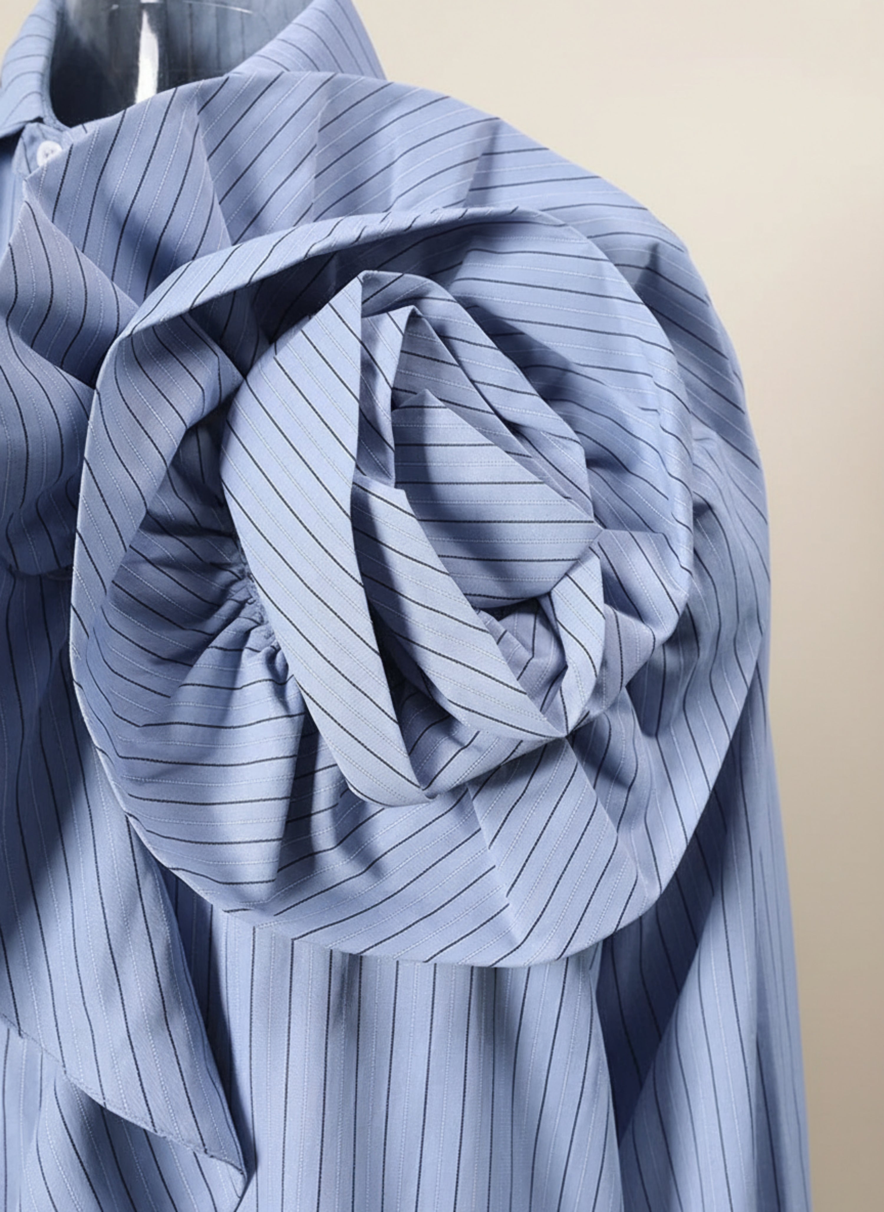 This luxurious oversized pinstriped button-down blouse features a dramatic three-dimensional fabric rose applique with cascading ruffle detail on the shoulder and side.