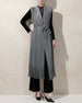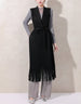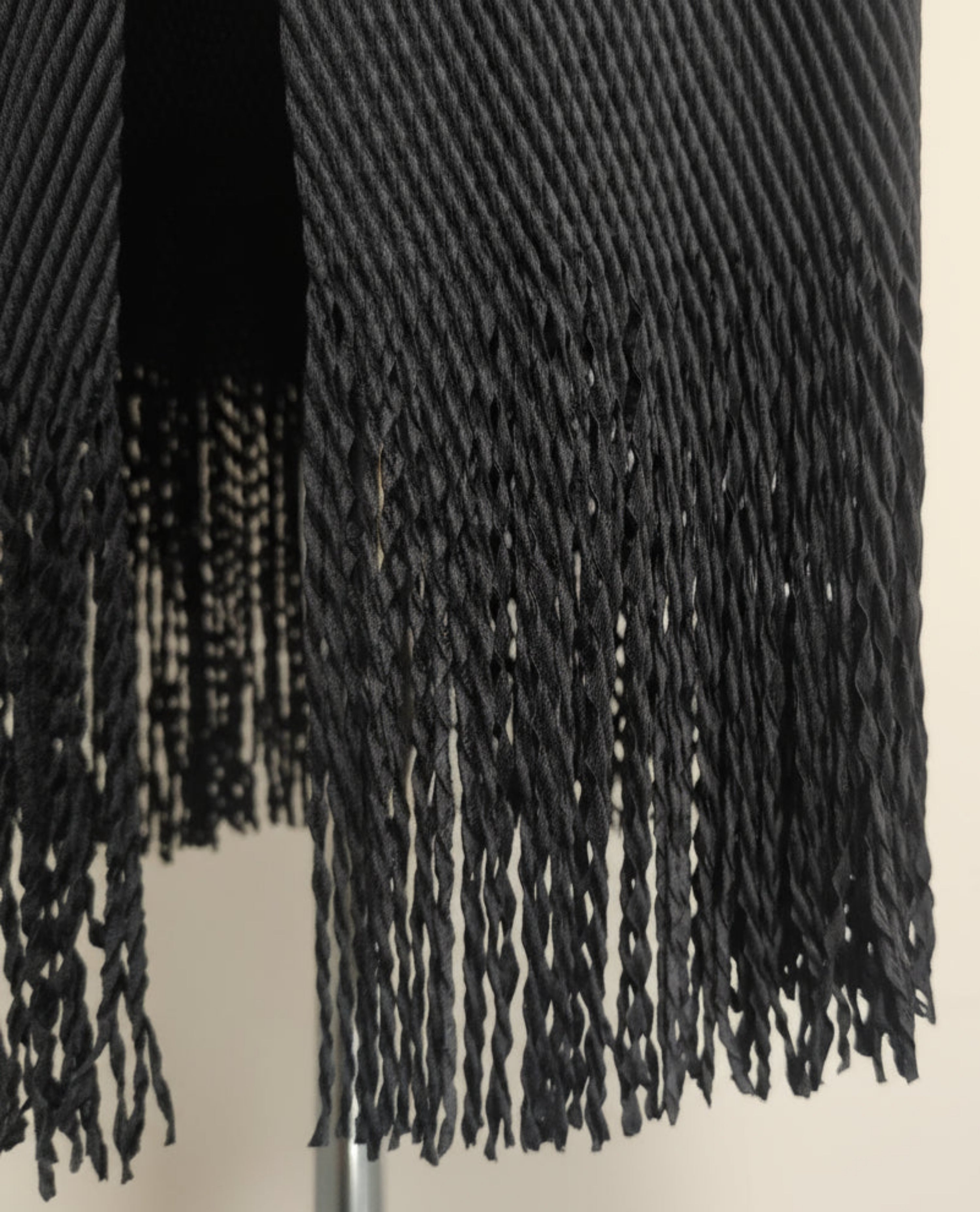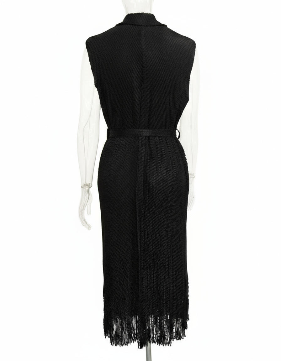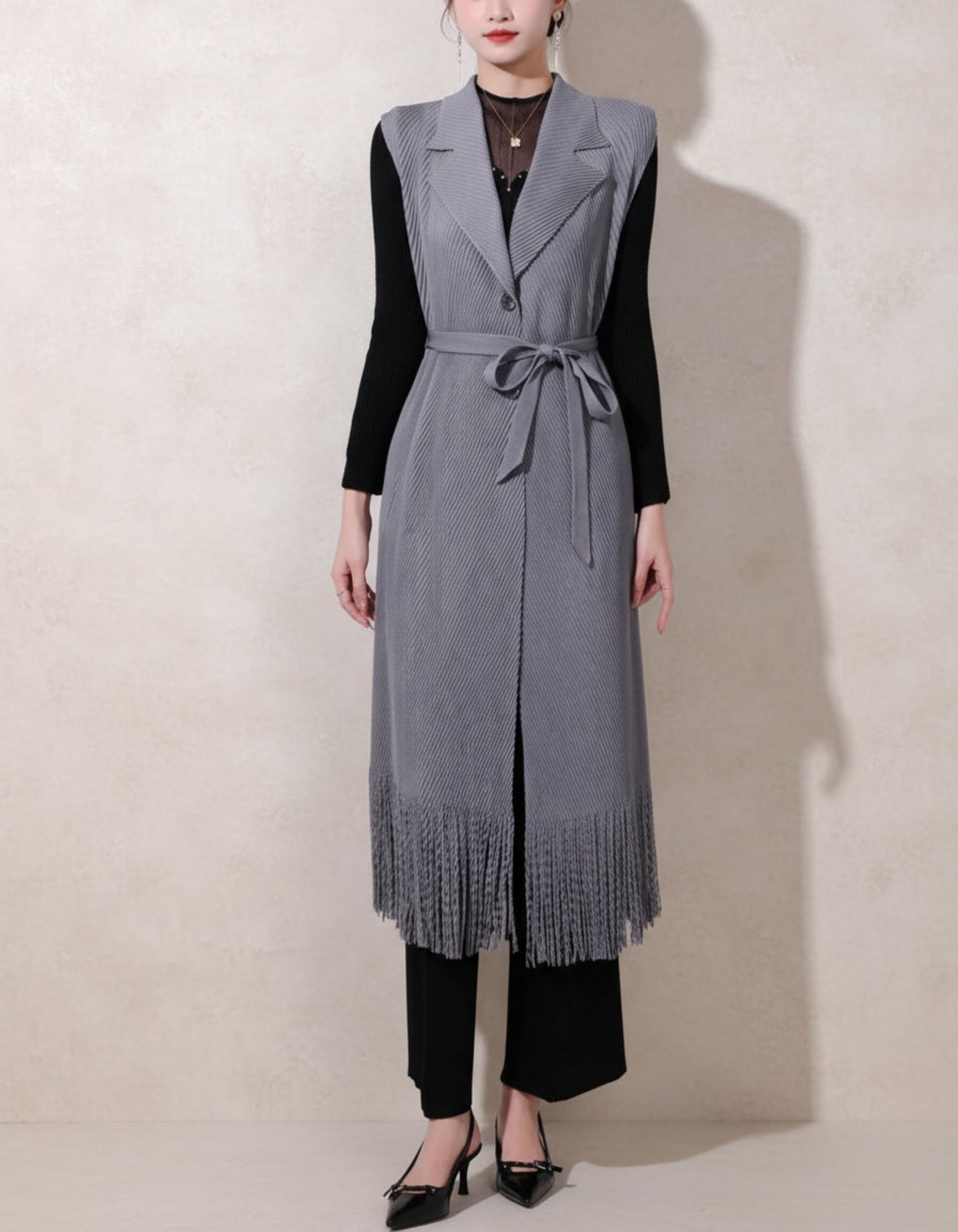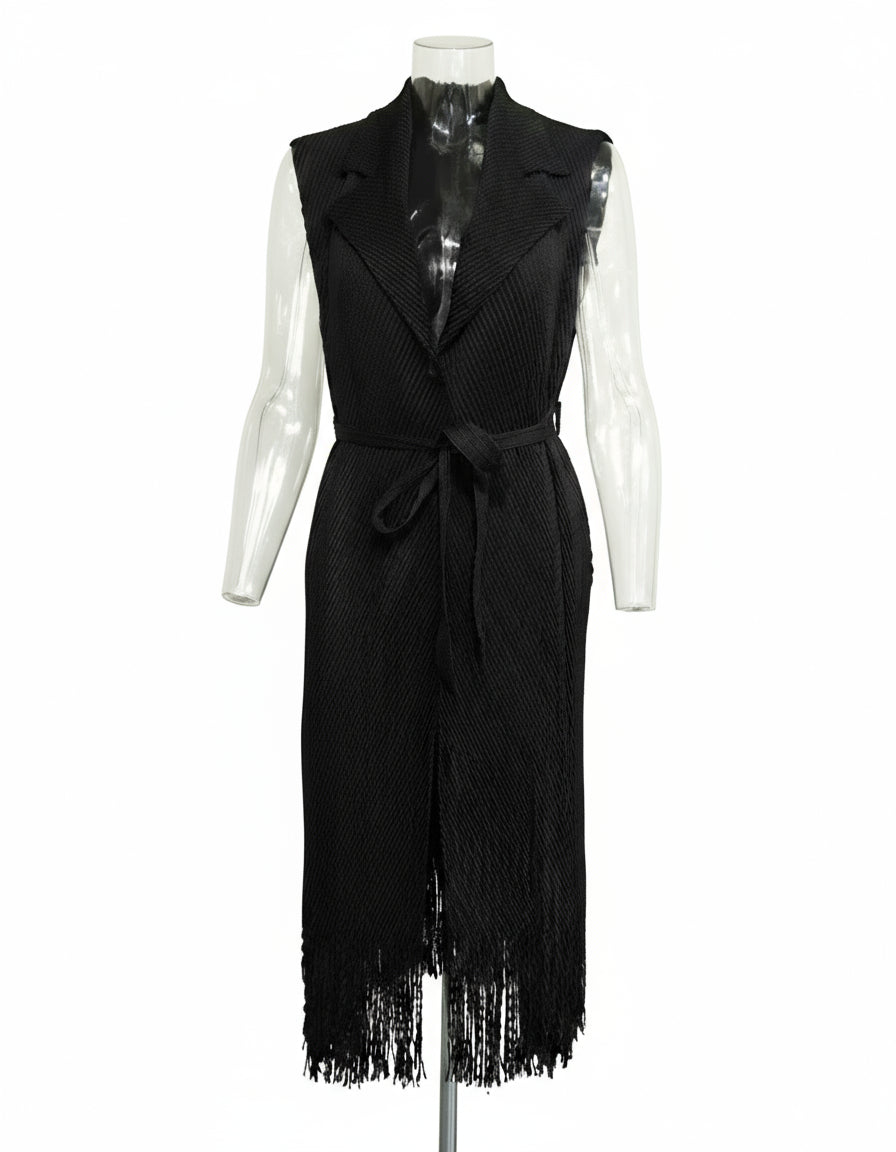 The extra-long cut and fringe hem add movement and sophistication, making it a standout layer for day or evening. Wrinkle-resistant, stretchy, and easy to maintain — designed for travel, business, and elevated occasions.
