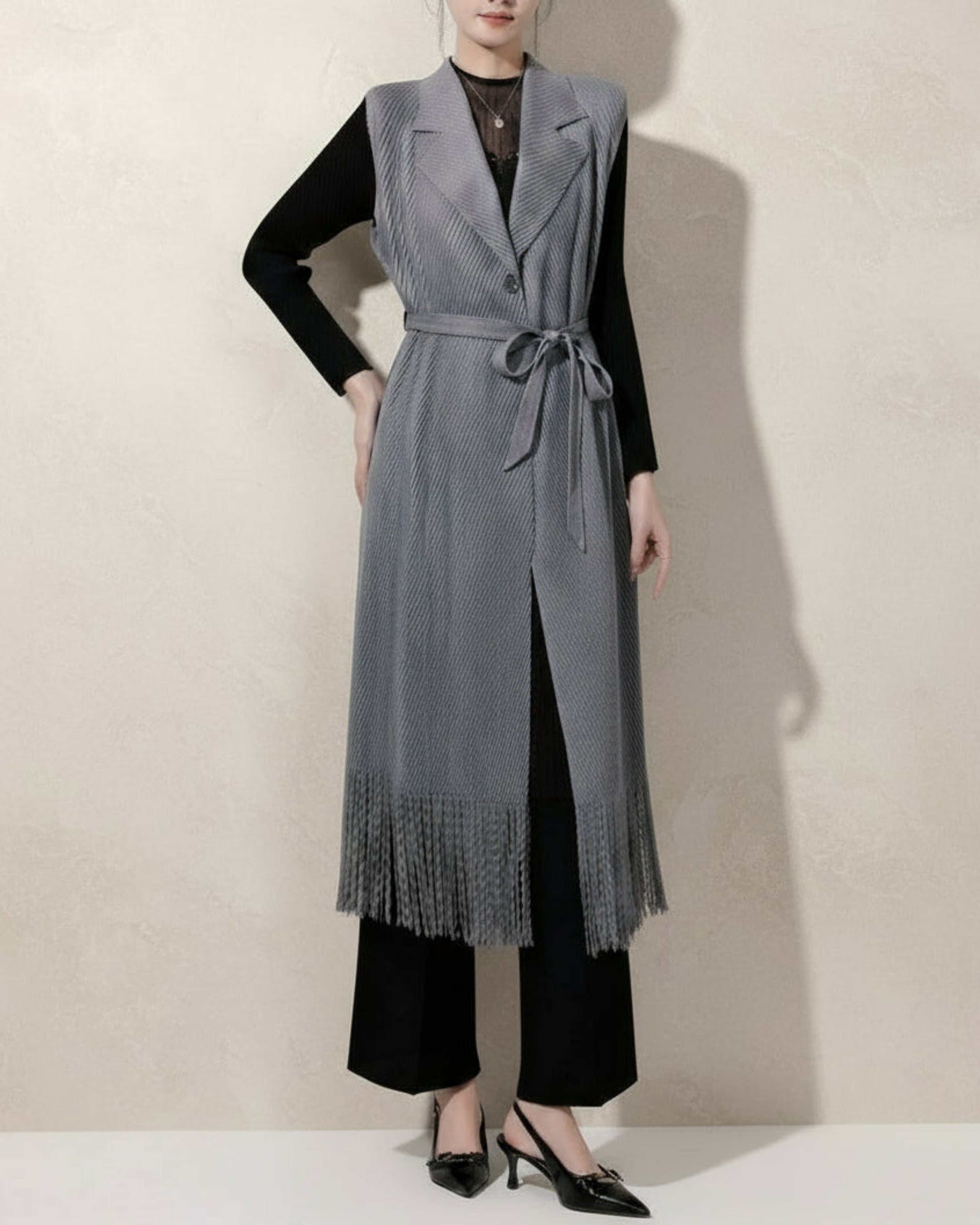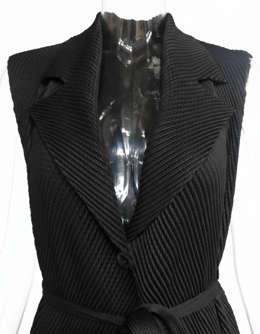 This longline vest features intricate Japanese plissé pleats that create a flowing, sculpted shape.