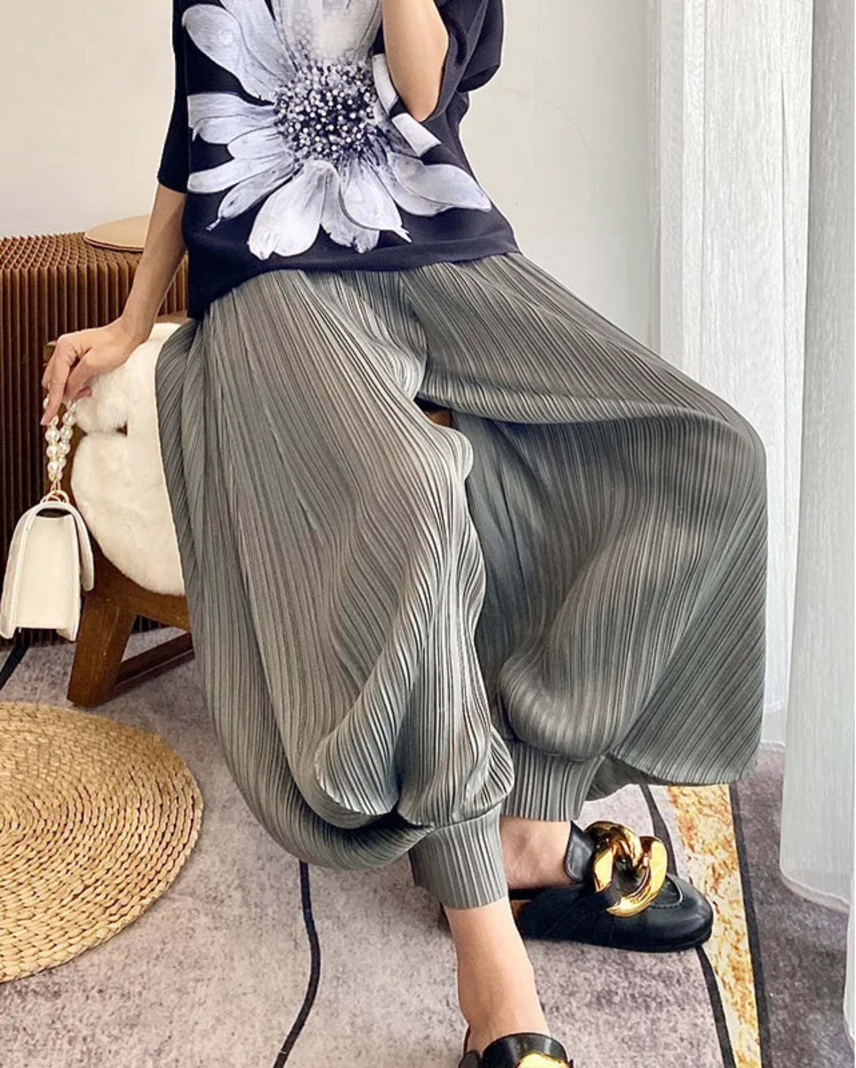 Made from premium Japanese pleated knit, they are stretchy, comfortable, and move beautifully, while the cuffed jogger-style ankle adds a modern twist—perfect for travel, evening, or cruise wear.
