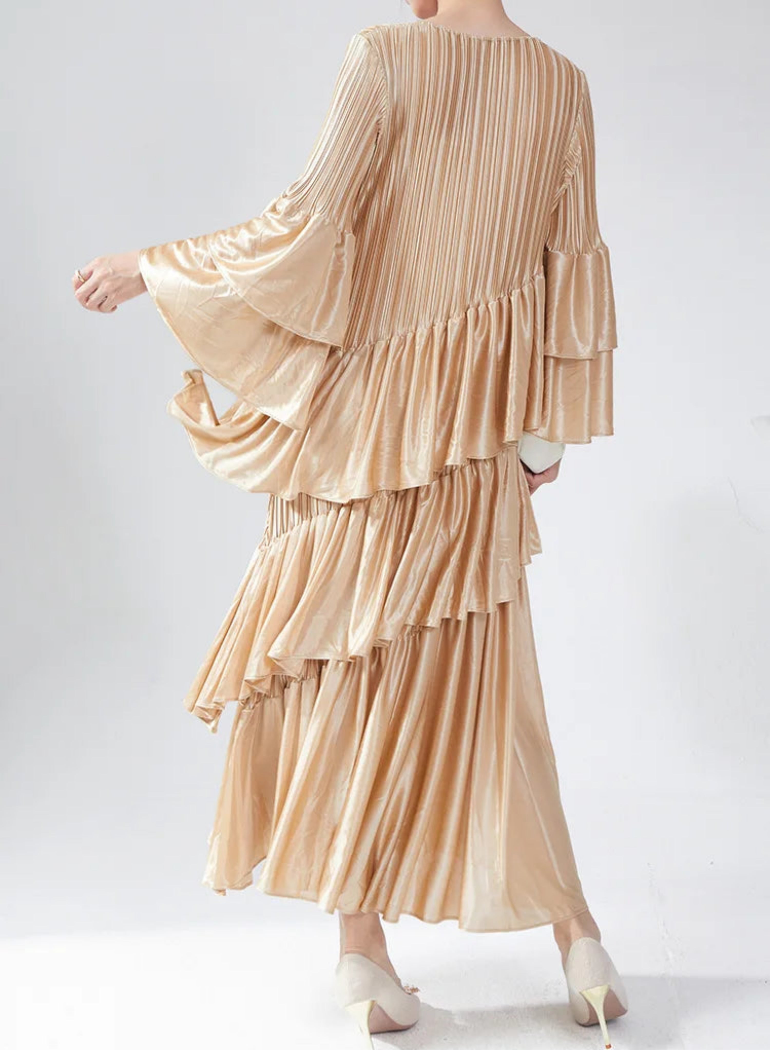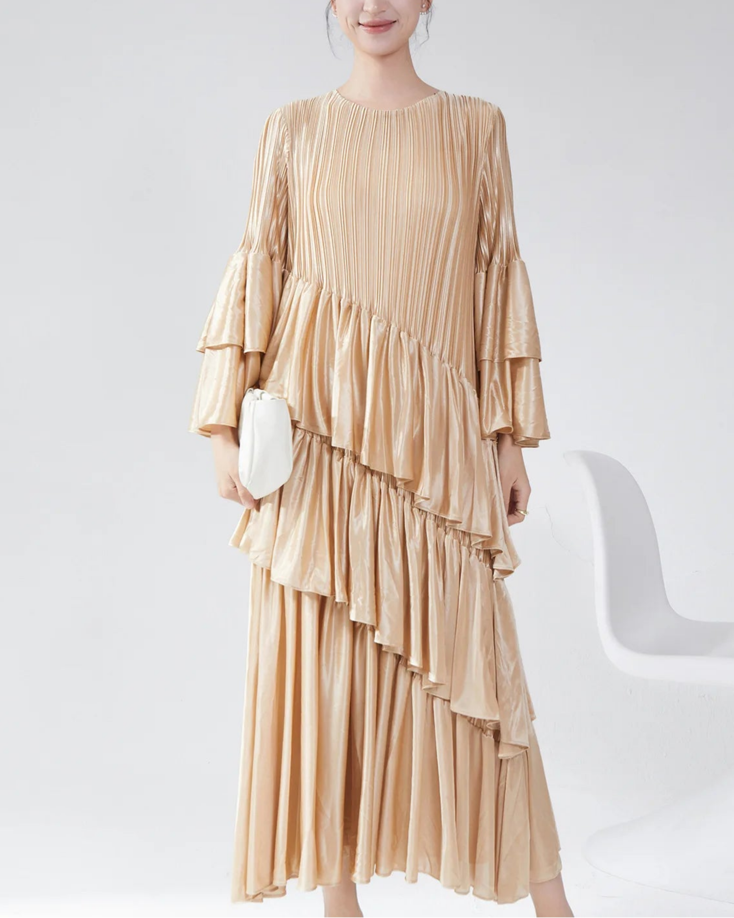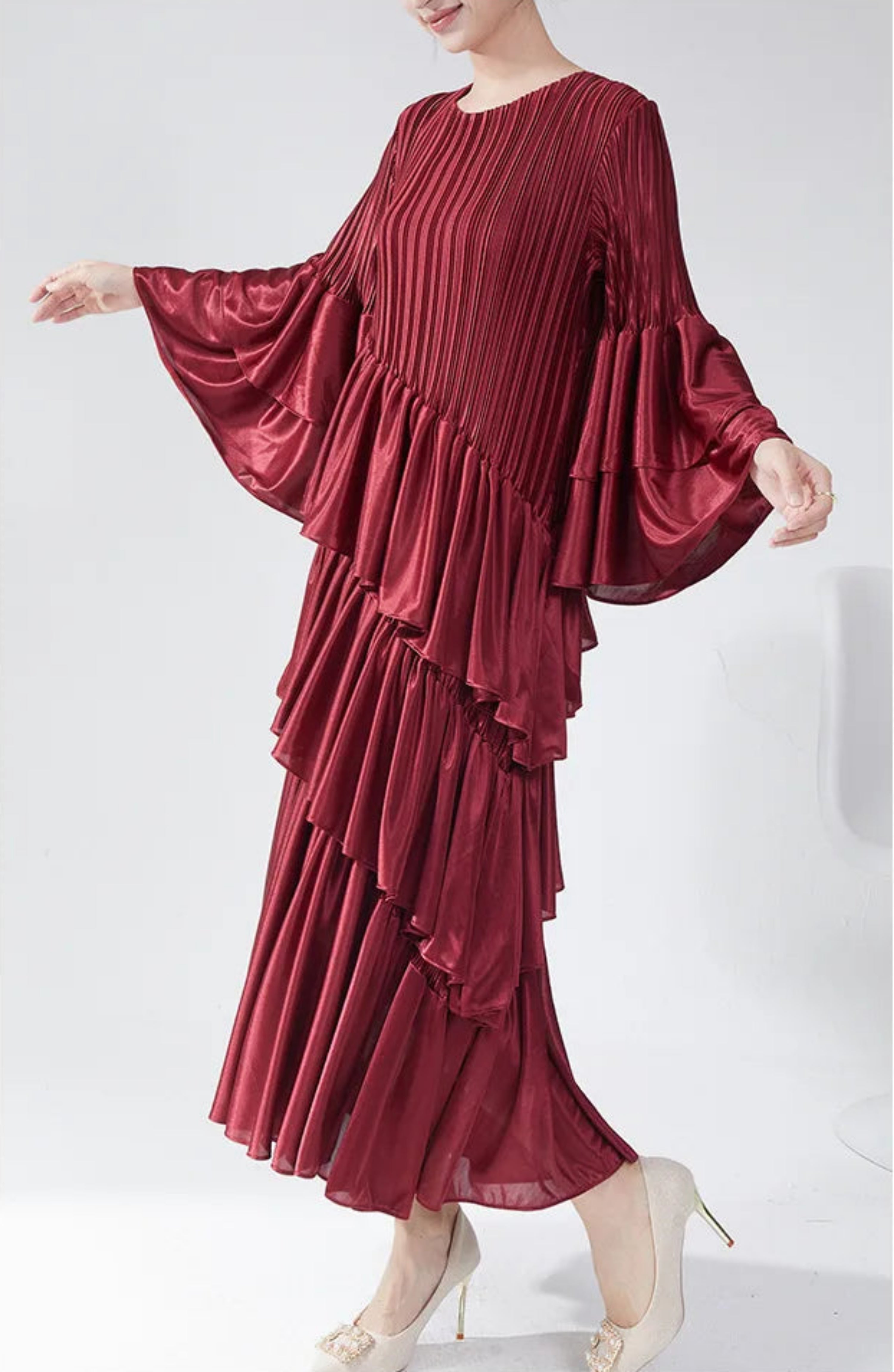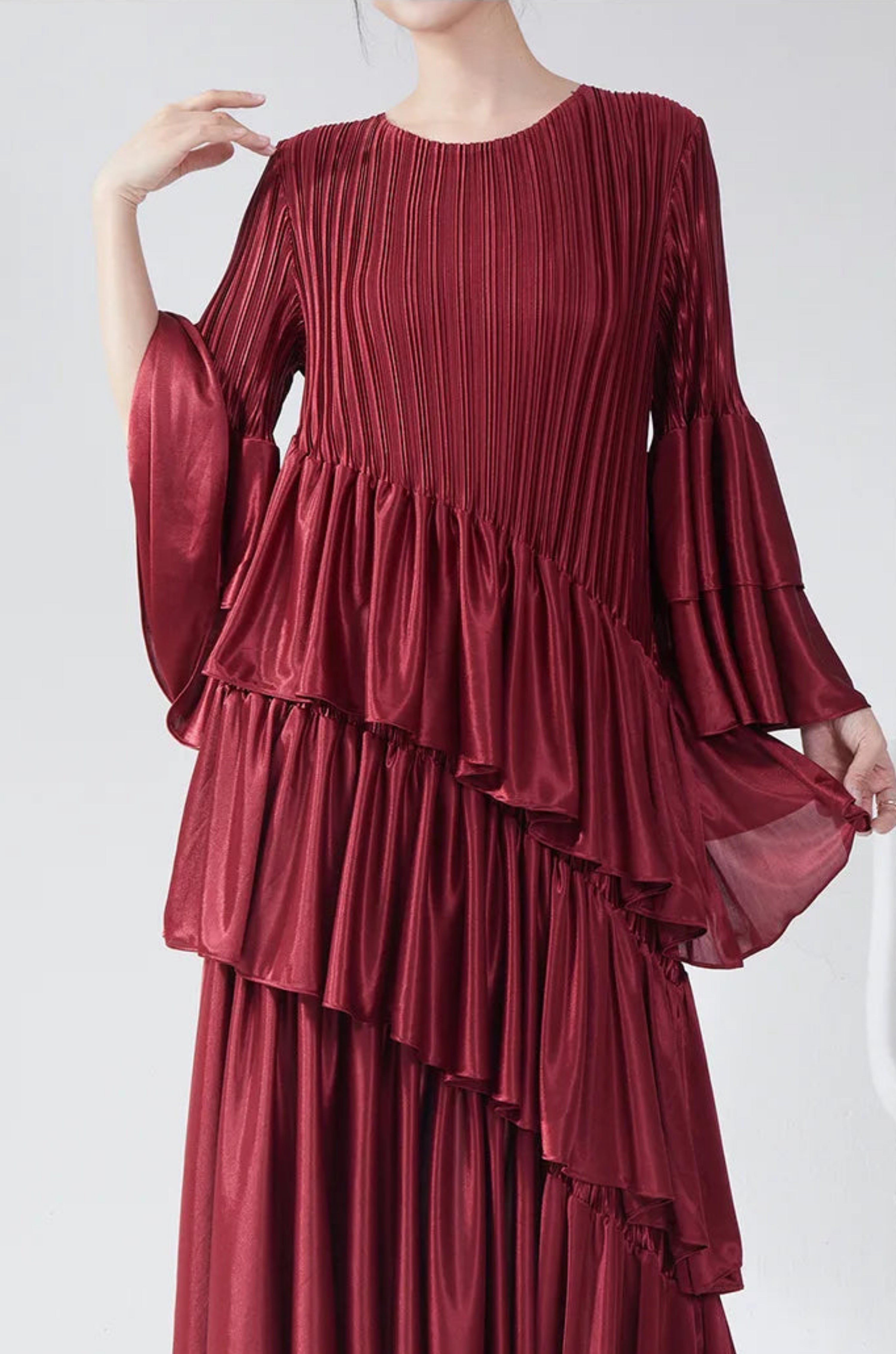 This luxurious midi dress features premium Japanese pleats with a unique texture, fluid drape, and elegant, unique bell-sleeves with ruffle detailing.