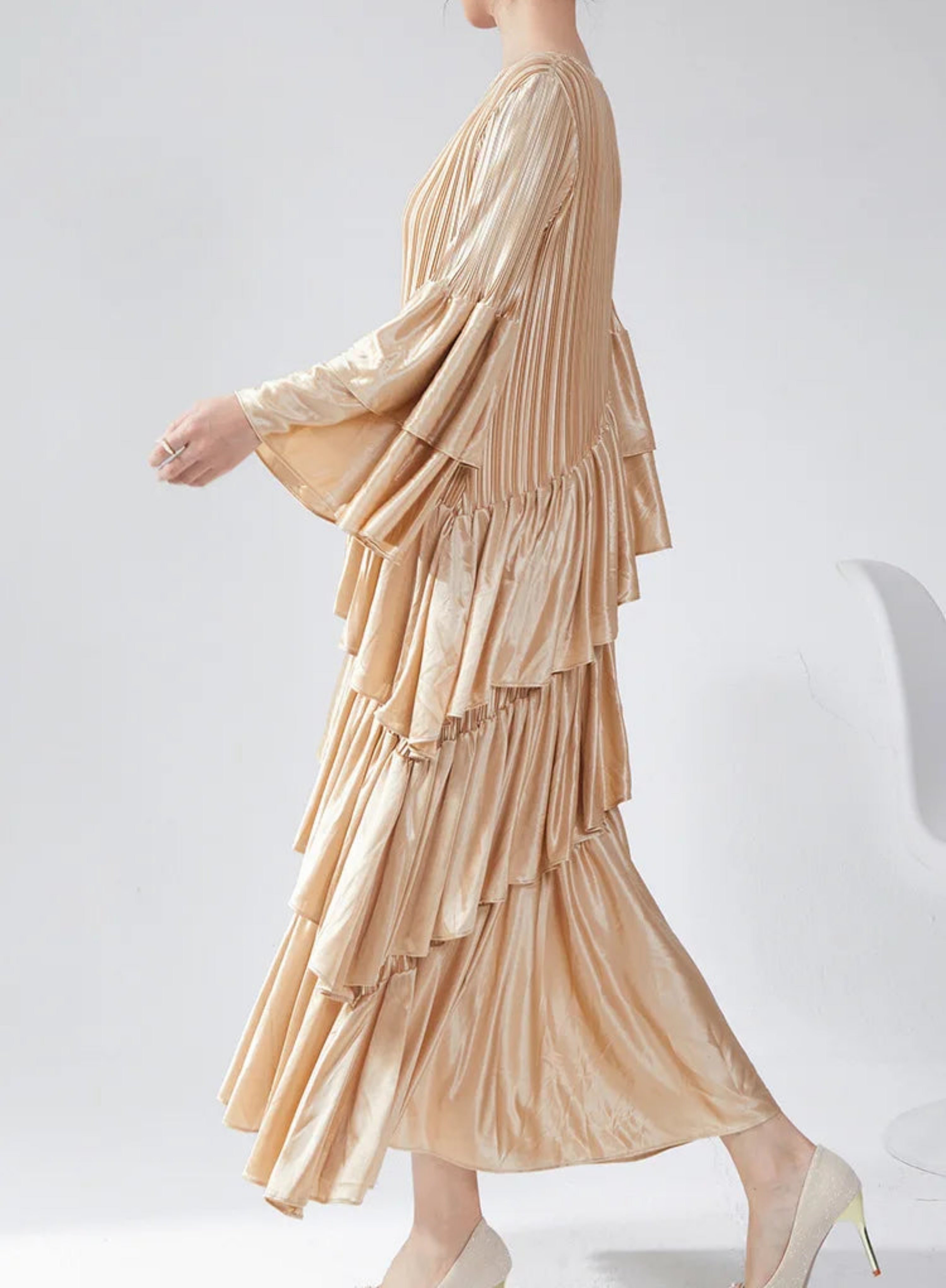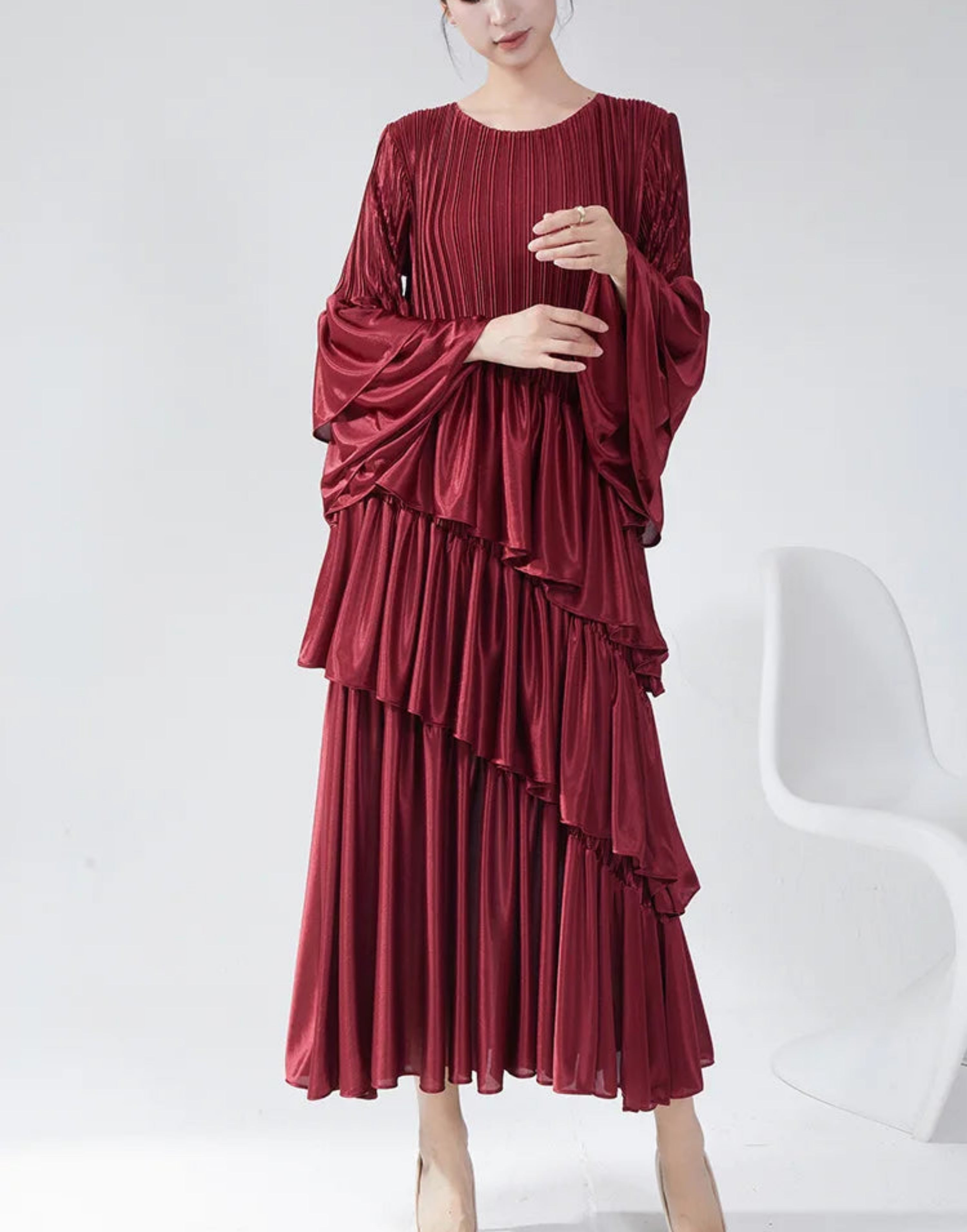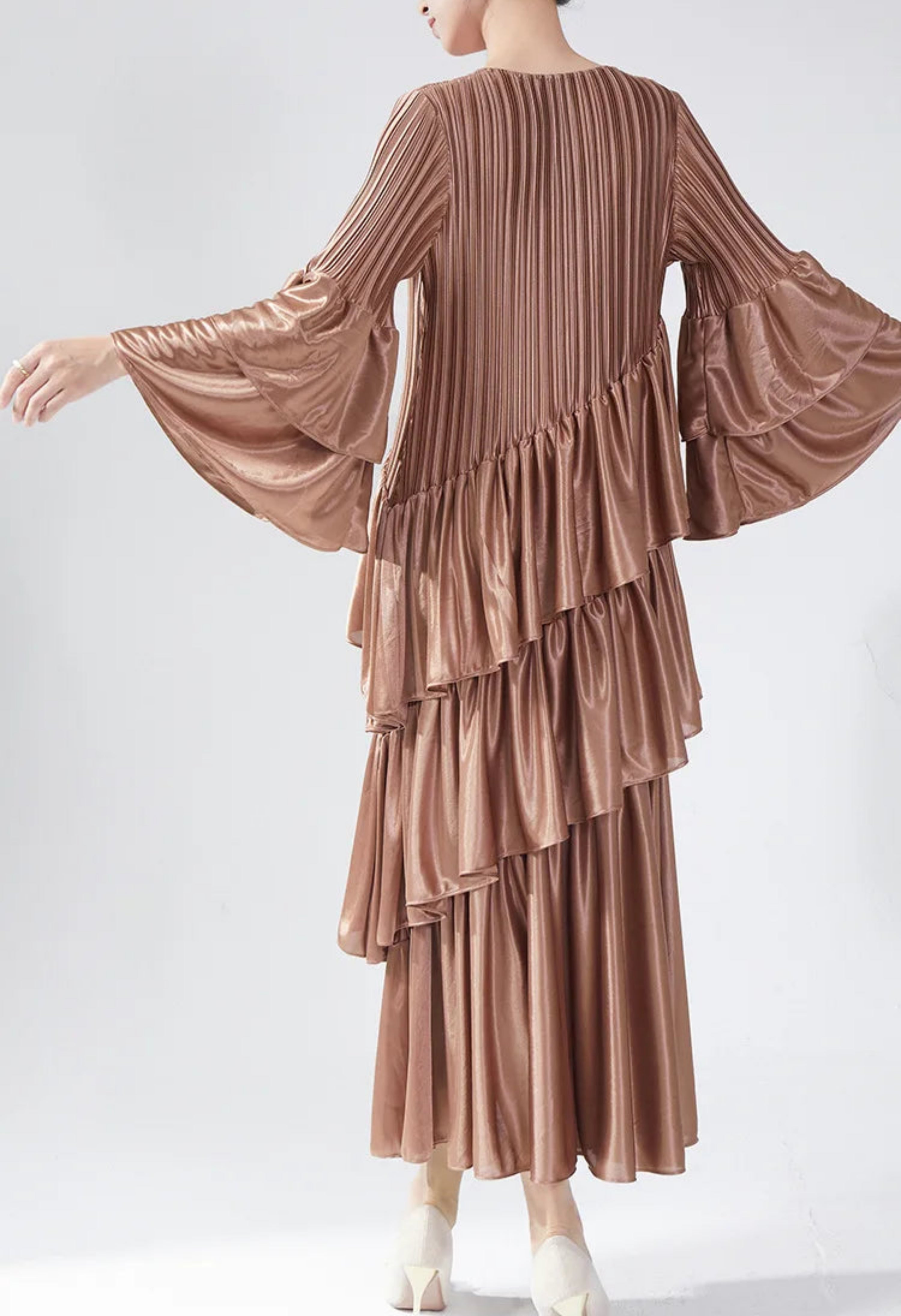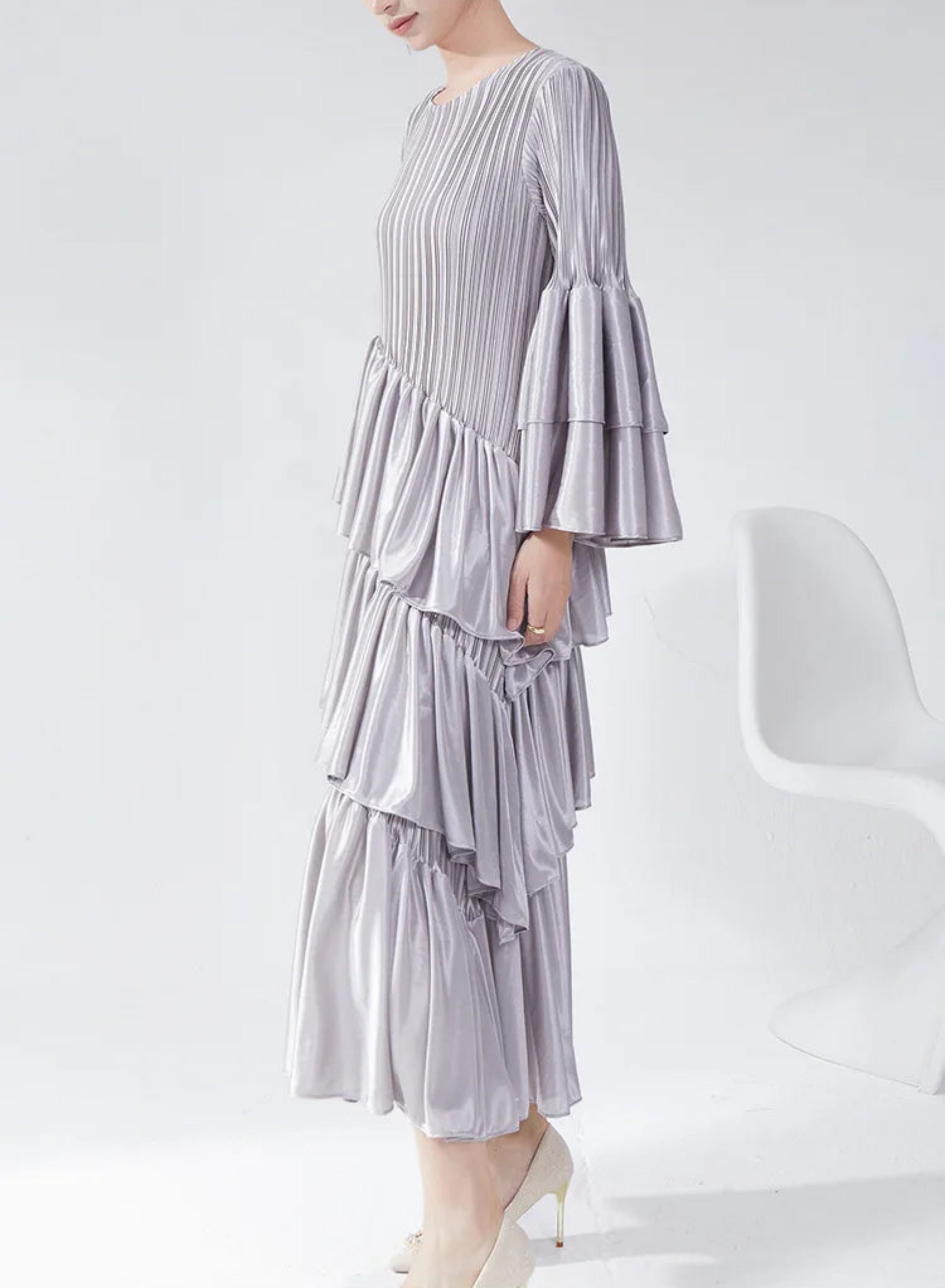 This luxurious midi dress features premium Japanese pleats with a unique texture, fluid drape, and elegant, unique bell-sleeves with ruffle detailing.