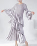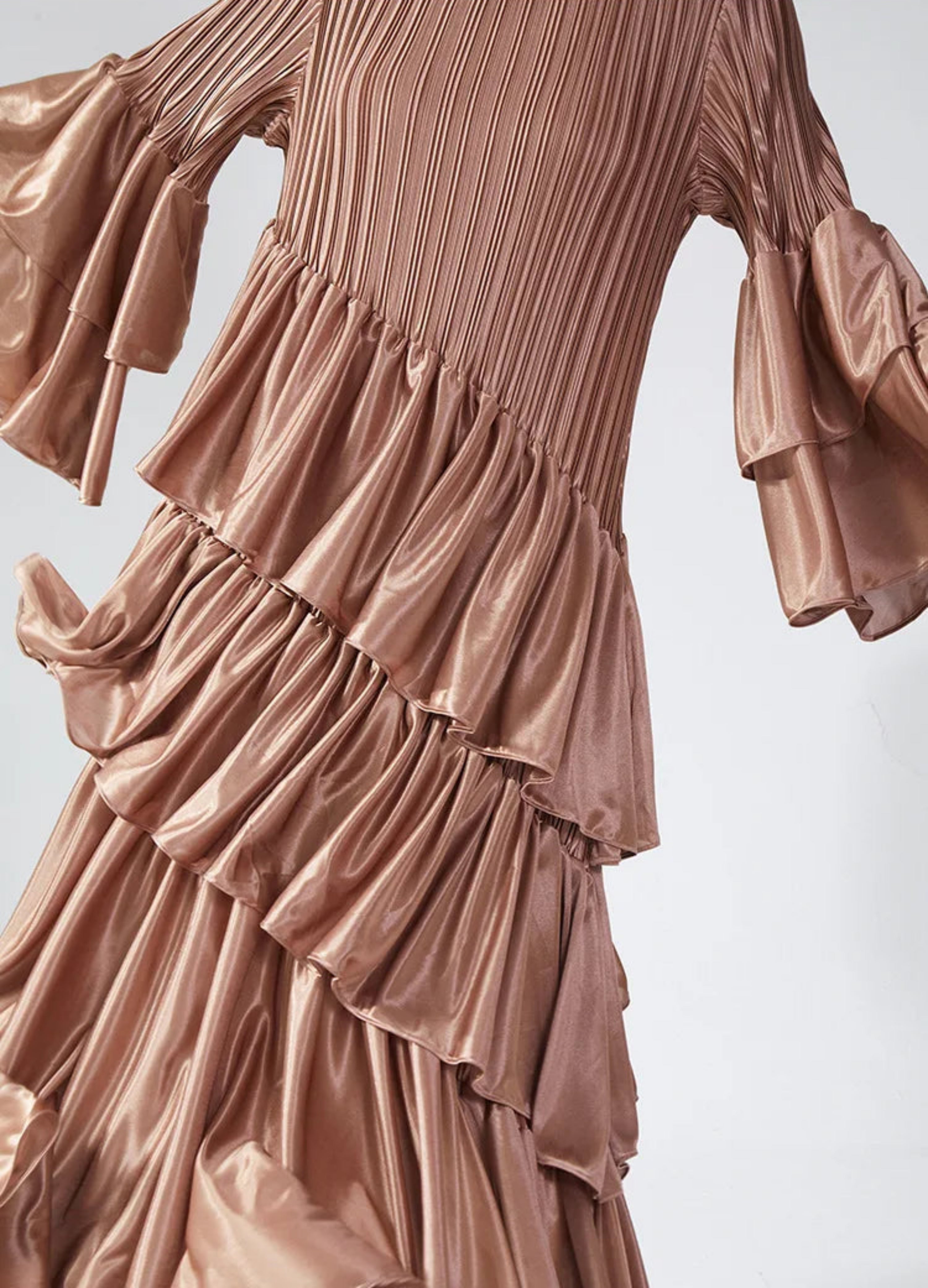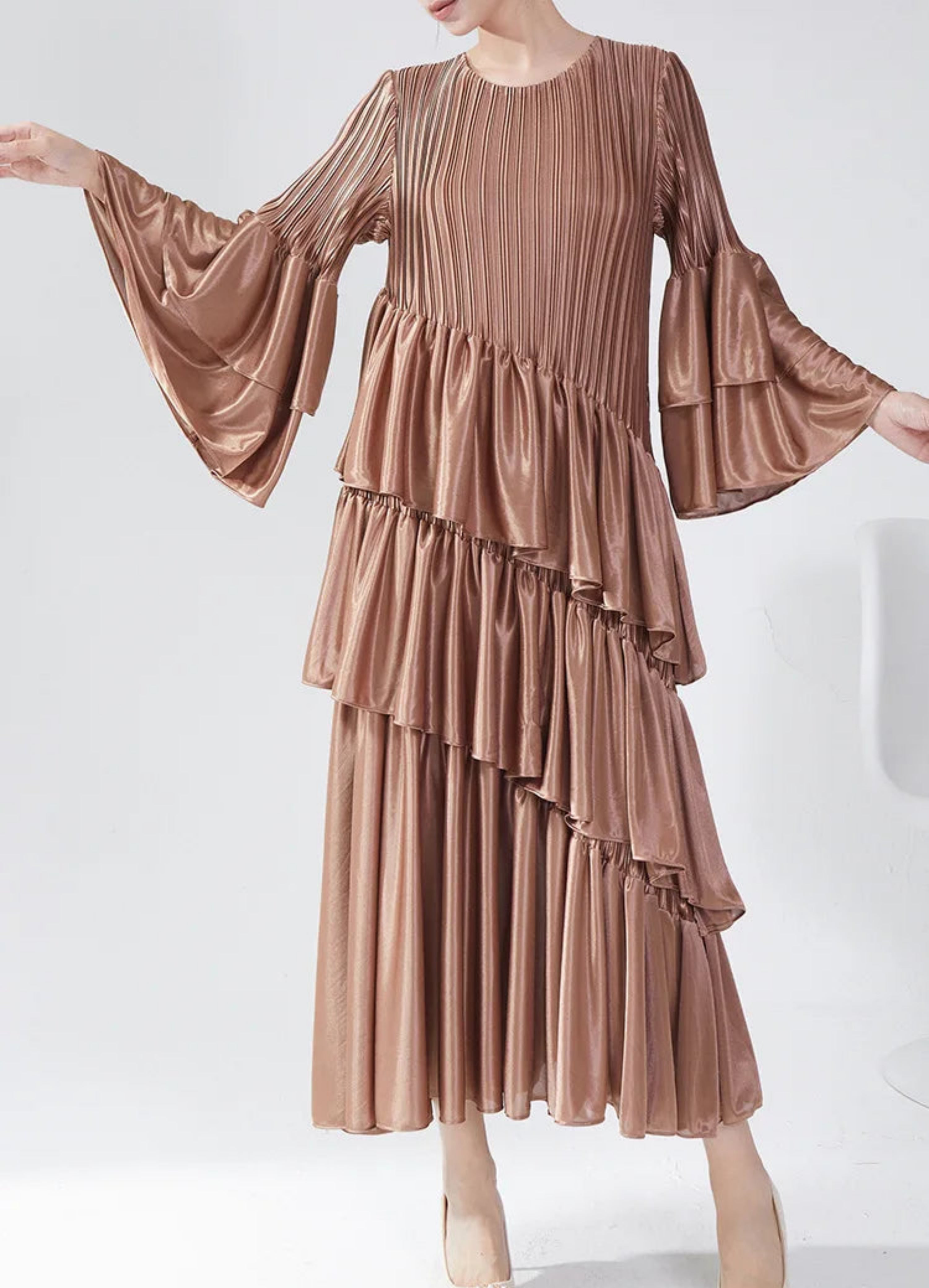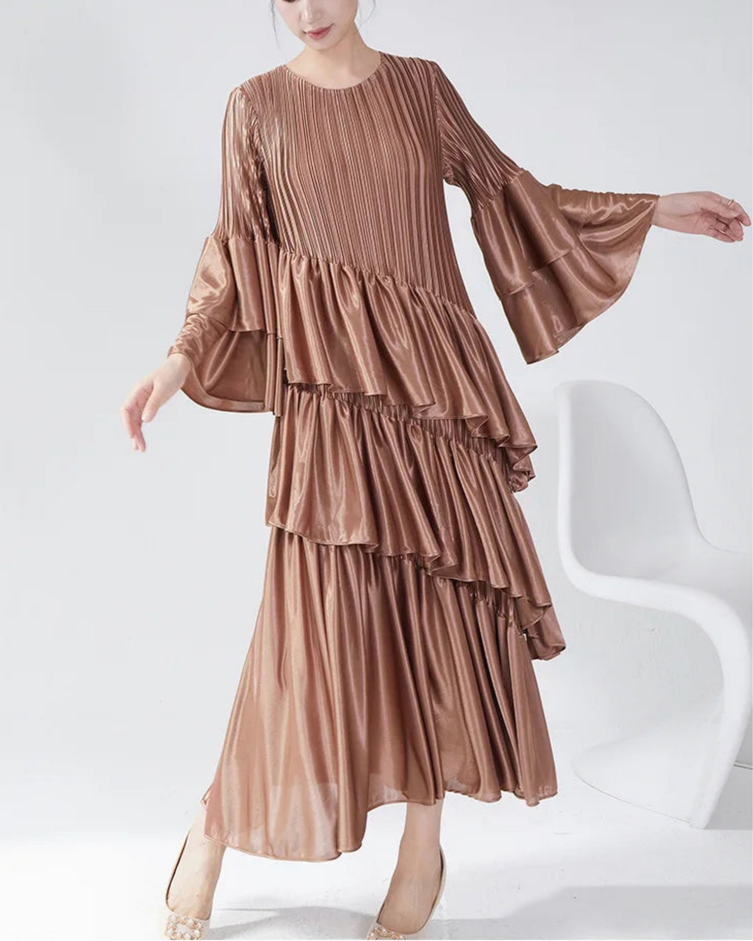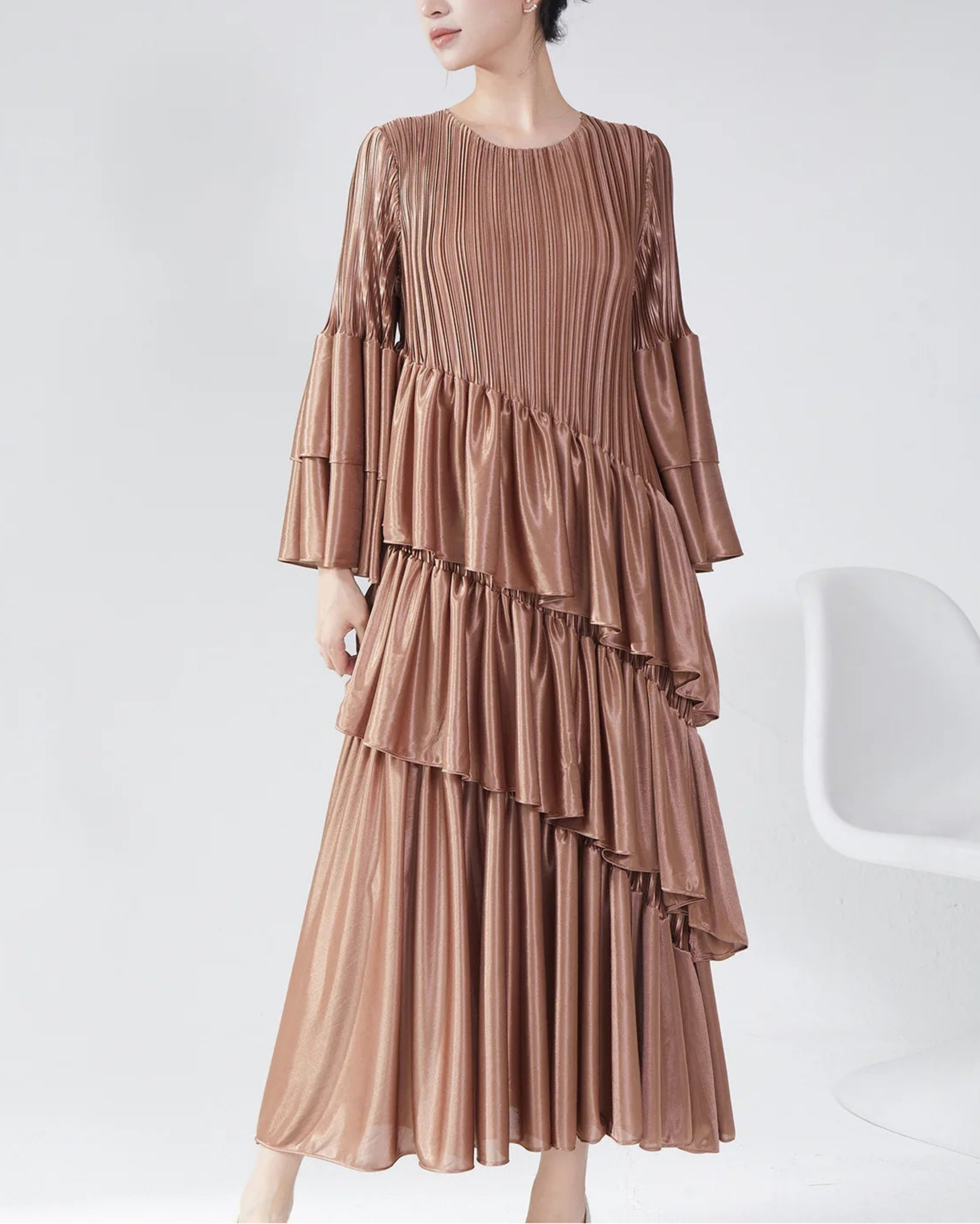 This luxurious midi dress features premium Japanese pleats with a unique texture, fluid drape, and elegant, unique bell-sleeves with ruffle detailing.