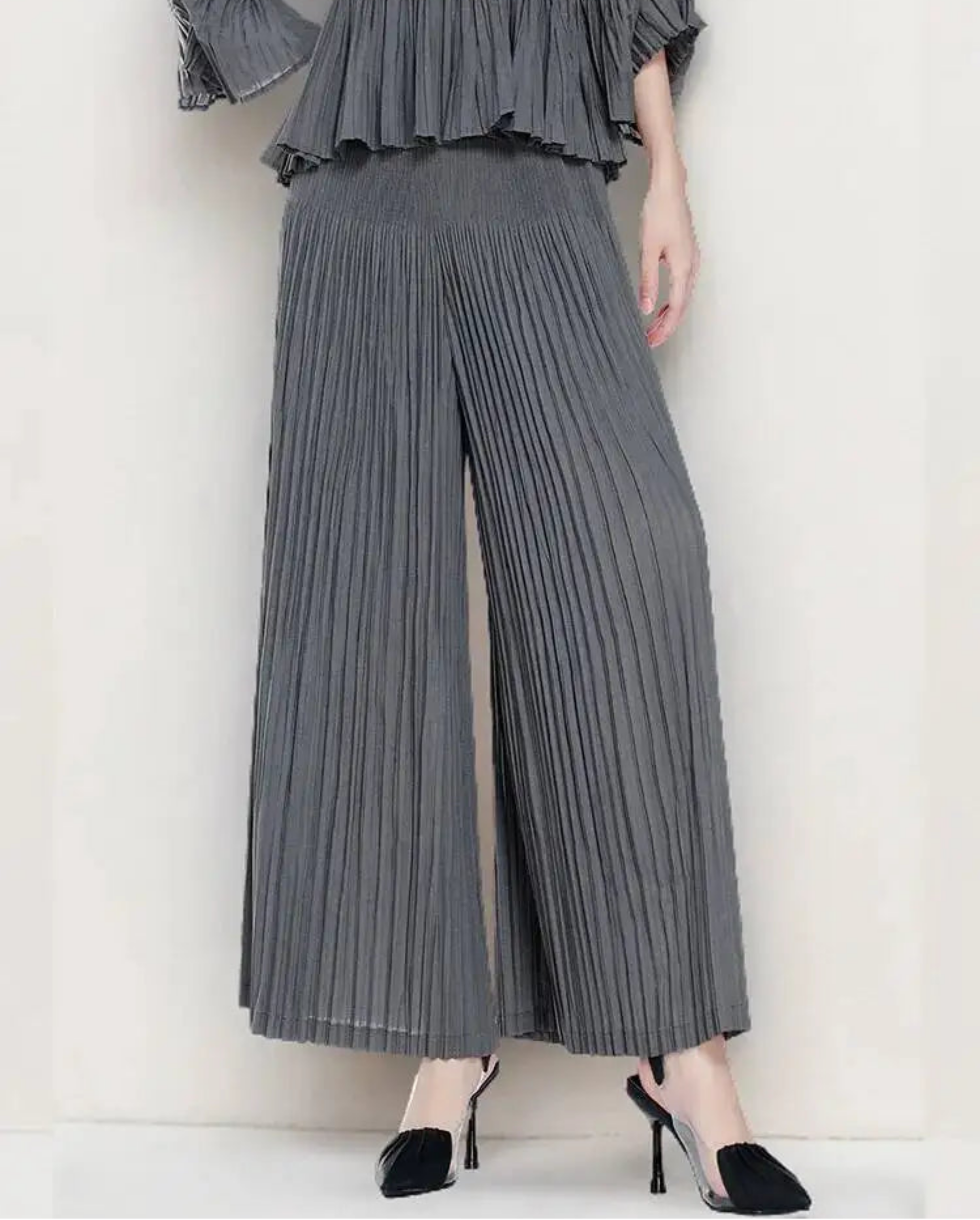 These elegant wide-leg pants feature premium Japanese pleats and a stretchy elastic waistband for a comfortable, flattering fit.