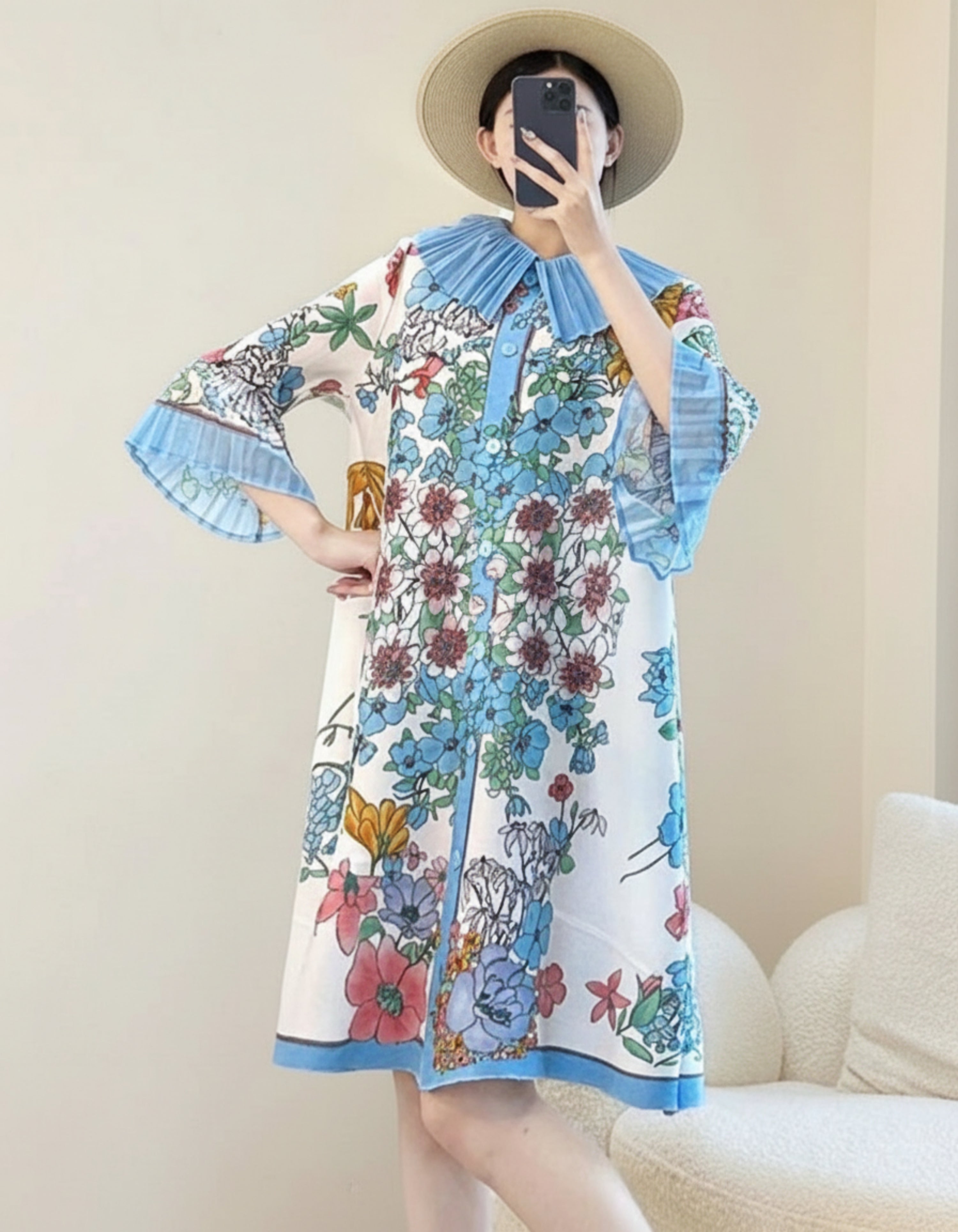 This floral pleated tunic brings a soft, fluid shape with premium Japanese plissé that highlights its ruffled collar and cuff detailing.