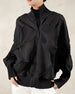 This comfortable yet stylish jacket features a high-neck collar and full-length zipper. The body displays a geometric pleated pattern for a modern, architectural look.