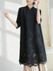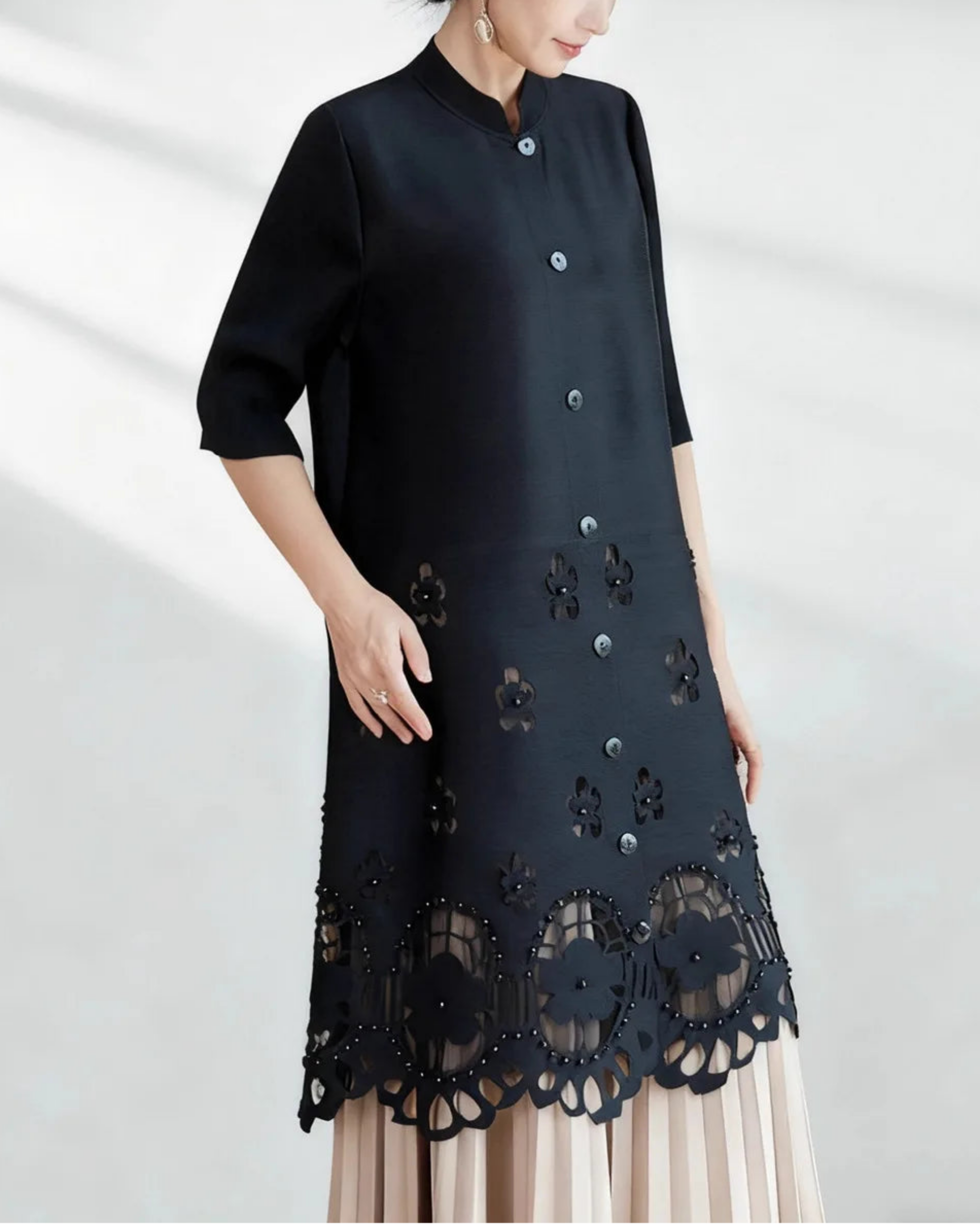 Elegant wrinkle-resistant, comfortable, stretchy Japanese plissé drapes in a long-length tunic top, perfect for everyday wear, travel, cruise, or formal days. The lower half features floral embroidery and laser-cut patterns.