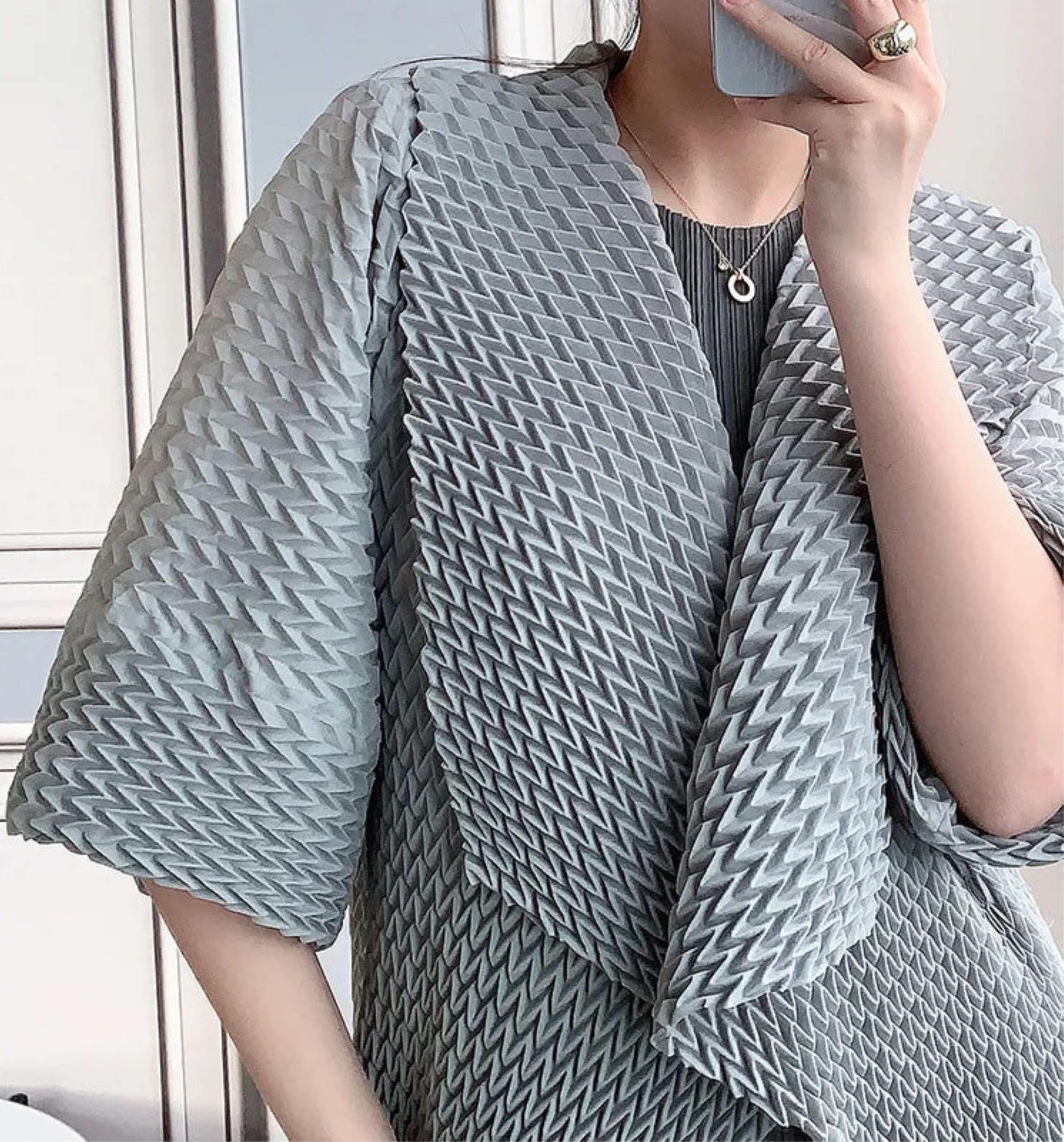This luxurious open-front jacket features premium Japanese plissé pleats with a unique geometric texture.