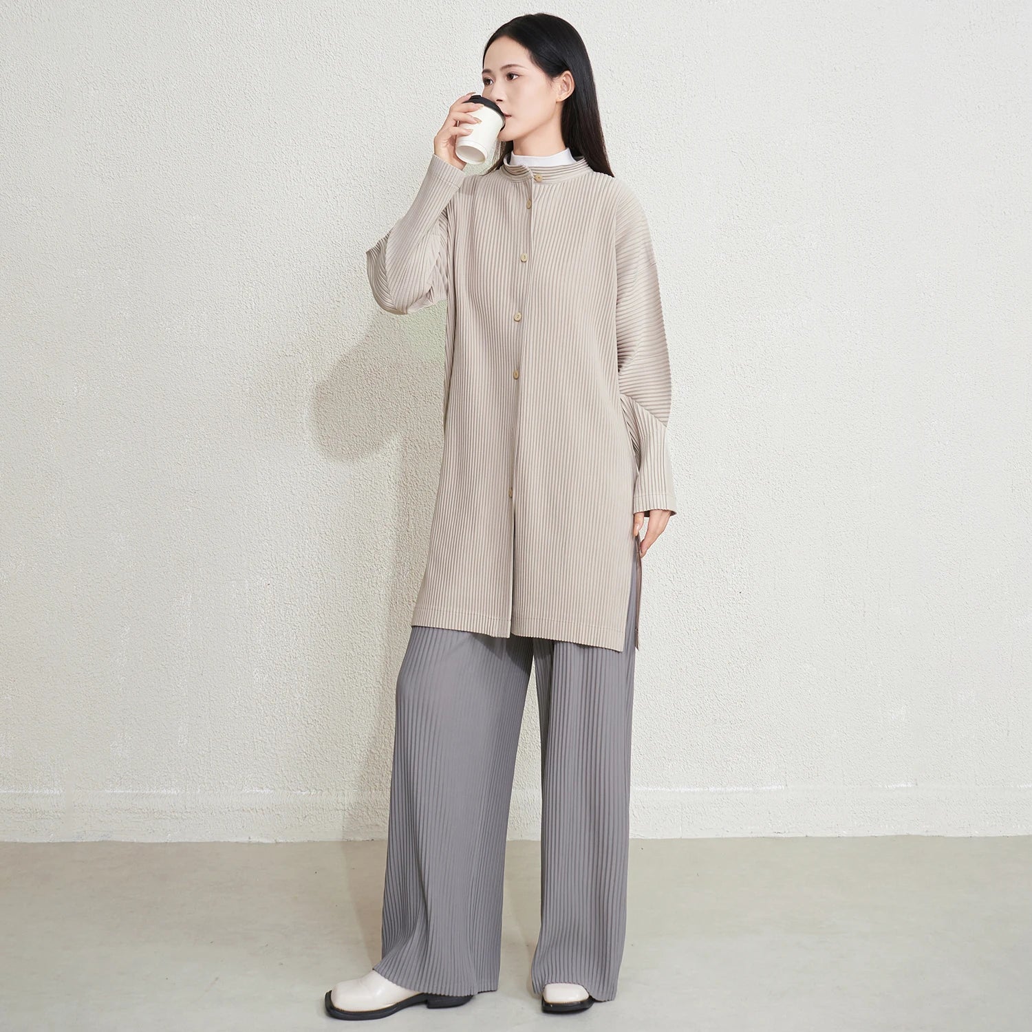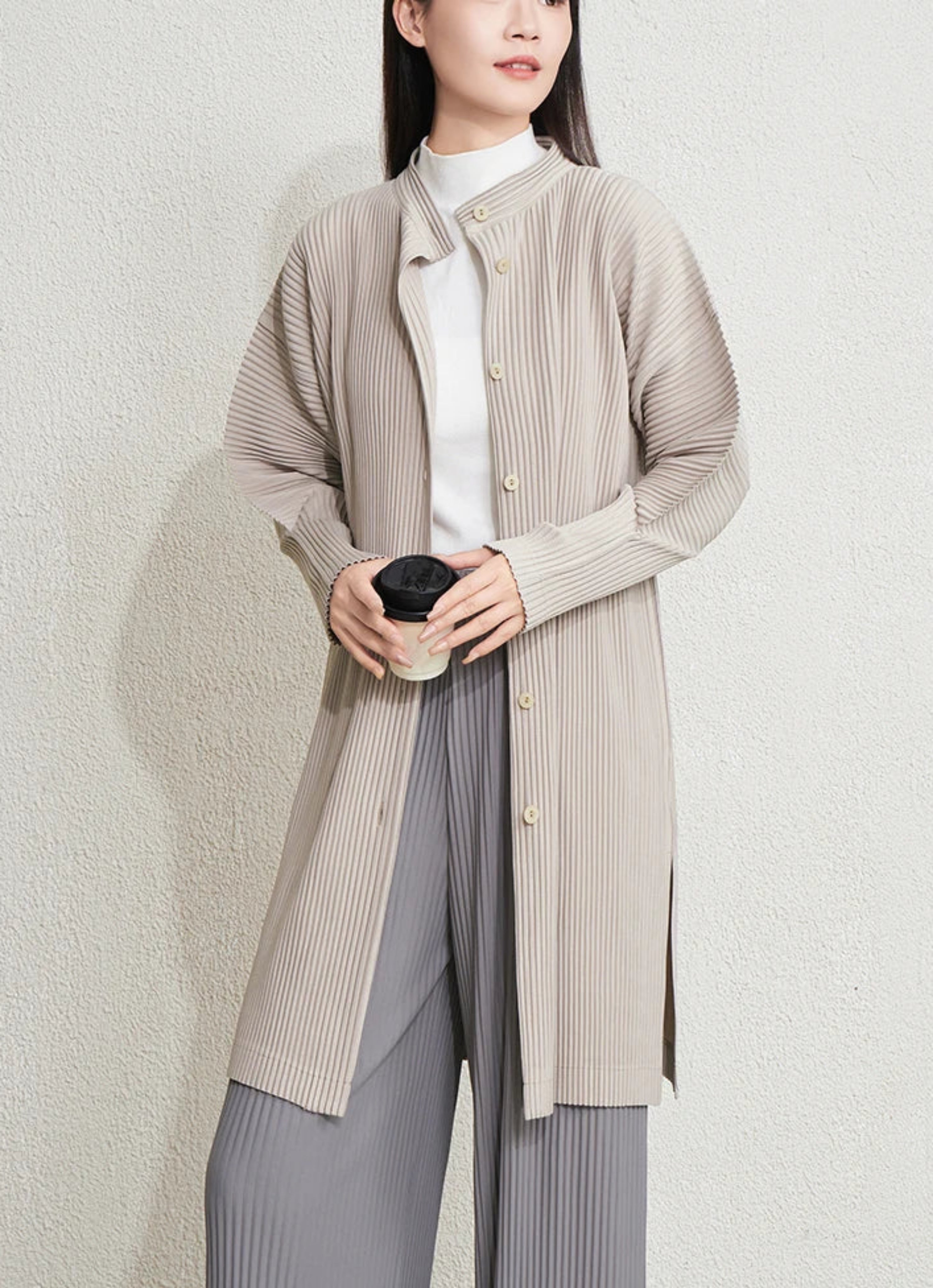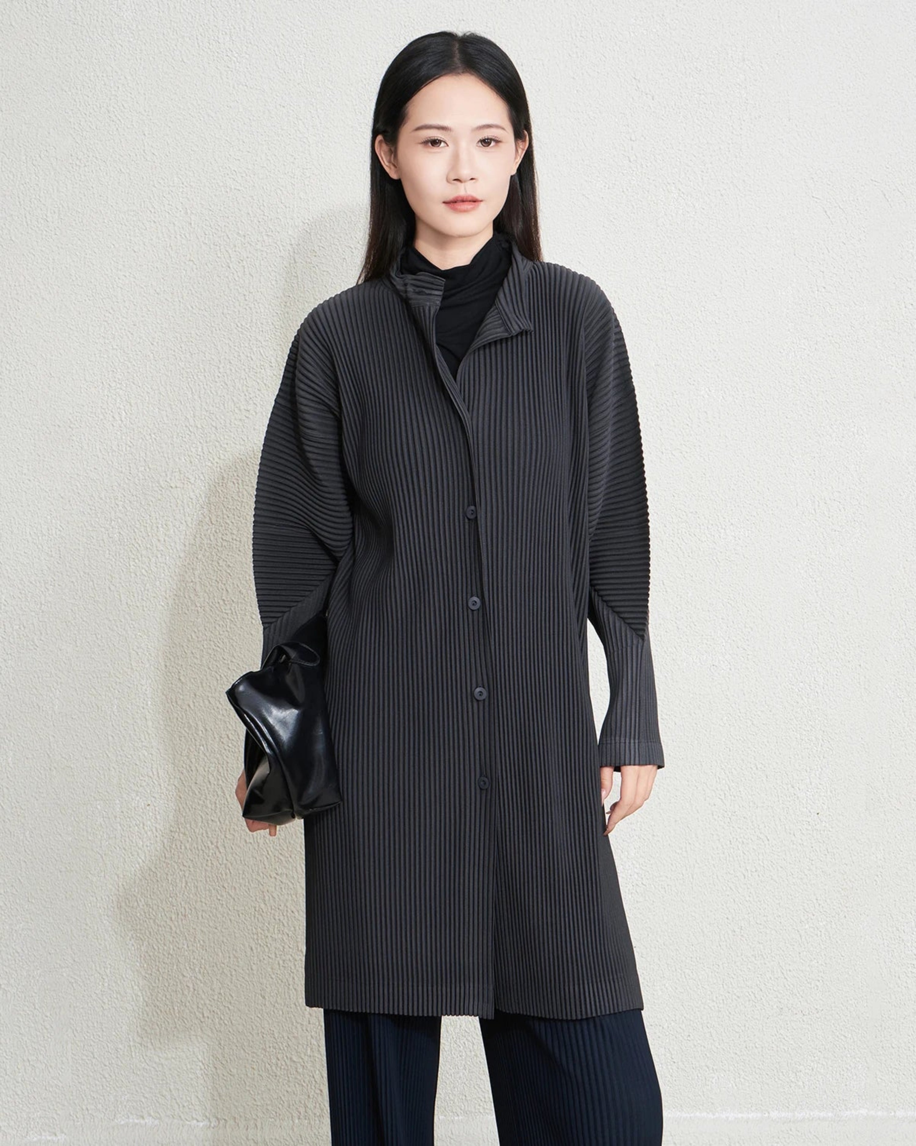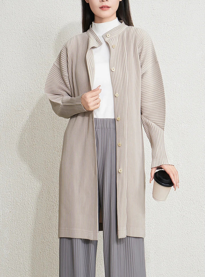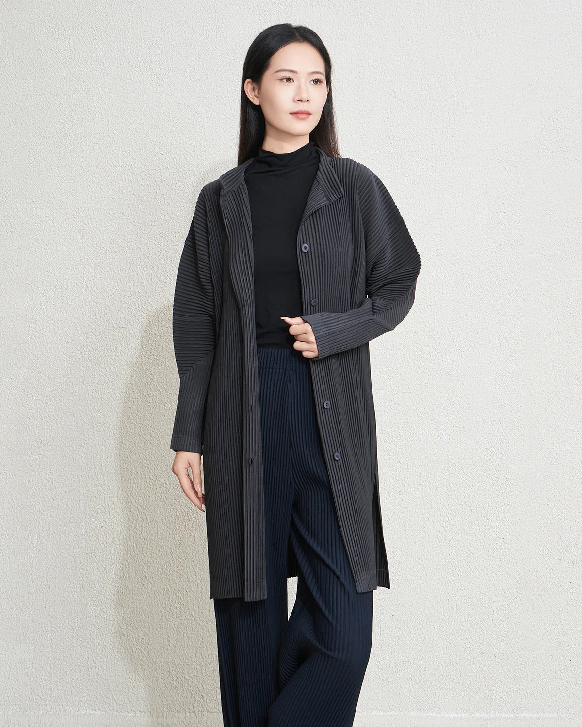 This micro-pleat cardigan coat features premium Japanese pleats with a relaxed, below-hip silhouette.