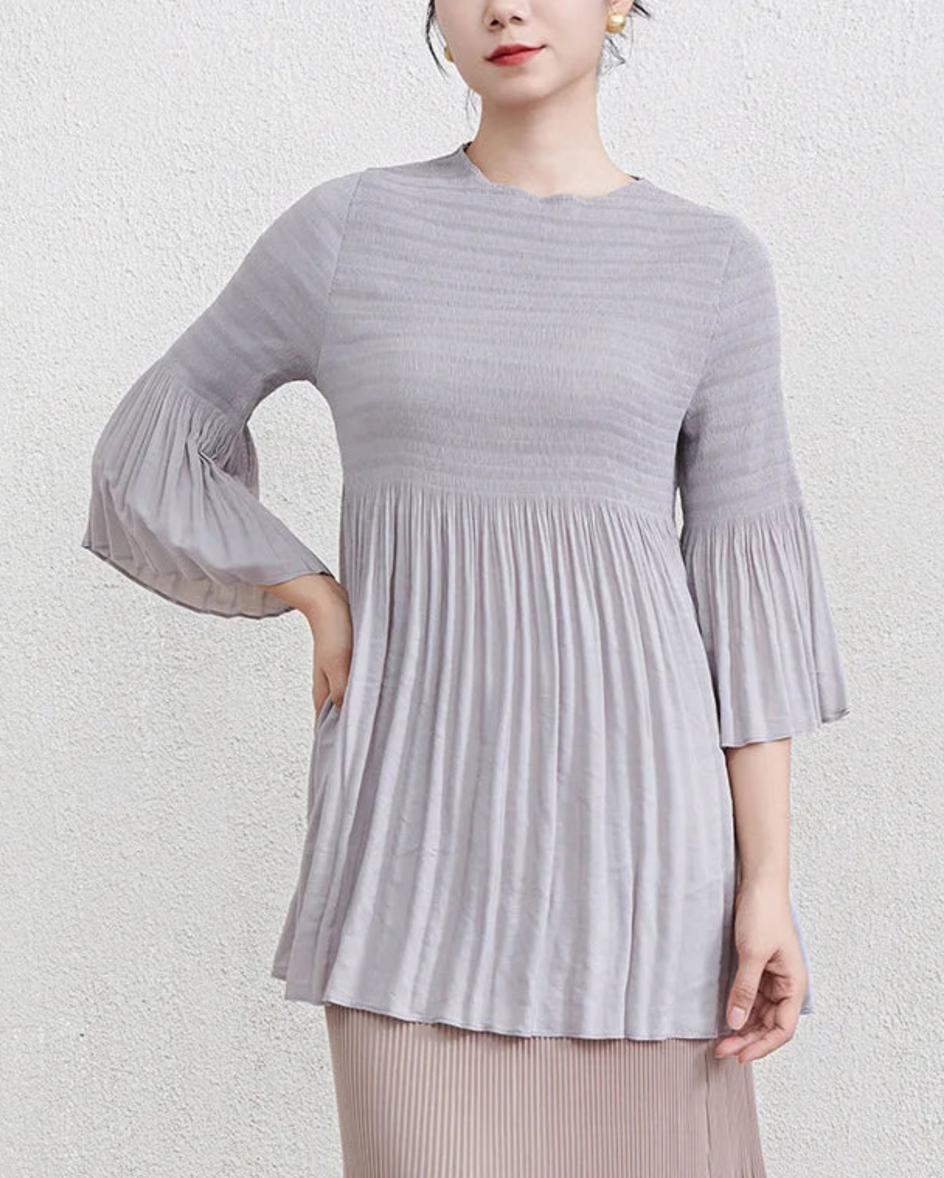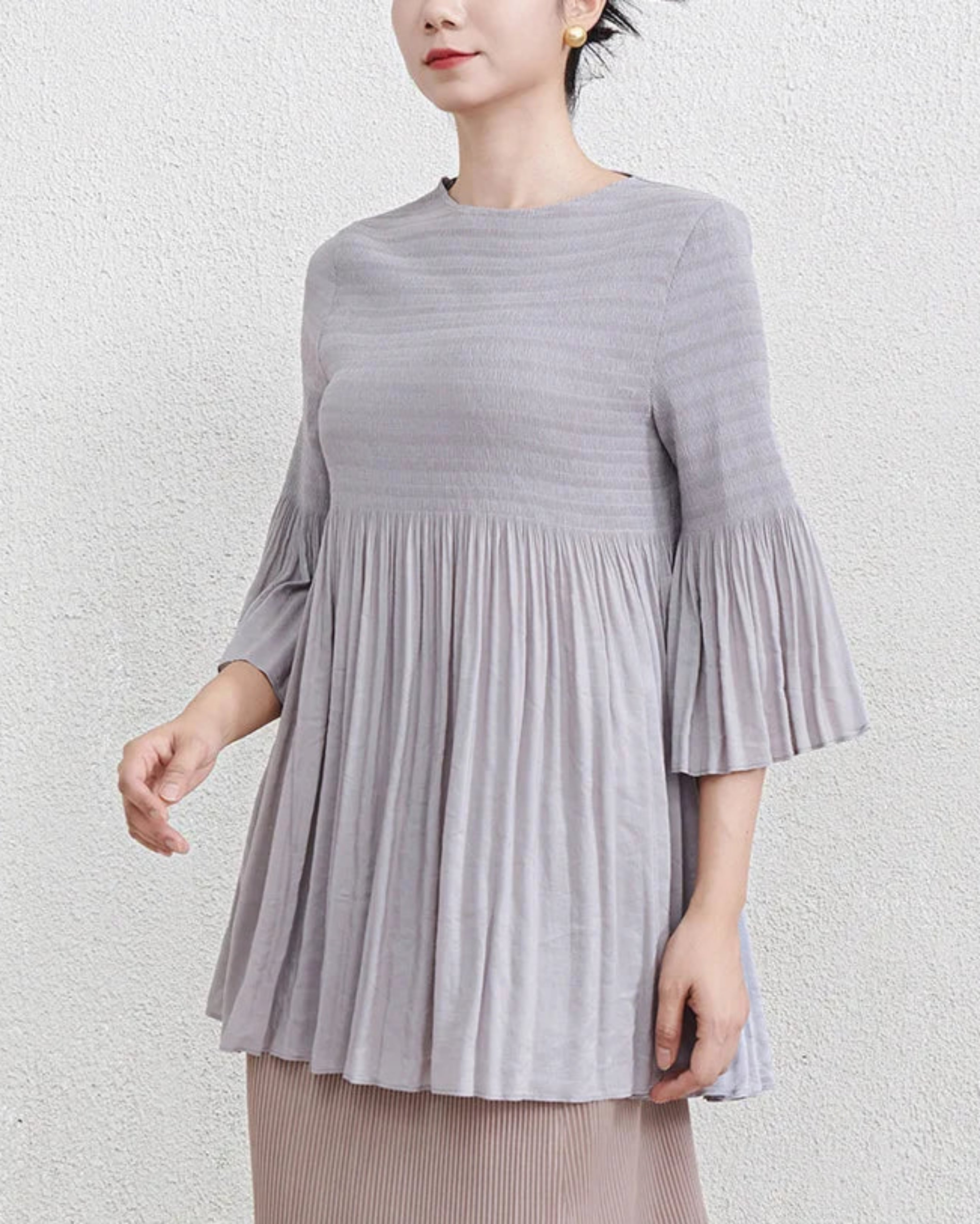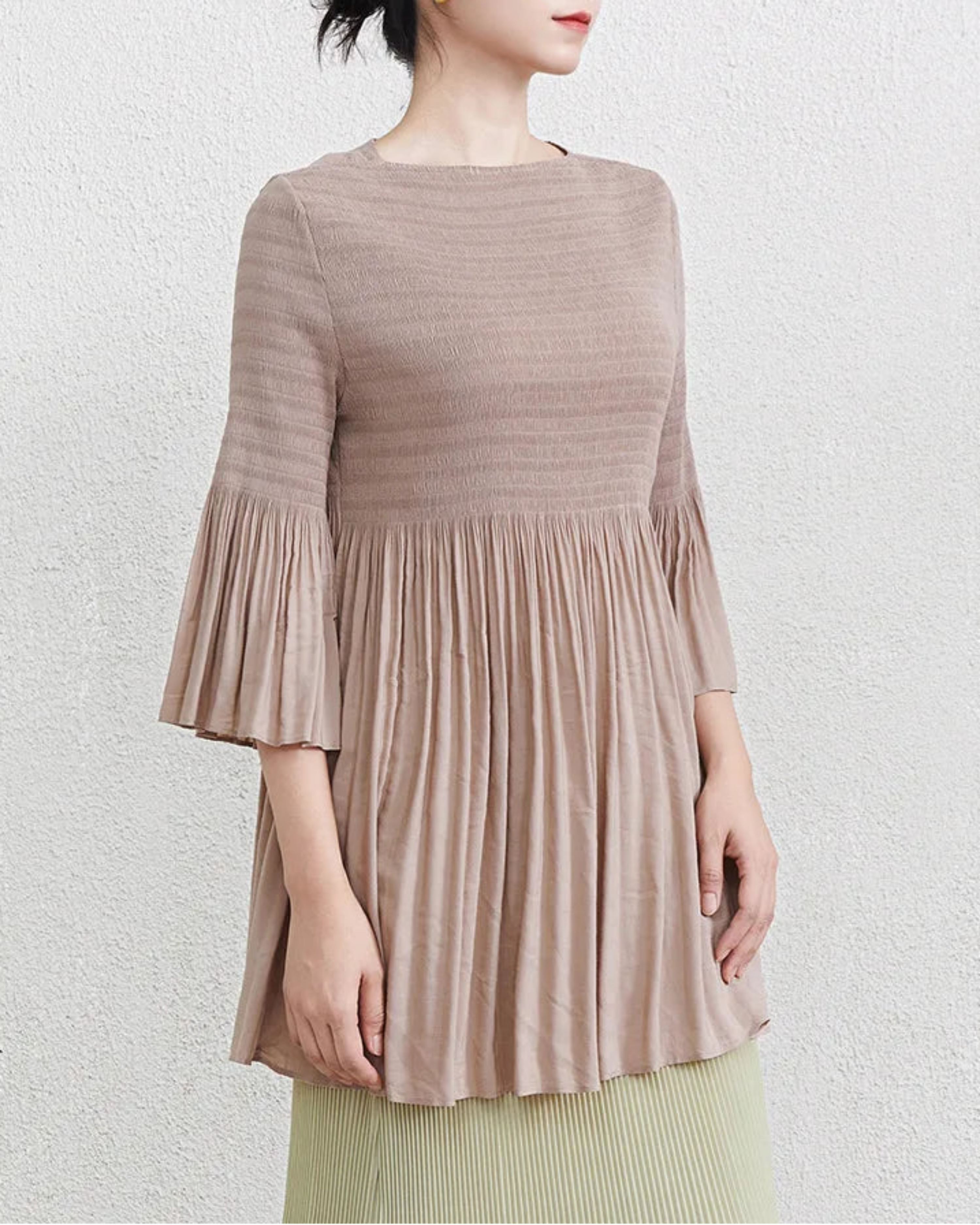 This tiered plissé tunic top features three-quarter flared sleeves and a flowing silhouette in premium Japanese pleats.