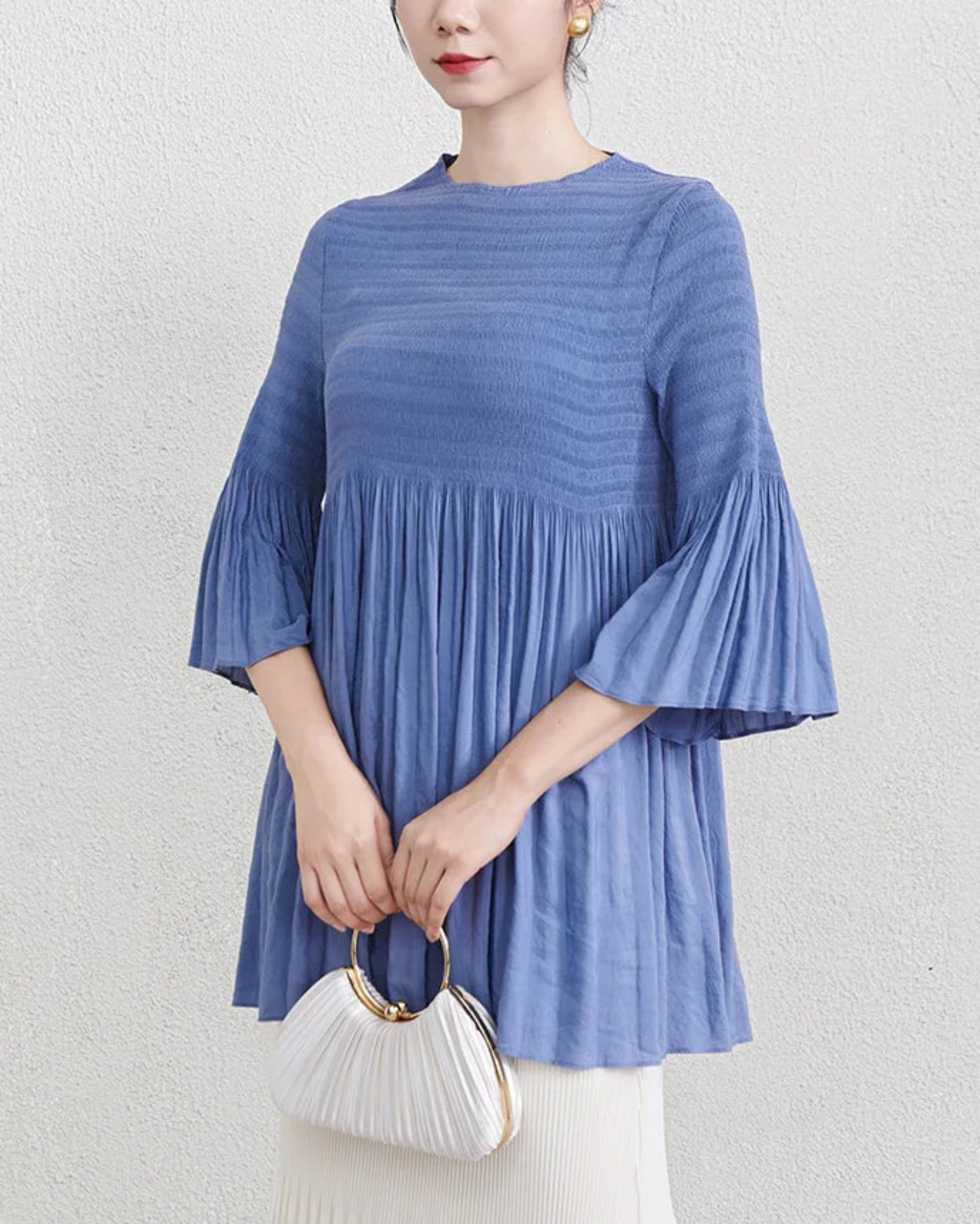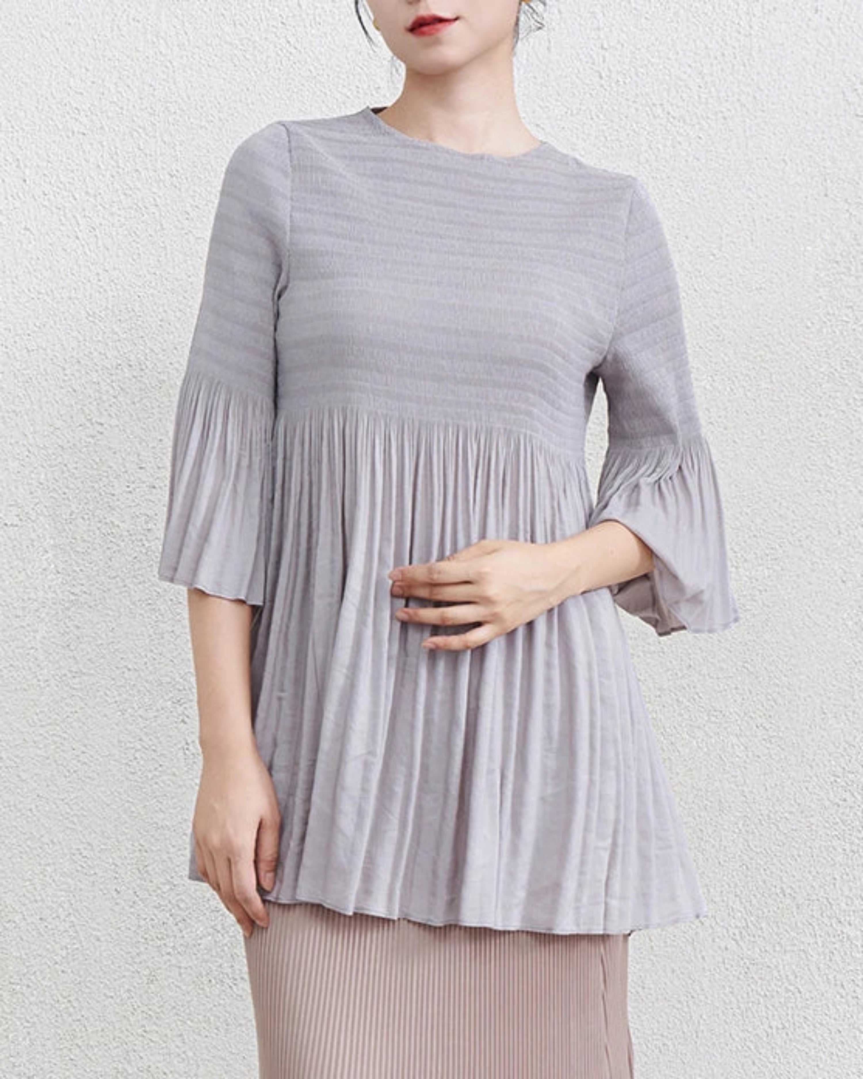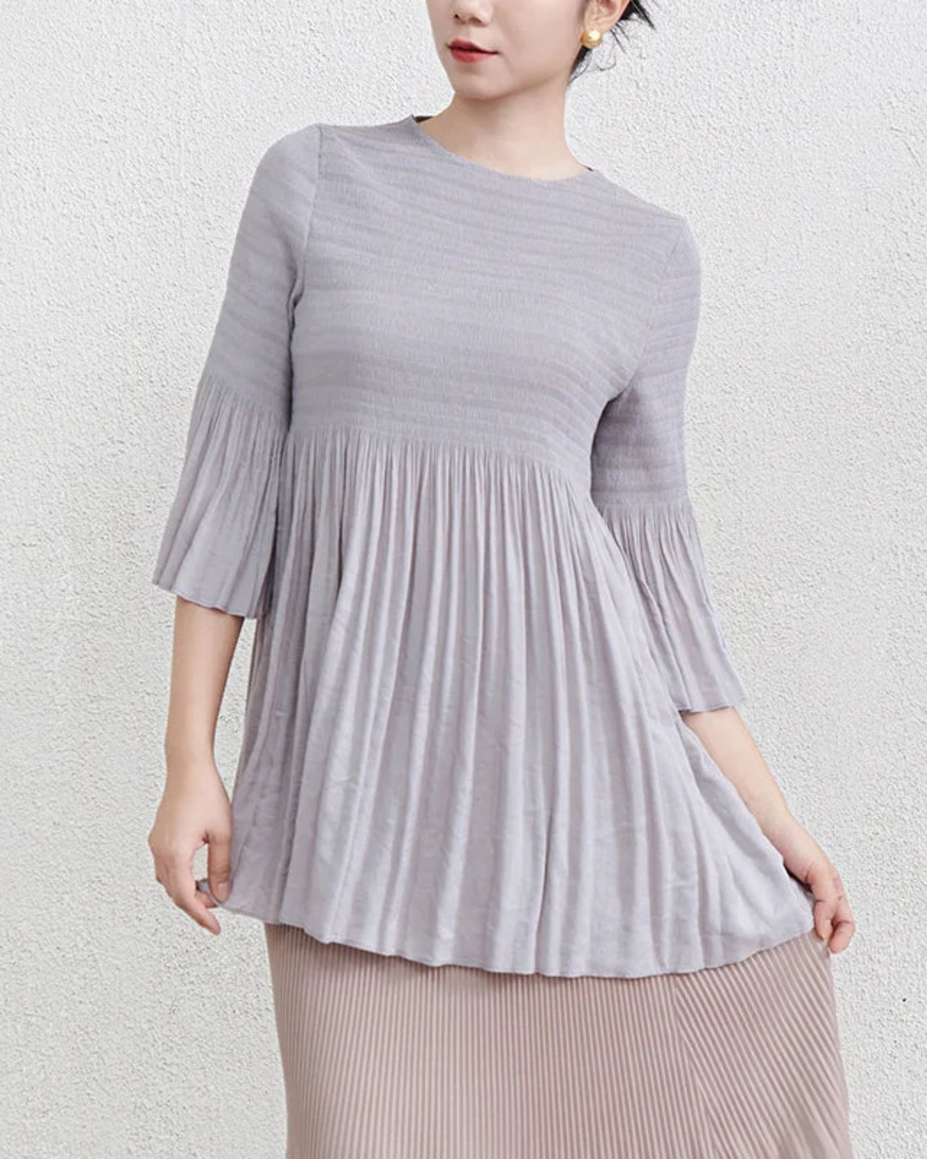 This tiered plissé tunic top features three-quarter flared sleeves and a flowing silhouette in premium Japanese pleats.