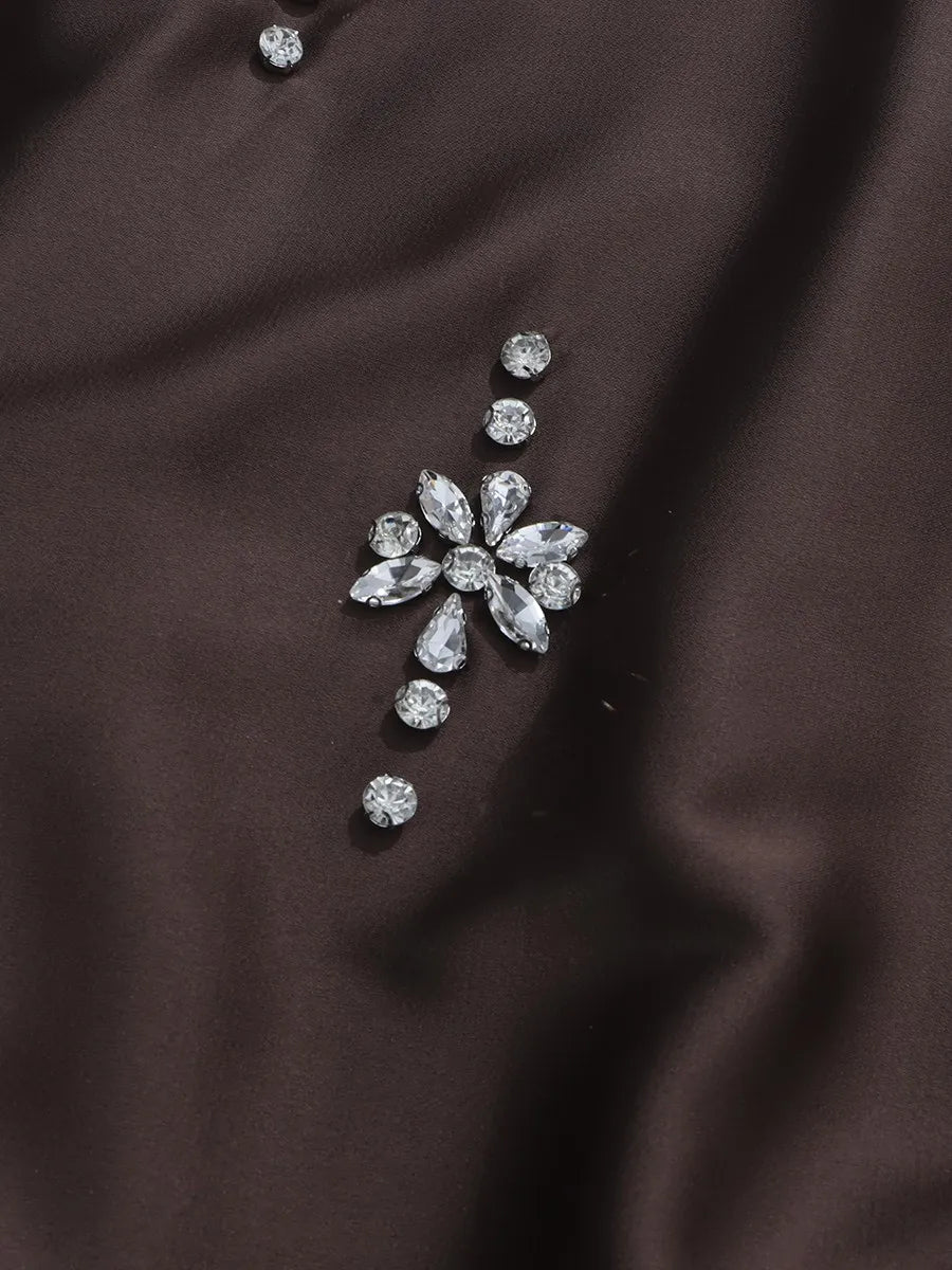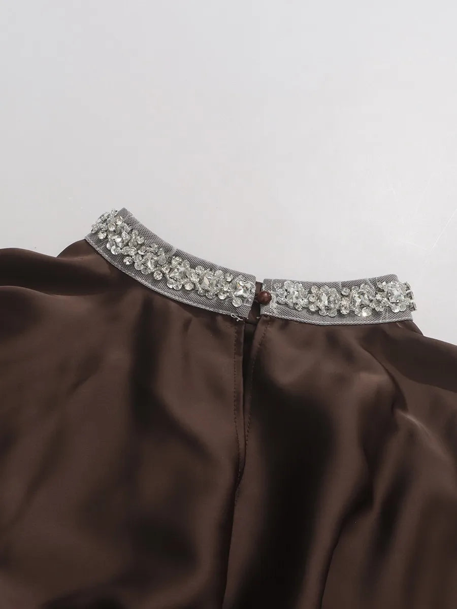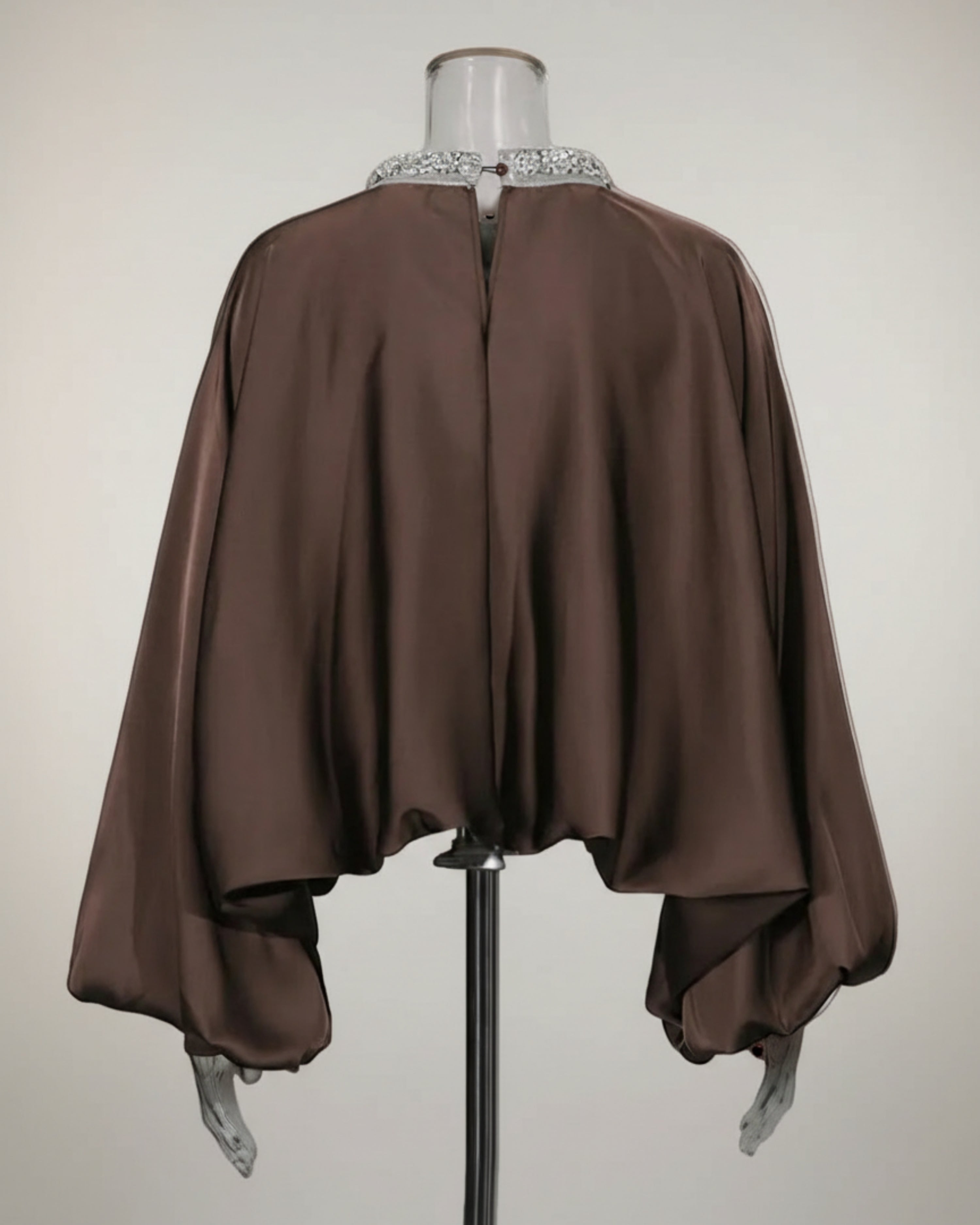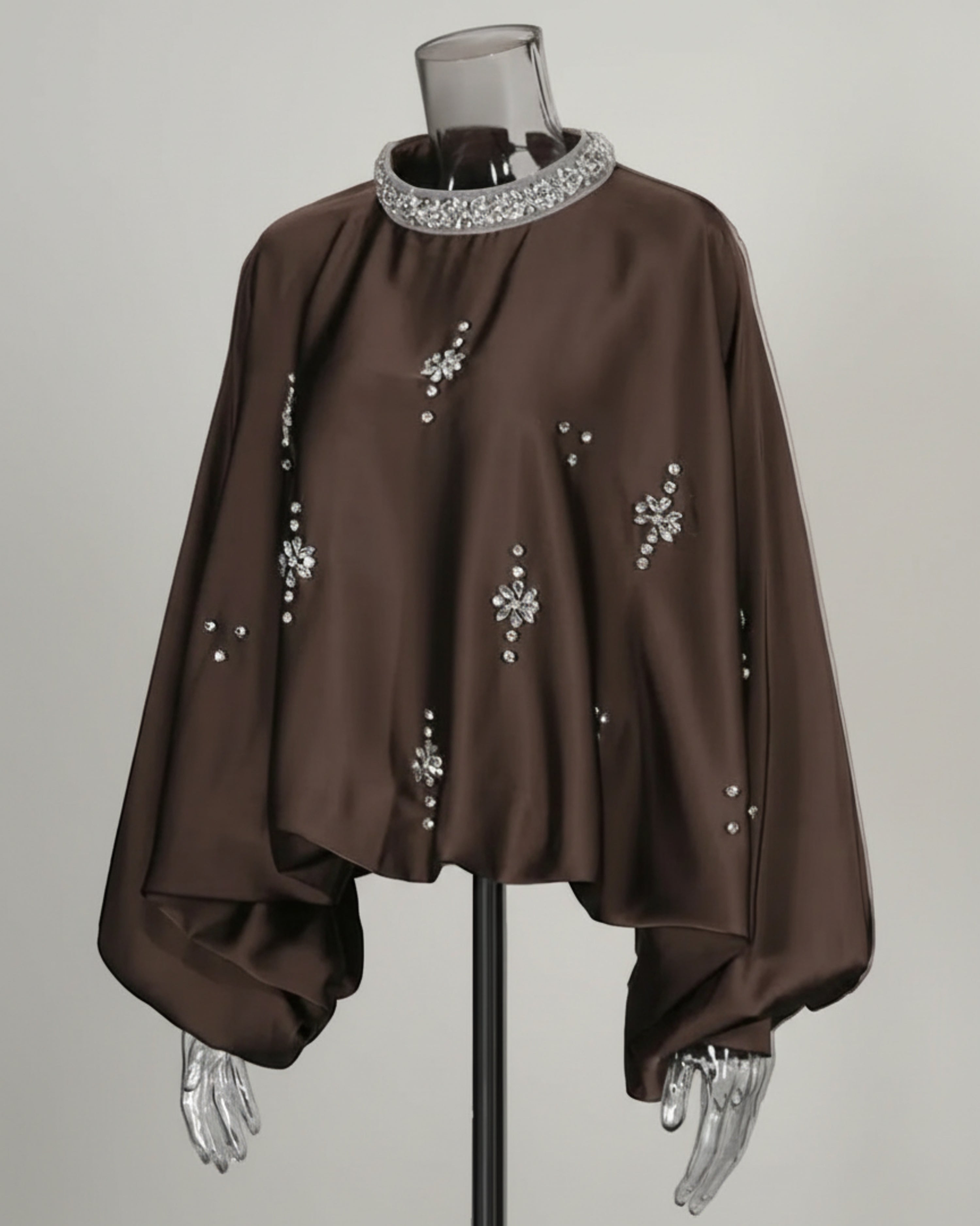 This luxurious blouse features a flowing, cape-style silhouette with a dramatic high mock-neck collar adorned with hand-placed crystals.
