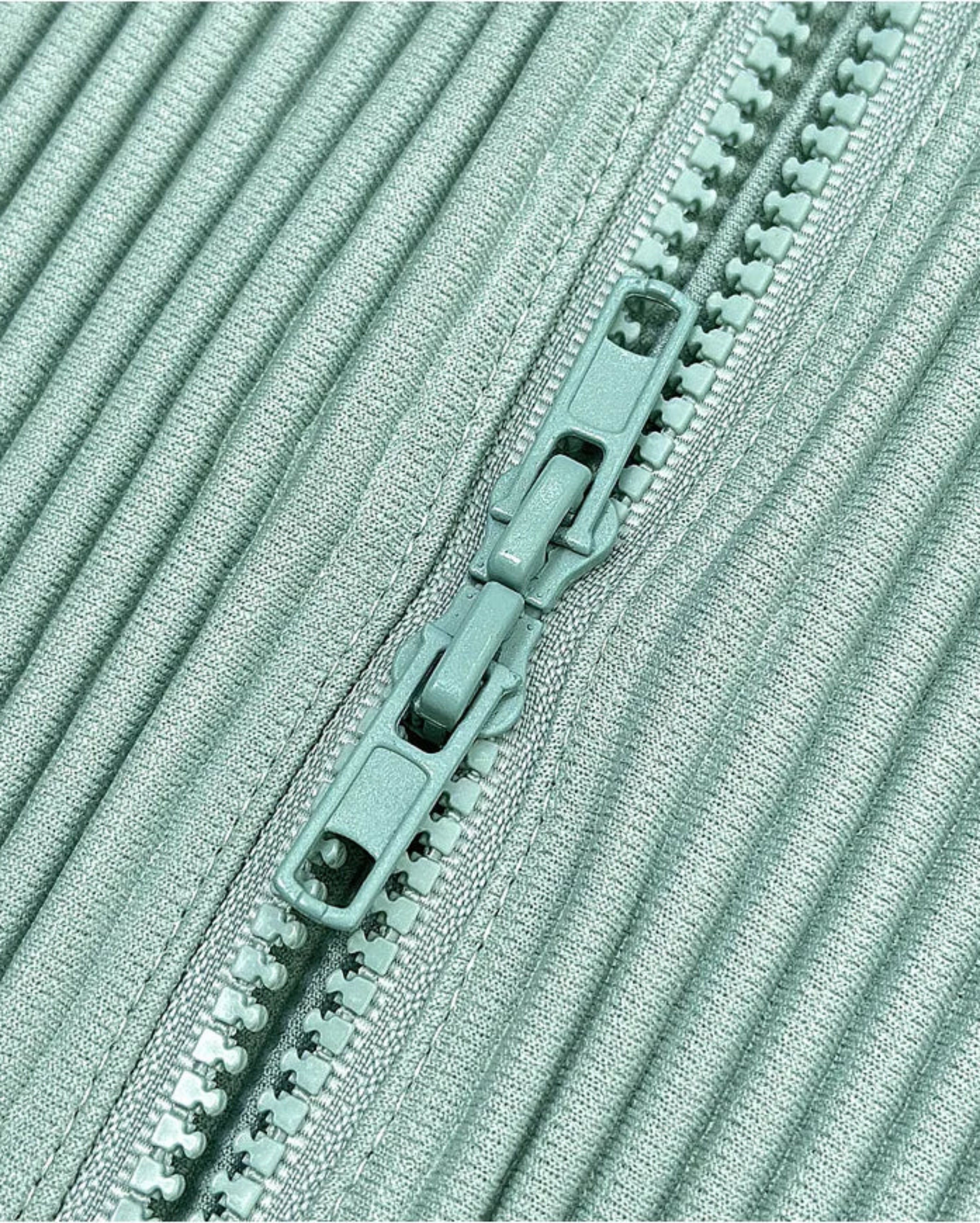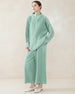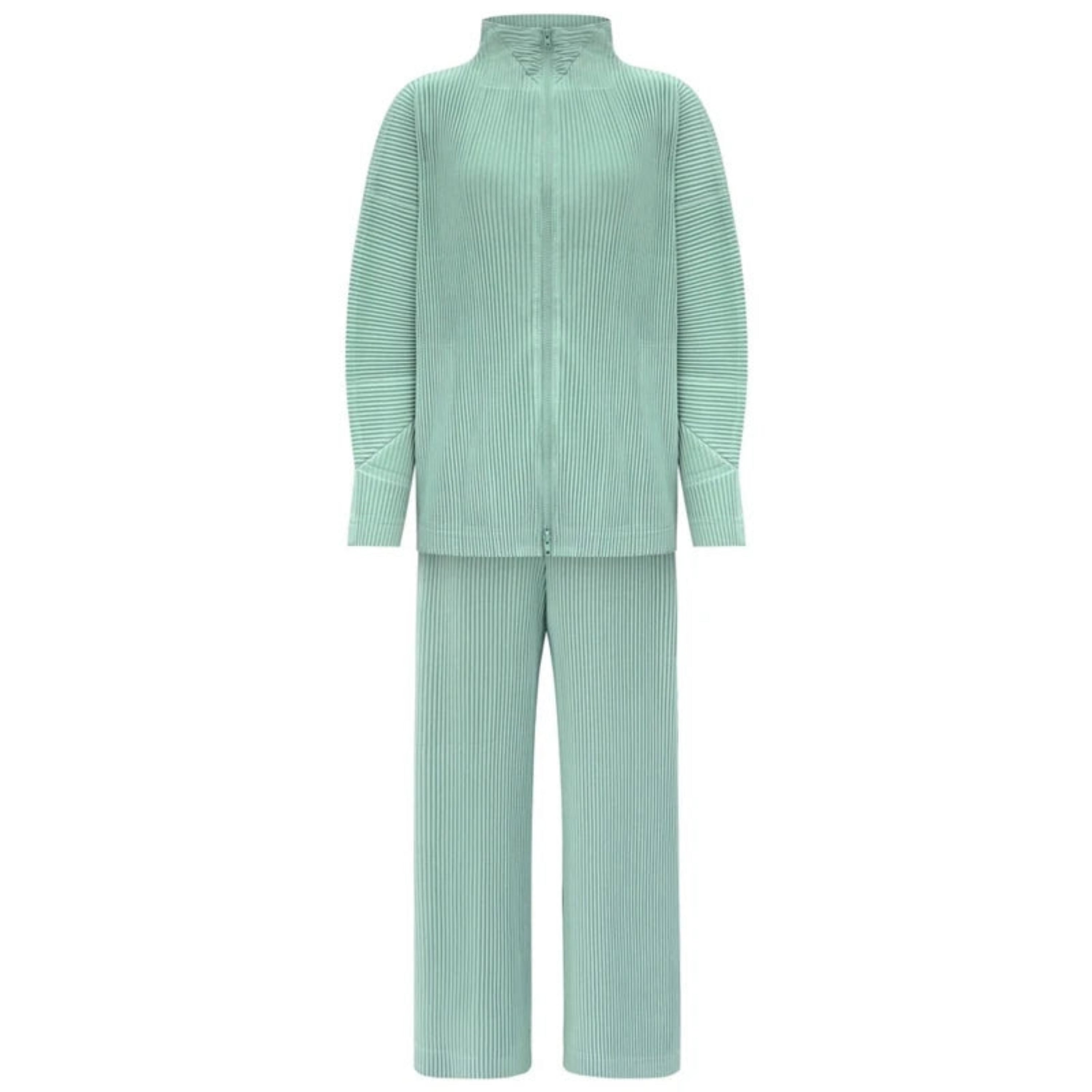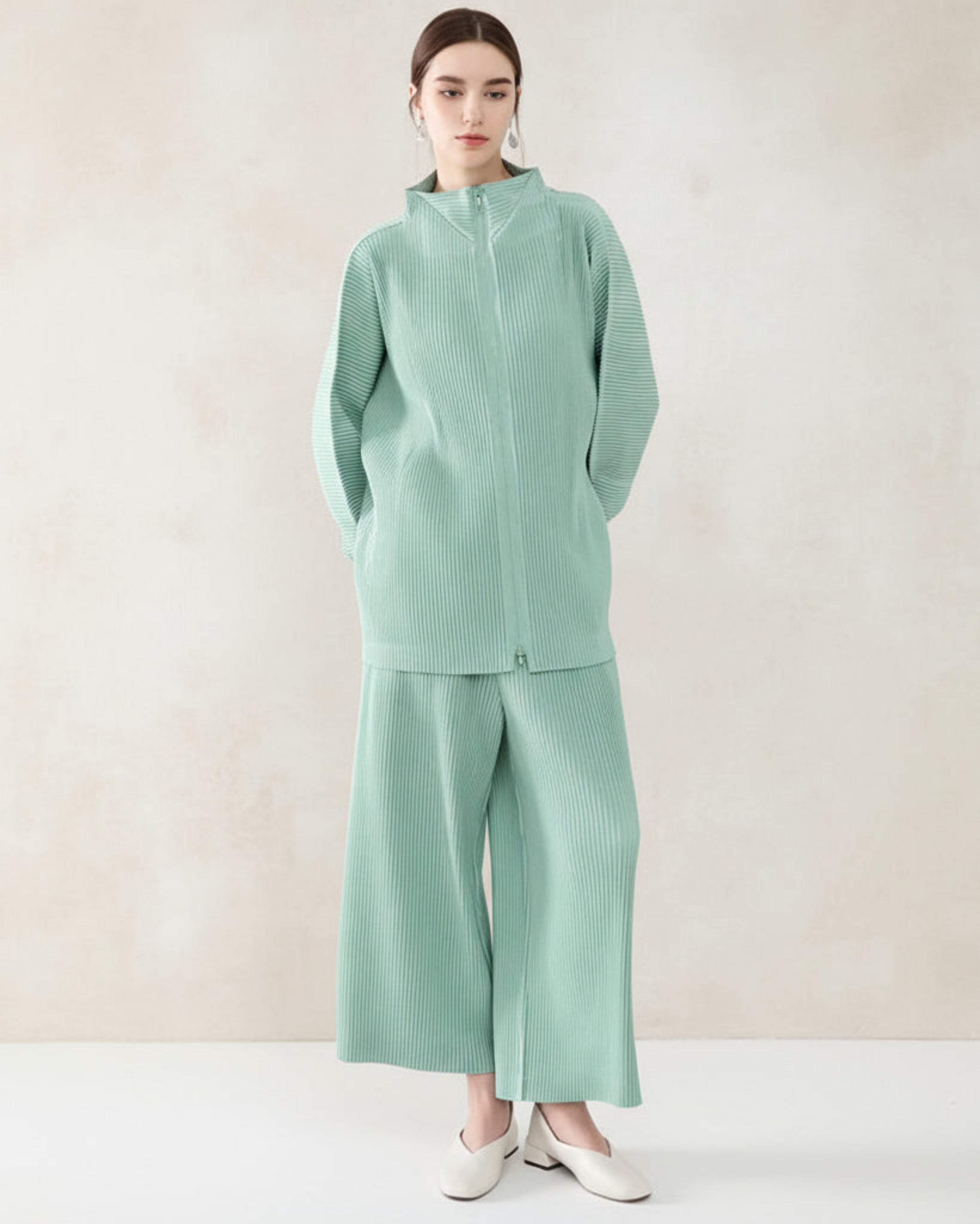 A 2-piece matching set in thick Japanese plissé, featuring a zip-up jacket with high collar and wide-leg elastic waistband trousers.