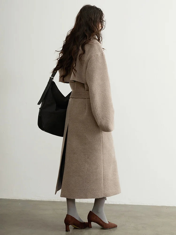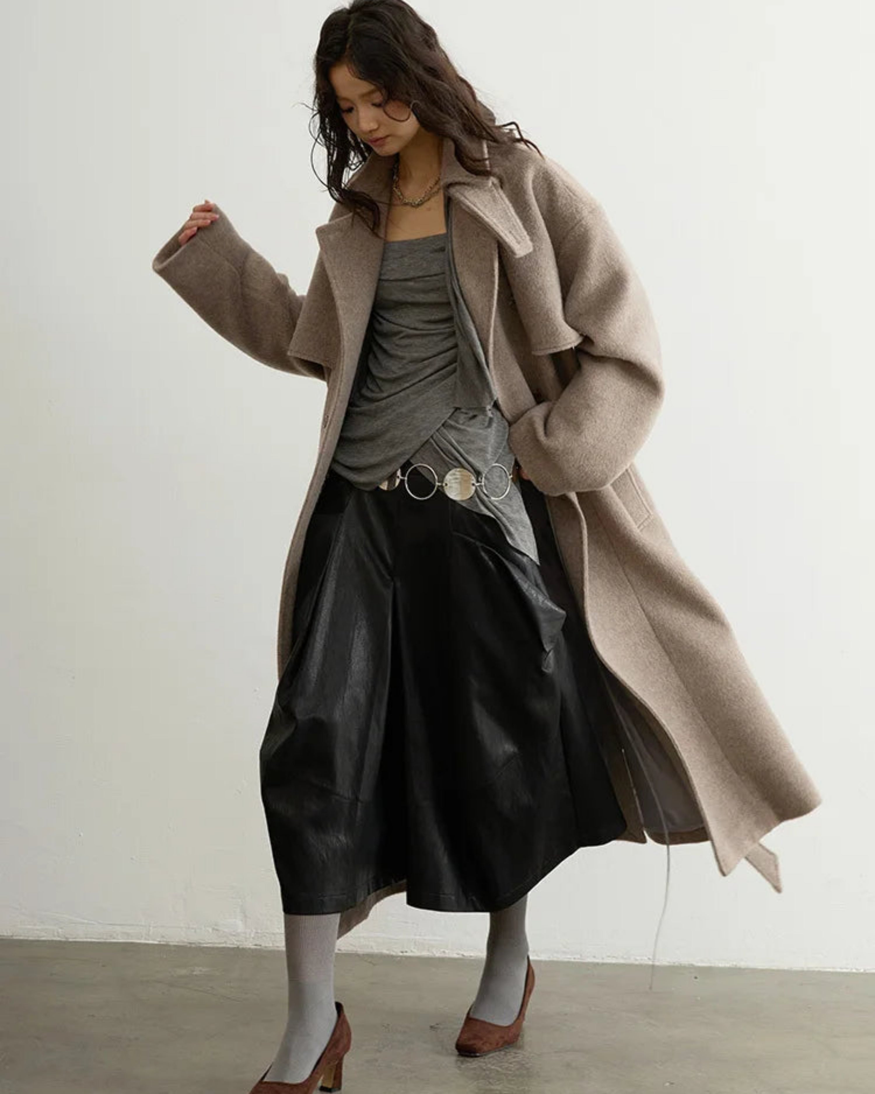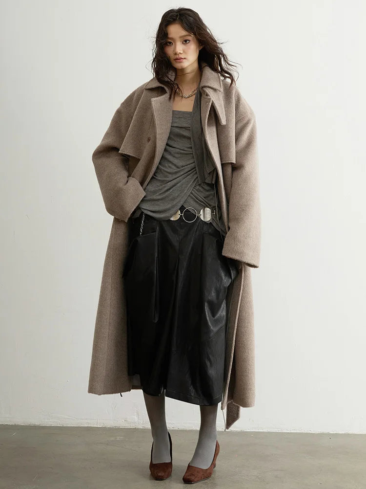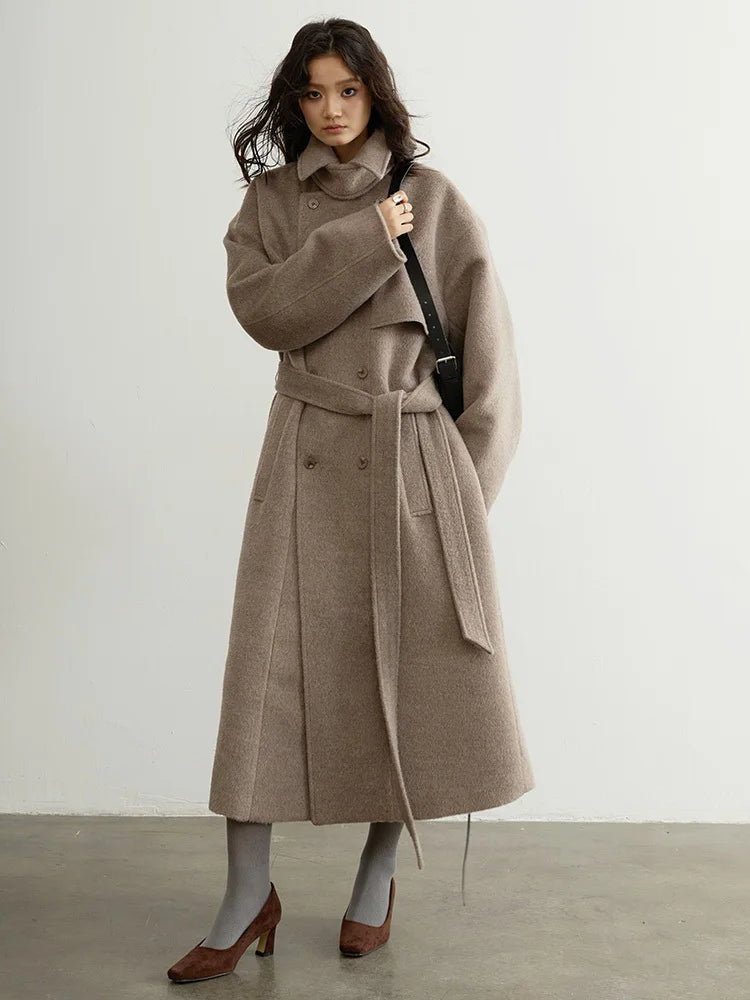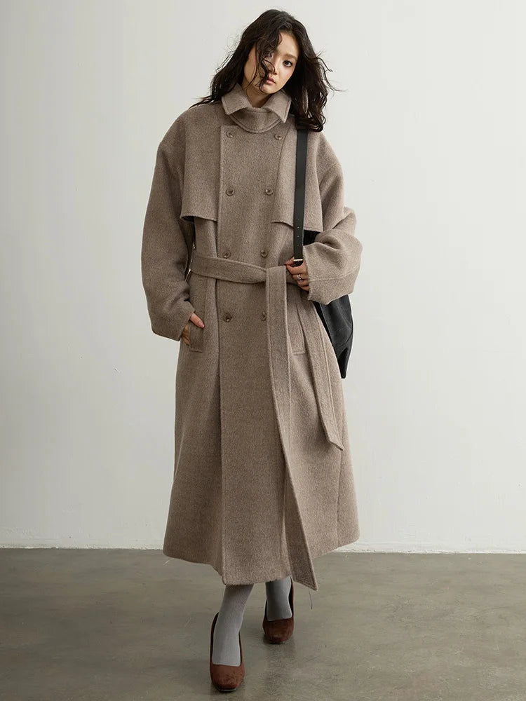 This luxurious high-collar wrap overcoat features an oversized fit with a relaxed silhouette for layering and warmth.