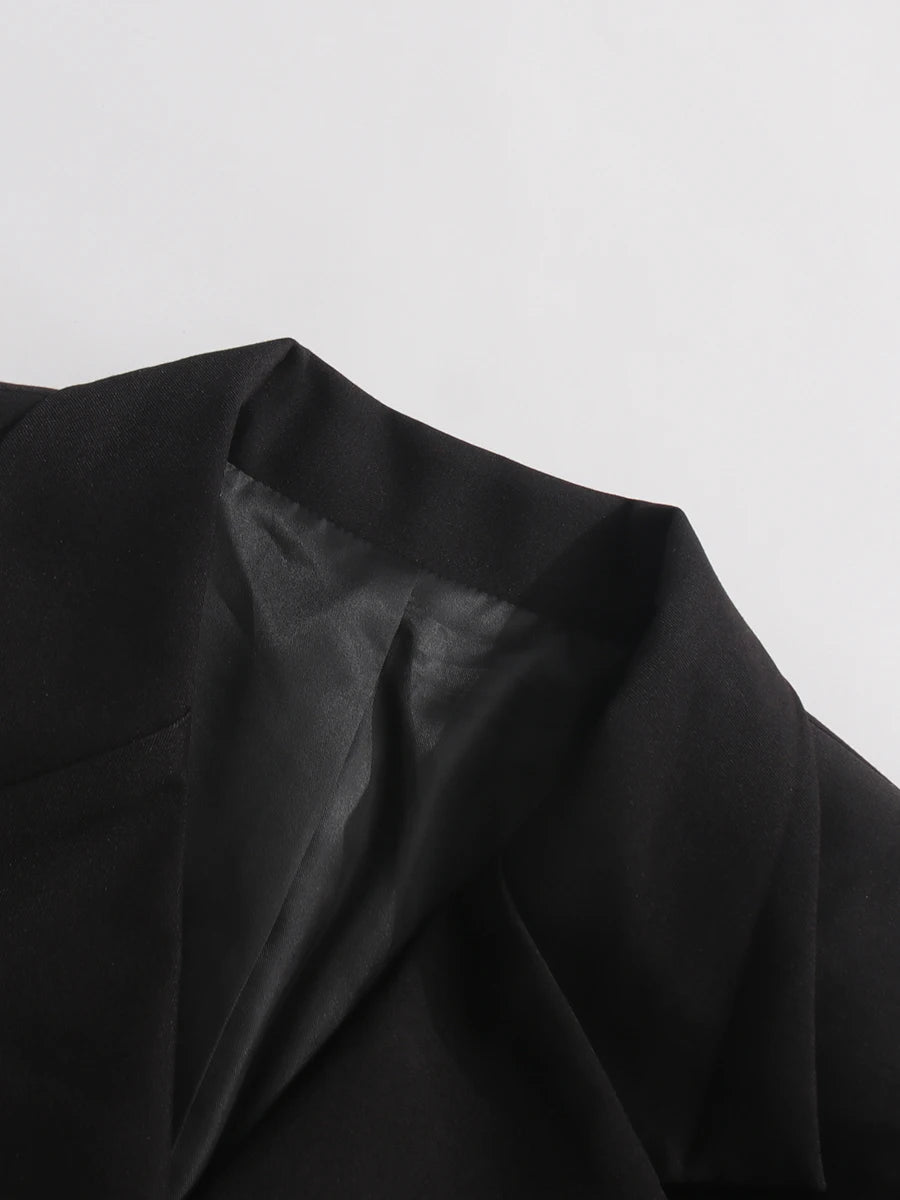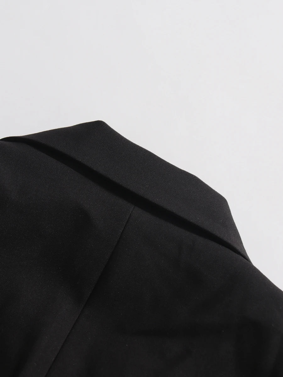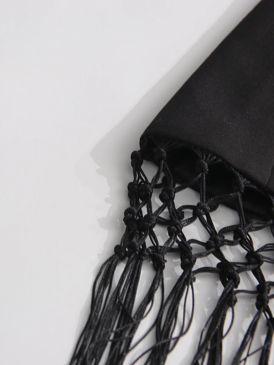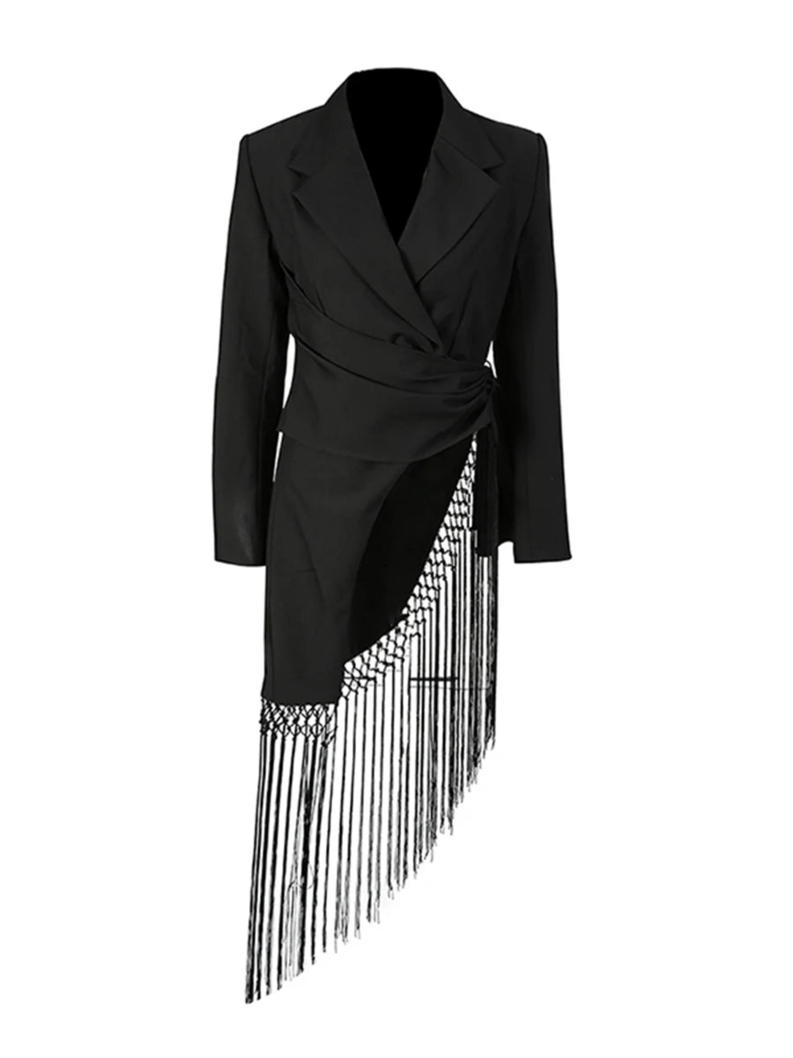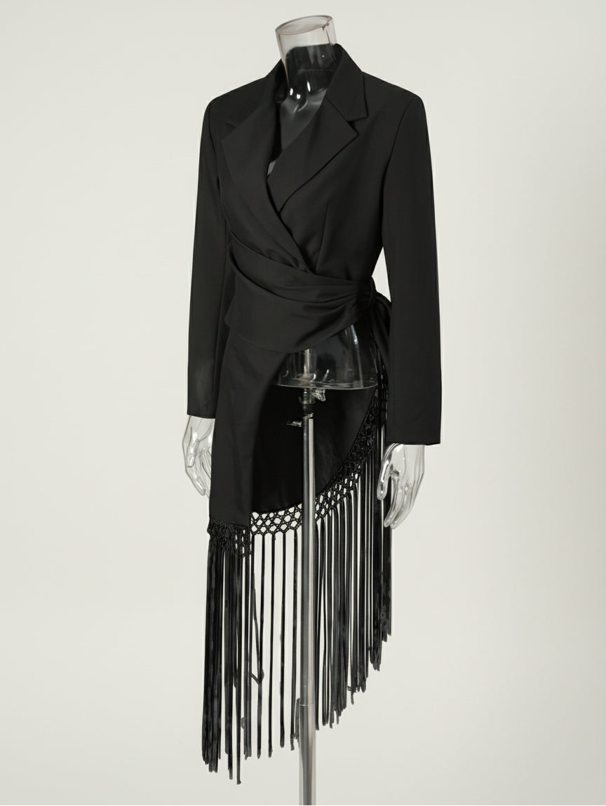 This luxury blazer features an asymmetric wrap-front with hand-knotted fringe detailing, combining fashion-forward design with a tailored, comfortable fit. Perfect for formal events, evening occasions, or stylish office wear.