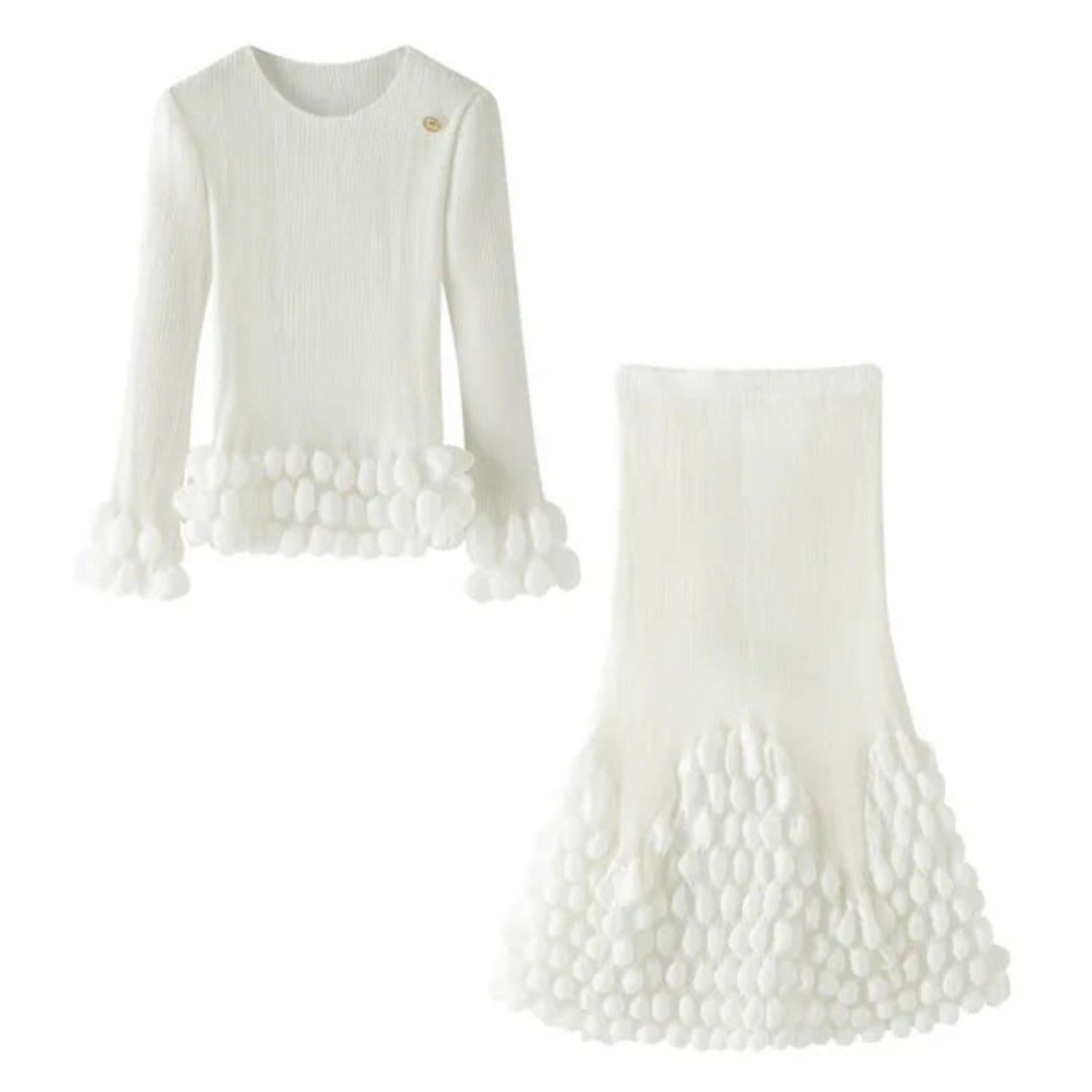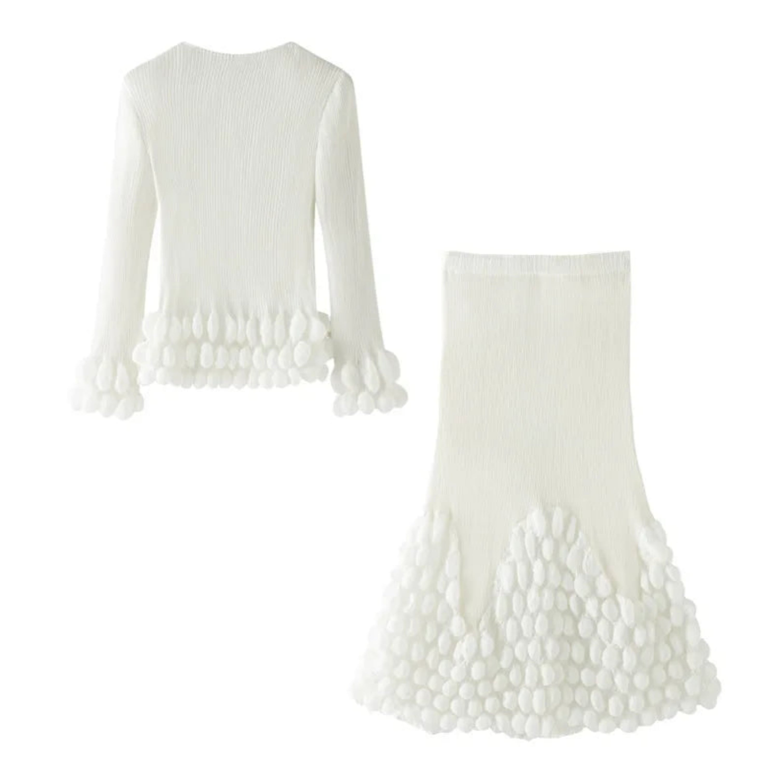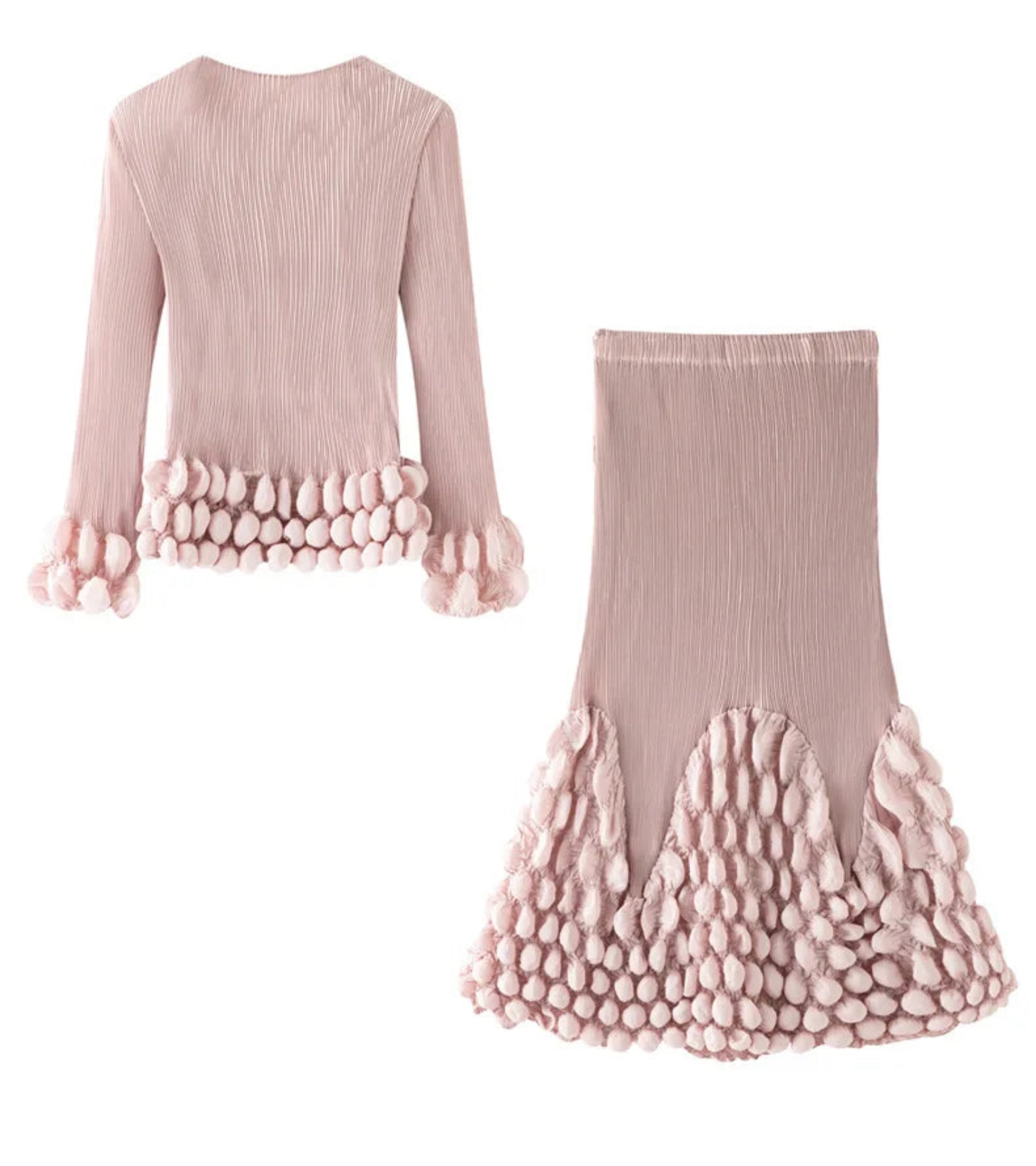 Luxurious 2-piece pleated knit set with a Japanese bubble pleated long-sleeve top and matching midi skirt with elastic waistband.