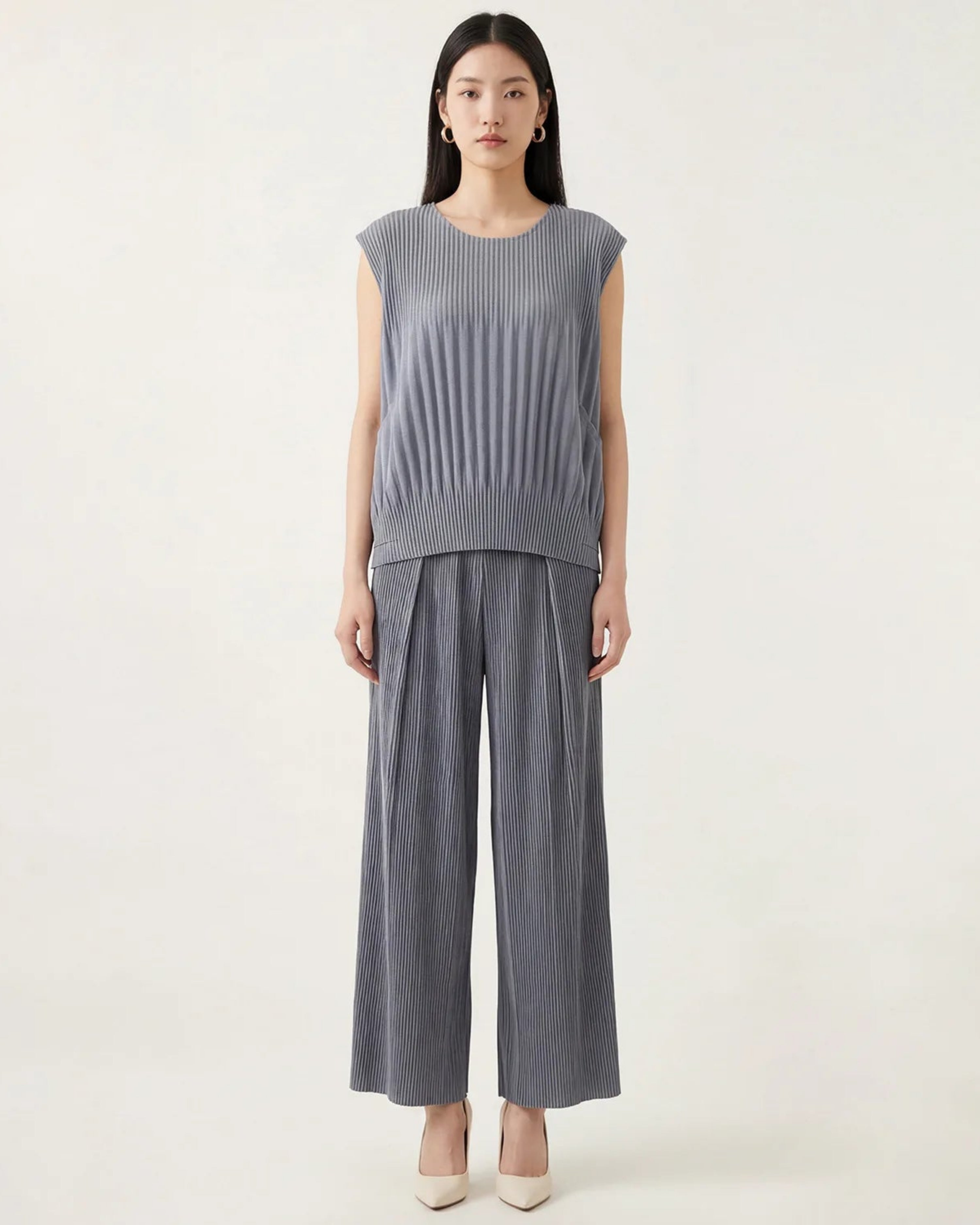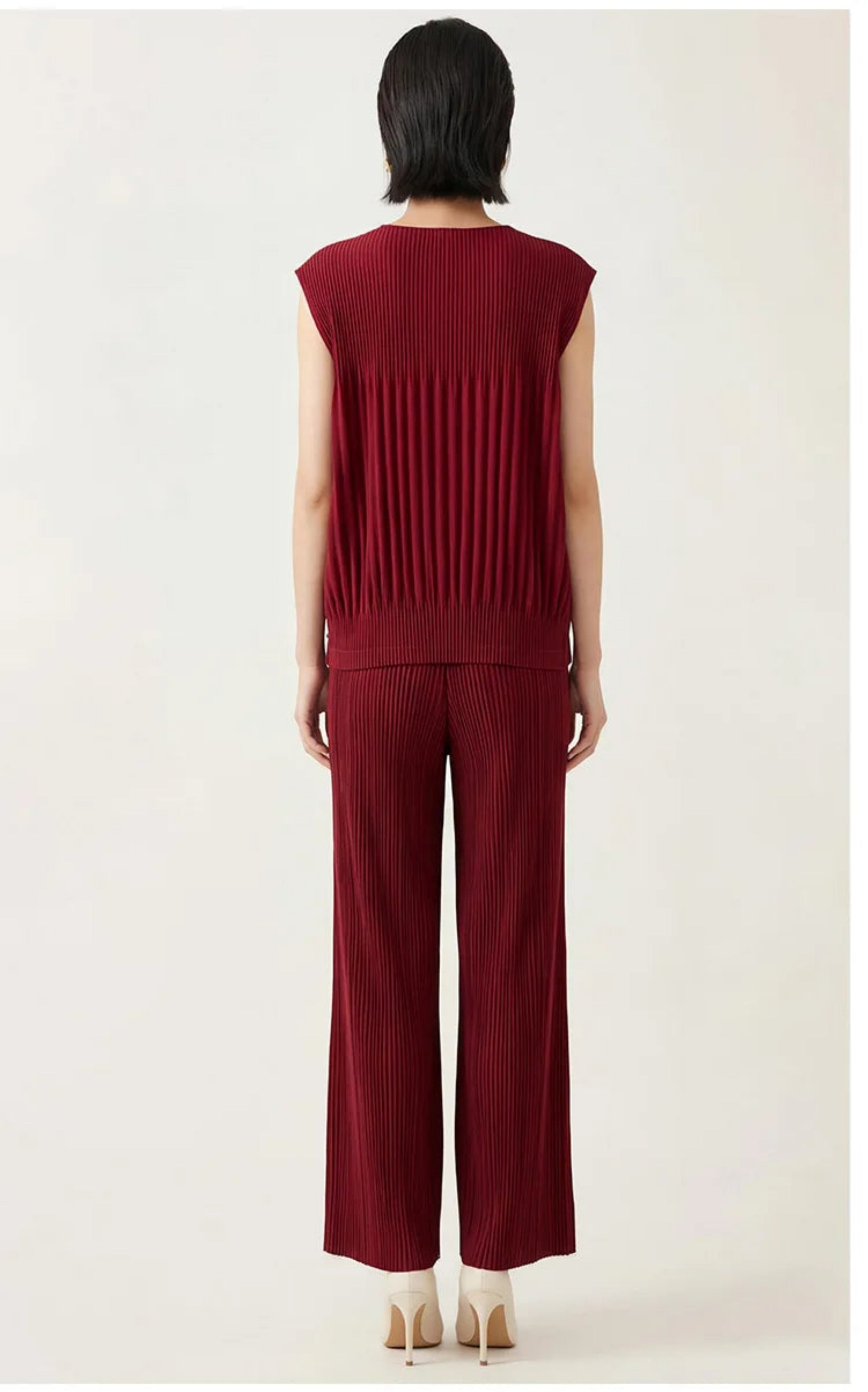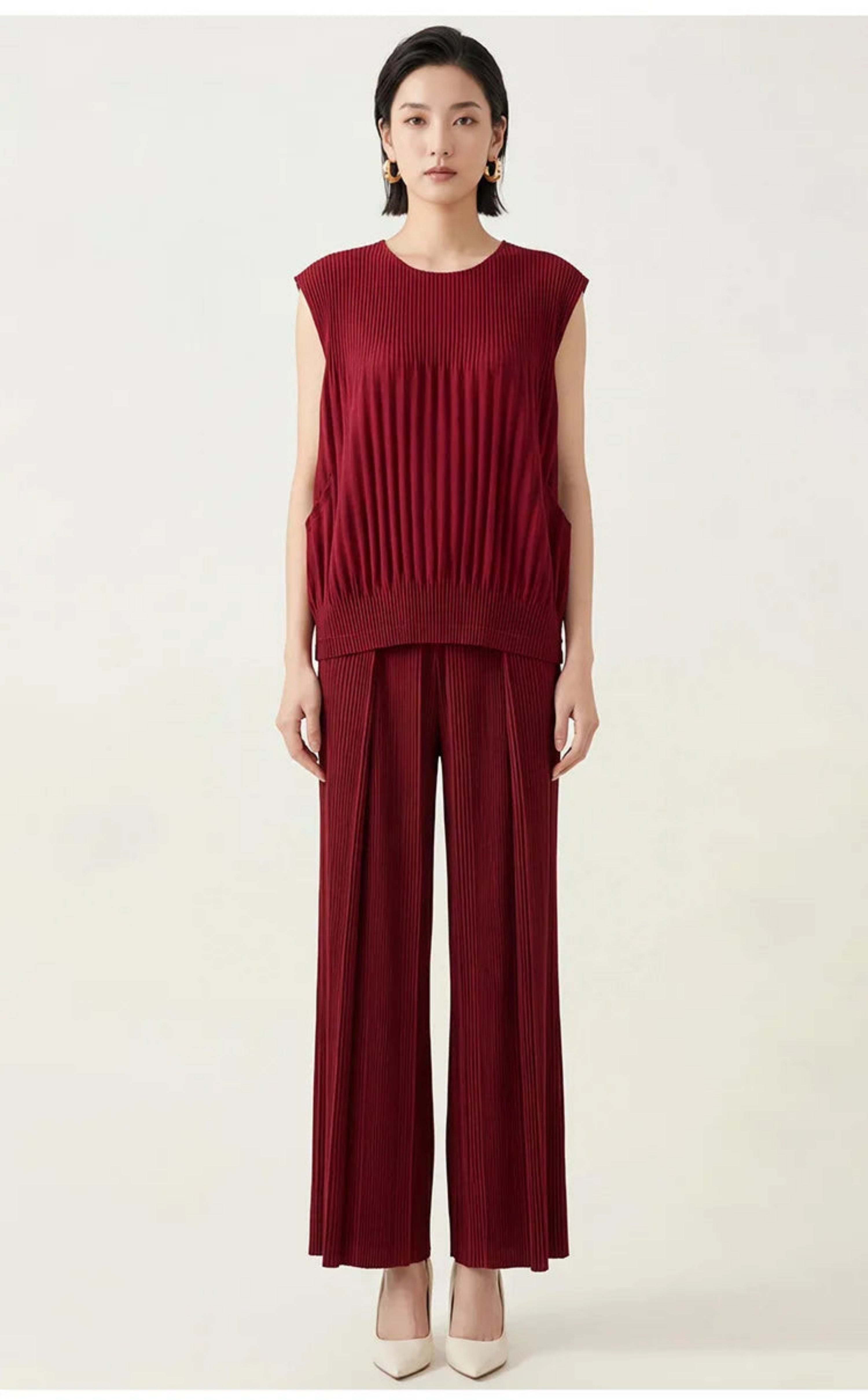 Elegant 2-piece Japanese plissé set featuring a sleeveless top and wide-leg pleated pants.