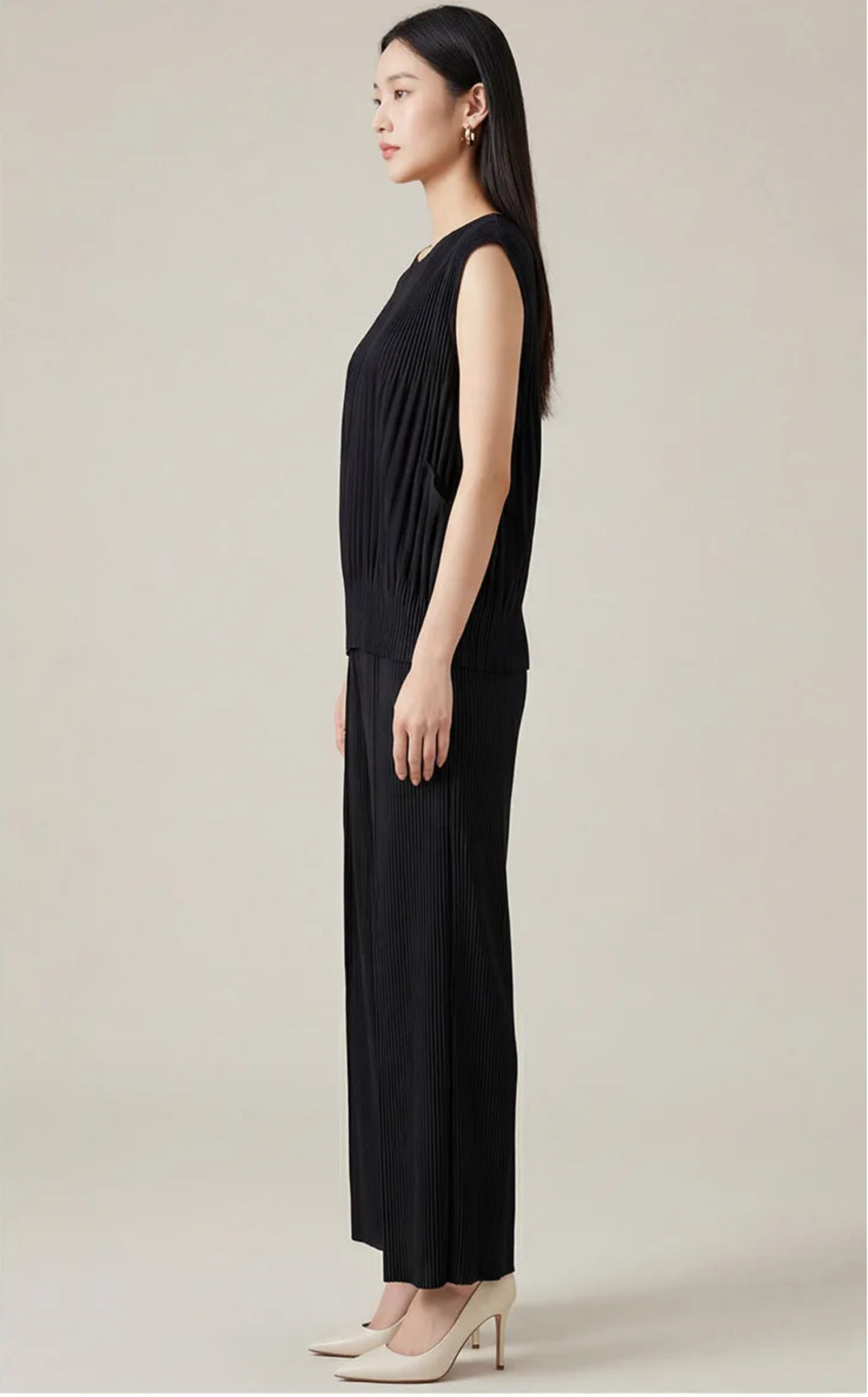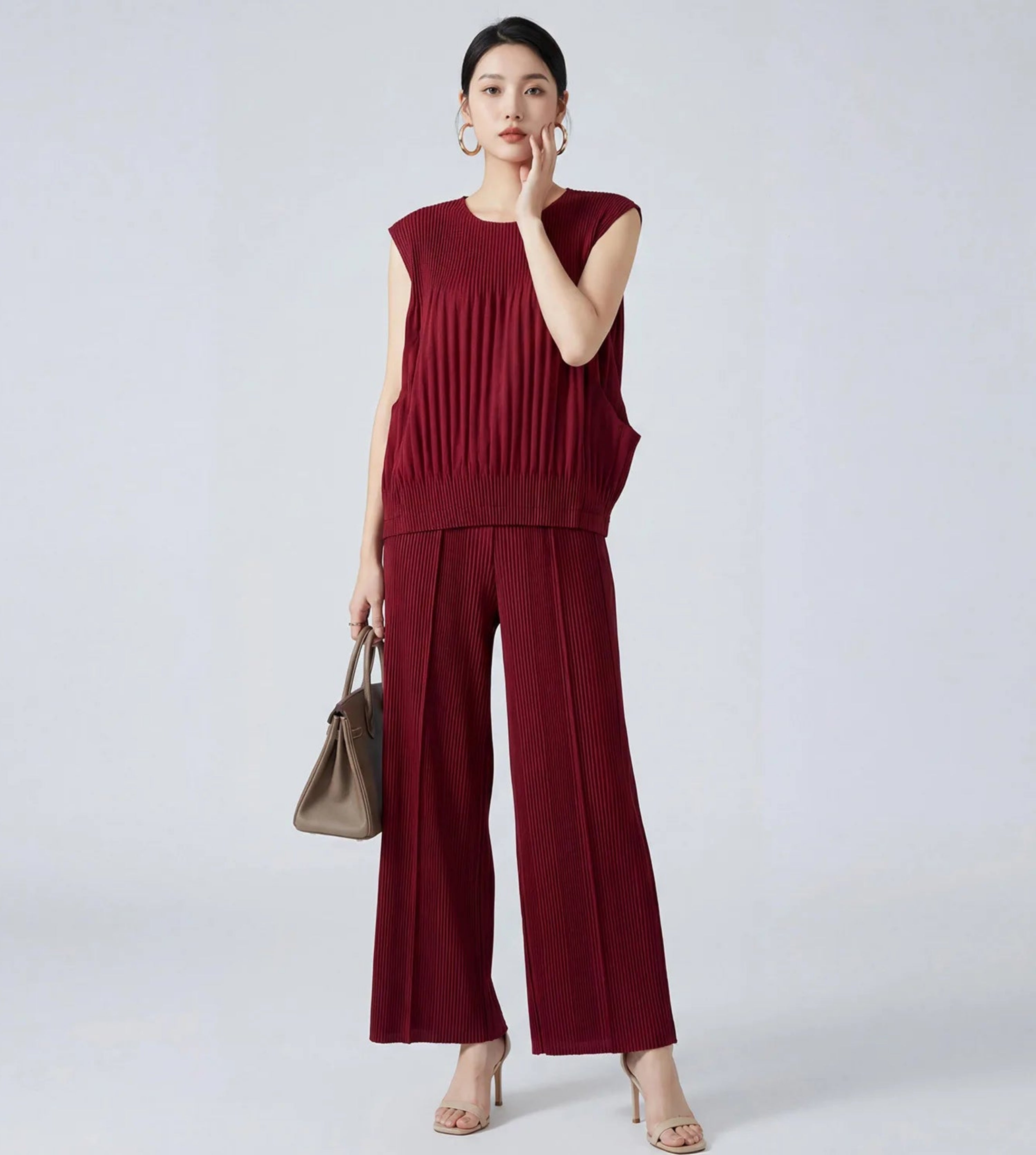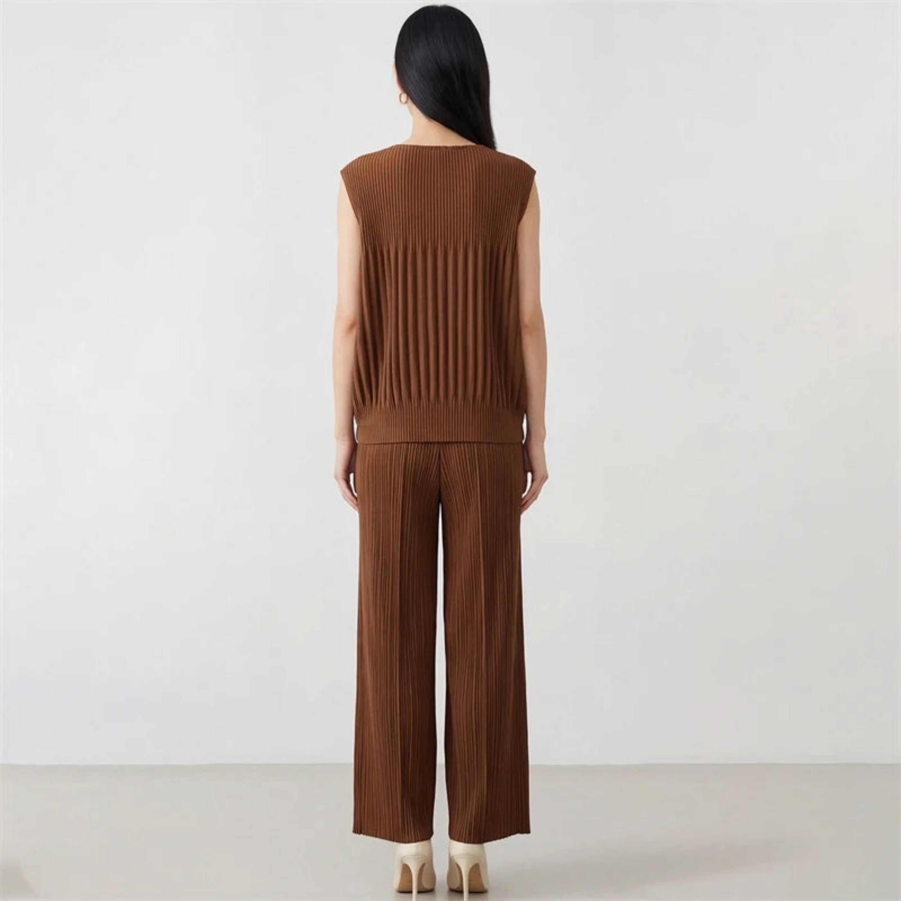 Elegant 2-piece Japanese plissé set featuring a sleeveless top and wide-leg pleated pants.