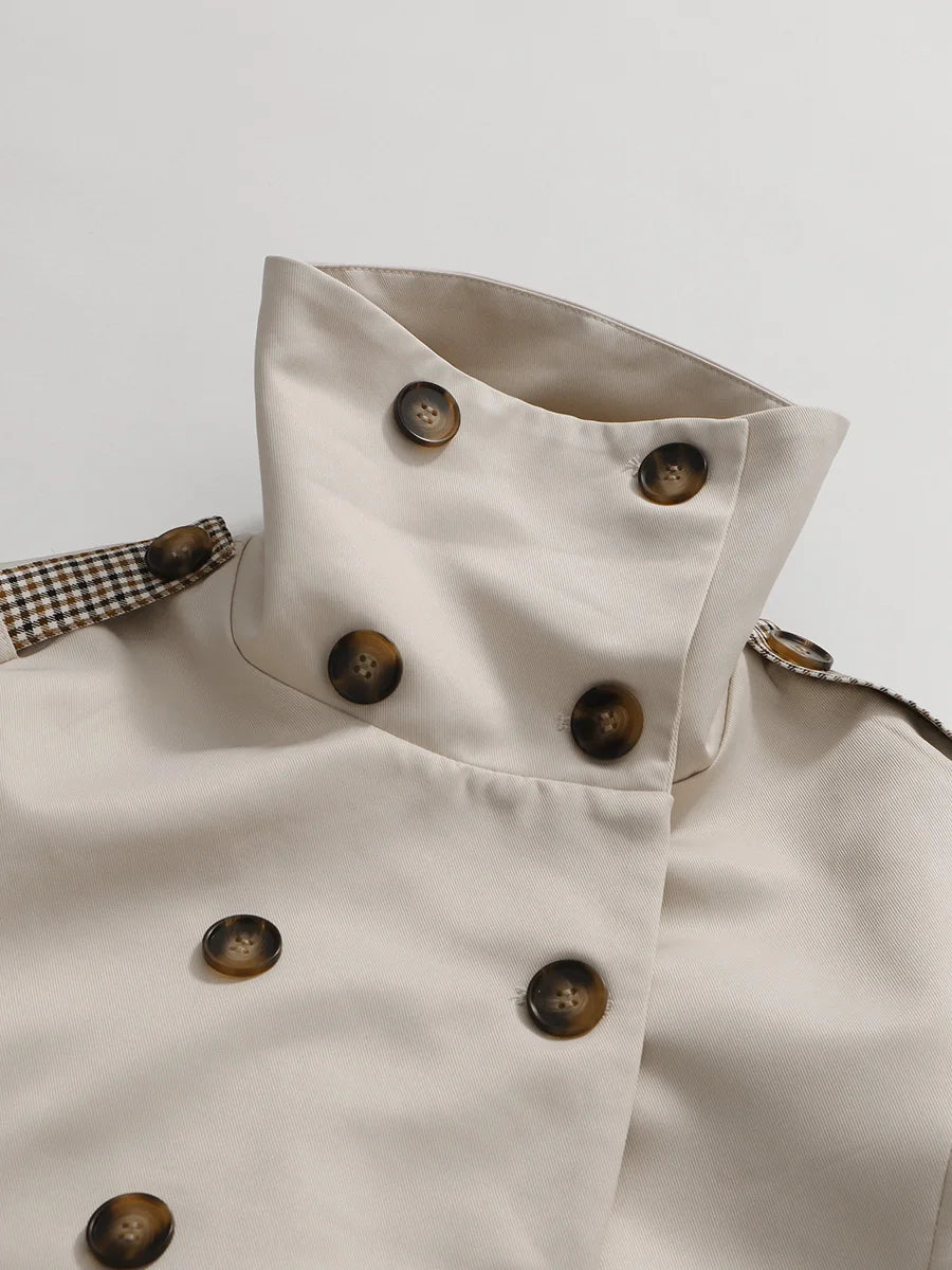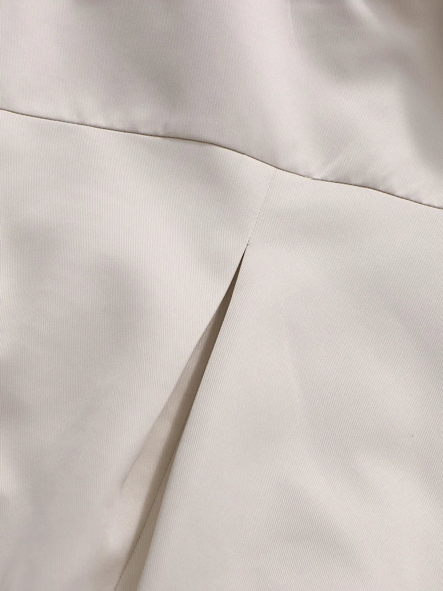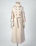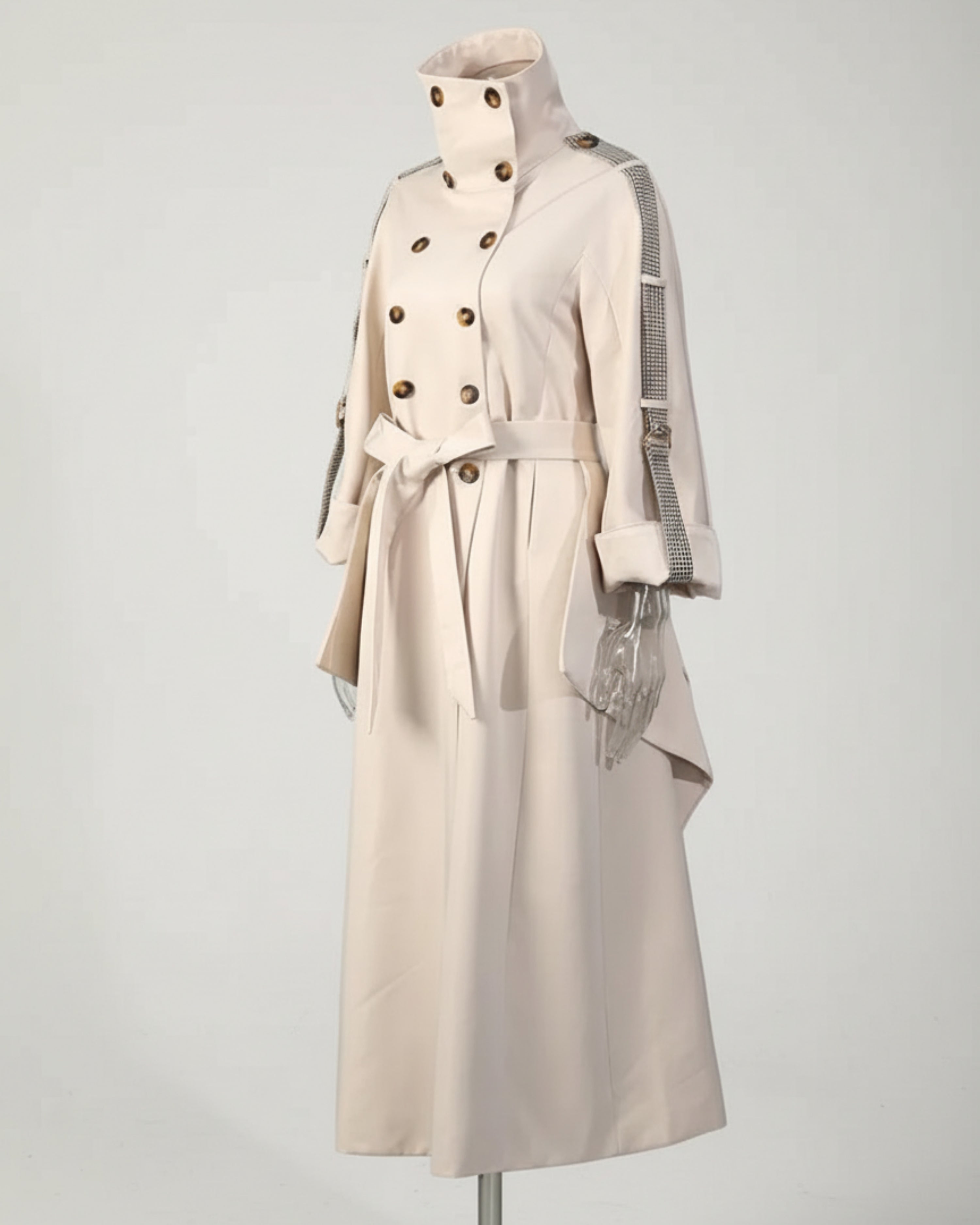 This double-breasted trench coat features an asymmetrical ruffle along the back, with a high collar and oversized cuffs for a distinctive, elegant profile.