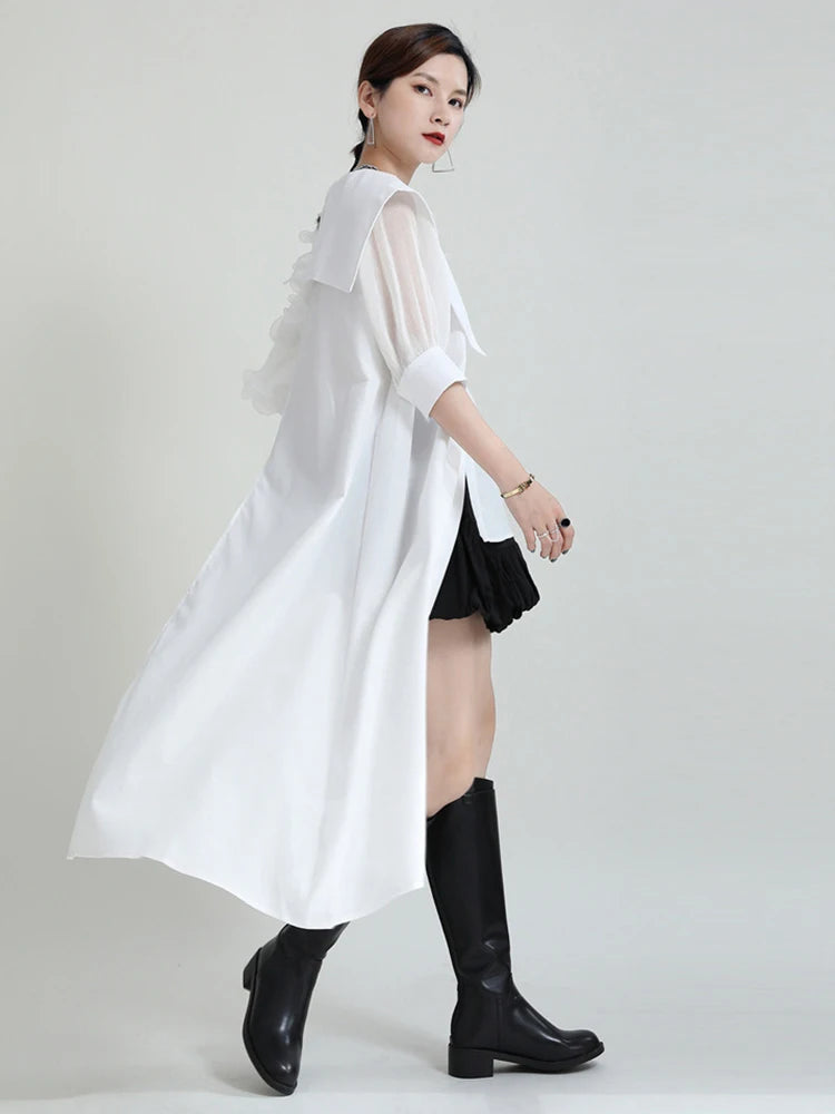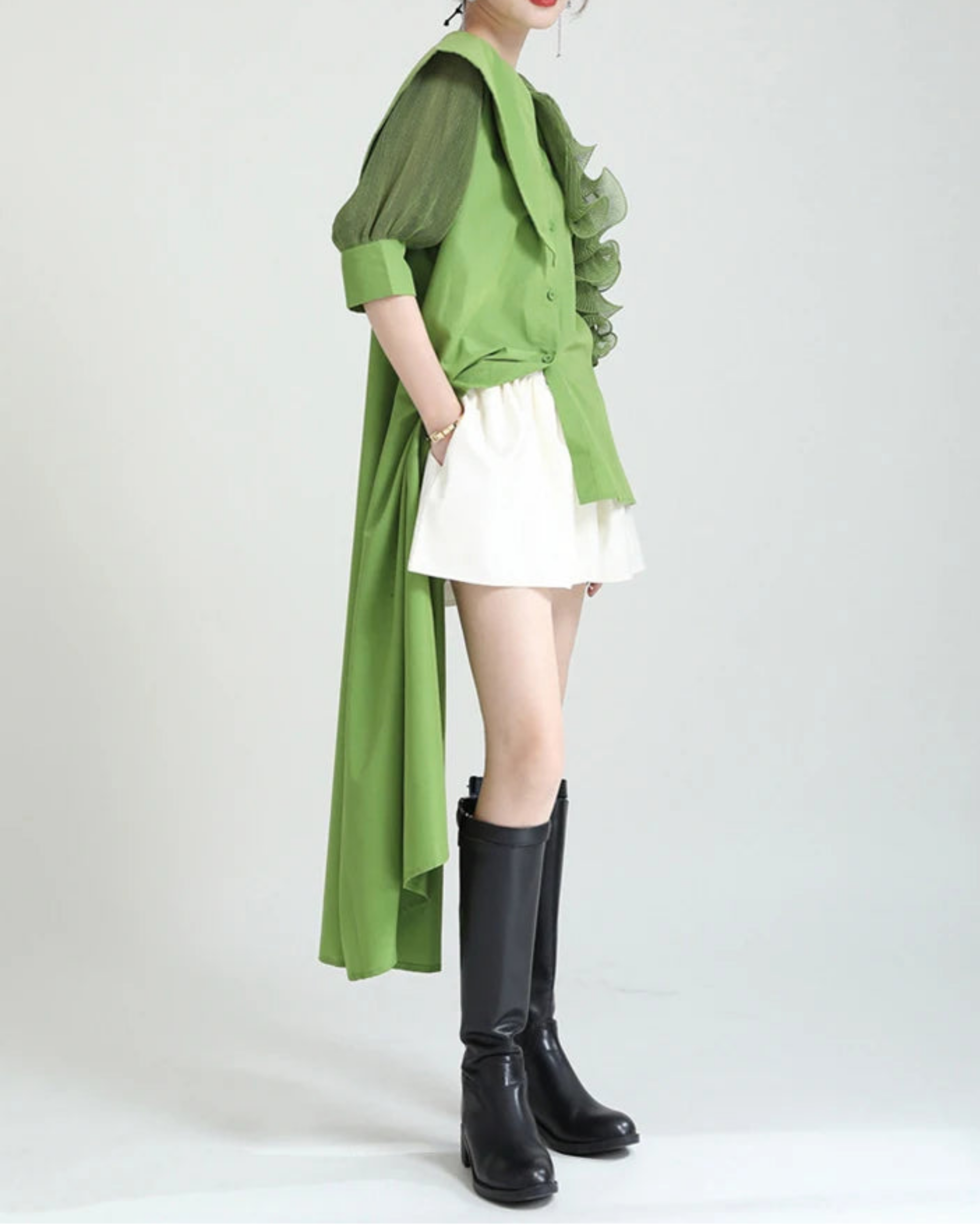 Avant-garde pleated asymmetrical blouse for work, travel, and formal wear. High-low tunic with half sleeves and loose fit drapes elegantly.