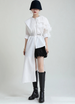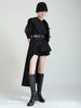 Dramatic pleated ruffle on one shoulder adds a sculptural effect. Transparent belt with circular buckle cinches the waist. Irregular hem flows from above the thigh to below the knee for a striking silhouette.